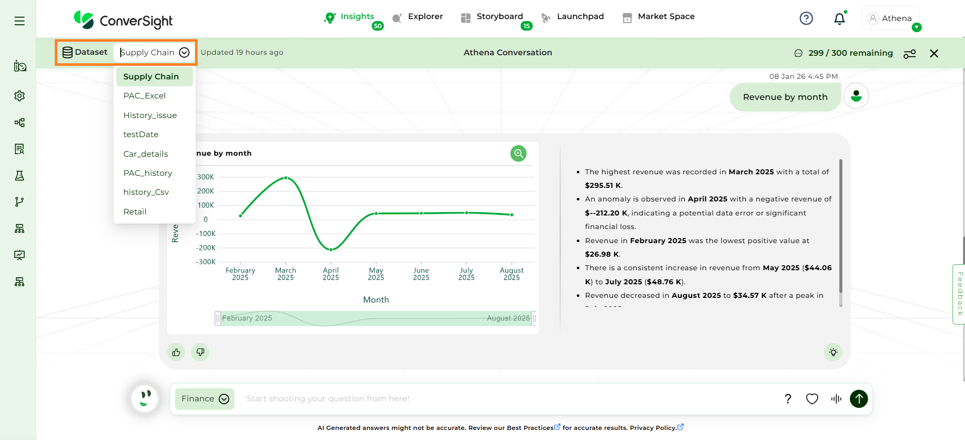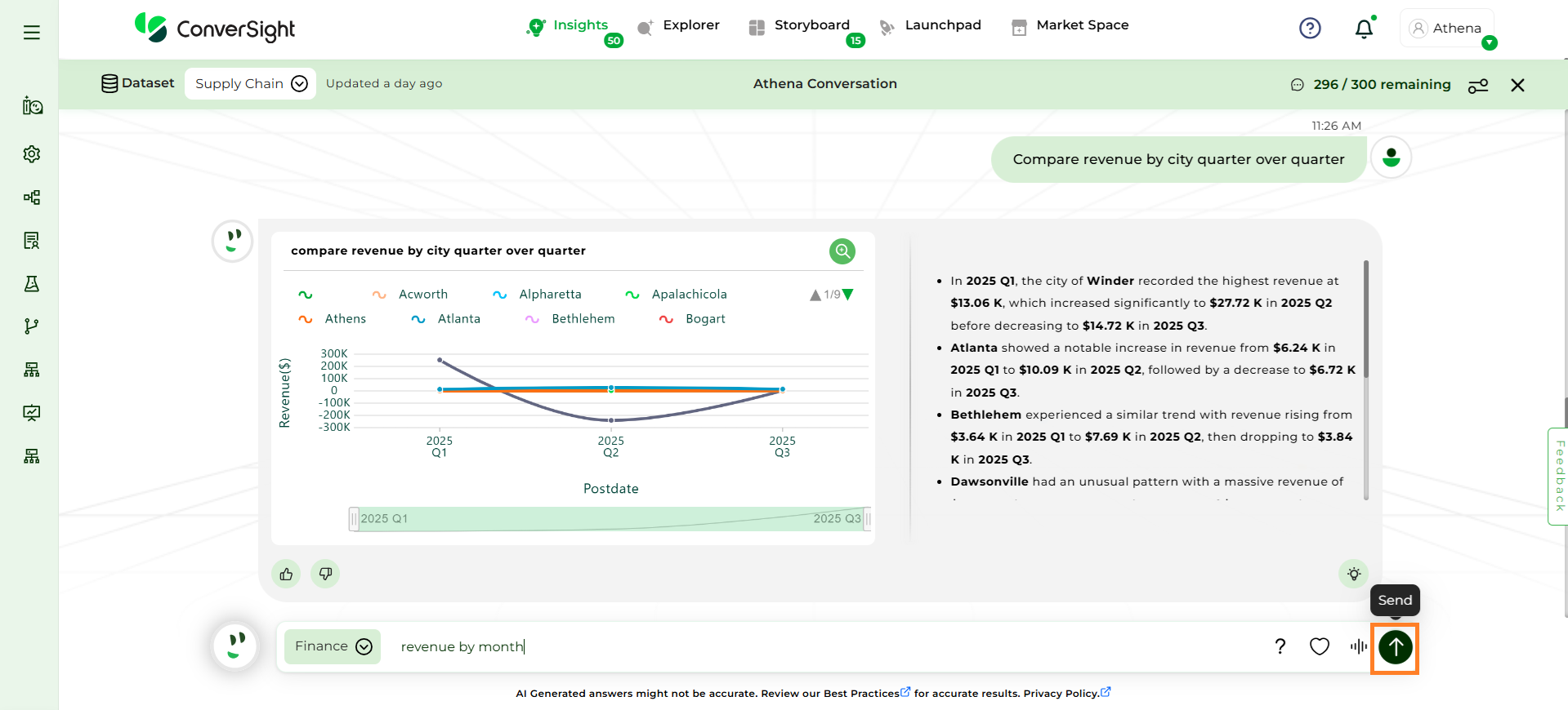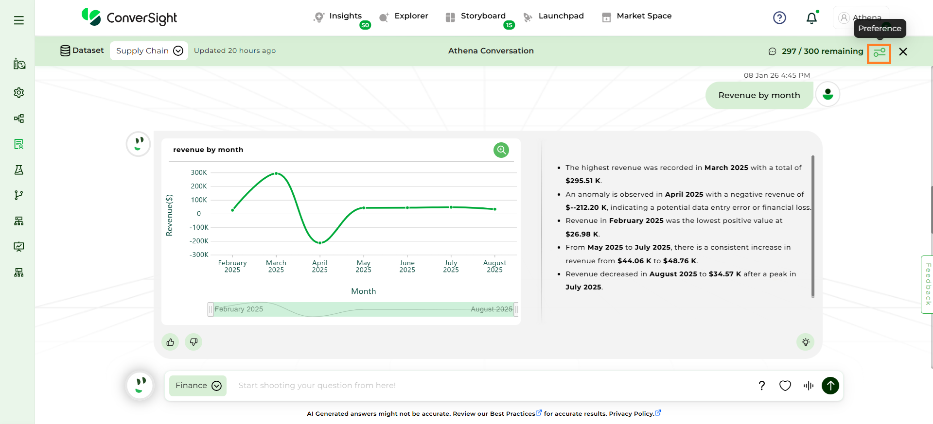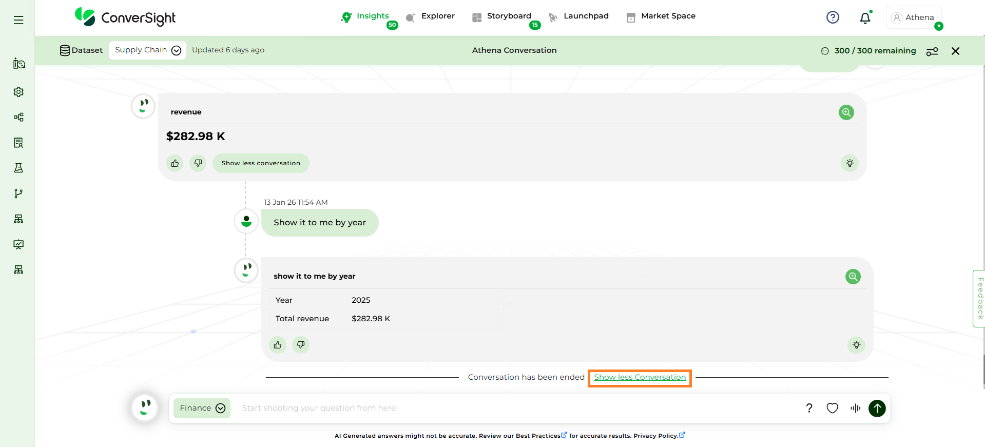 Focus on Domain-Specific Queries: Athena is optimized for questions related to the domain or business area you have selected. Ensure that your queries are specific to this chosen domain for accurate results.