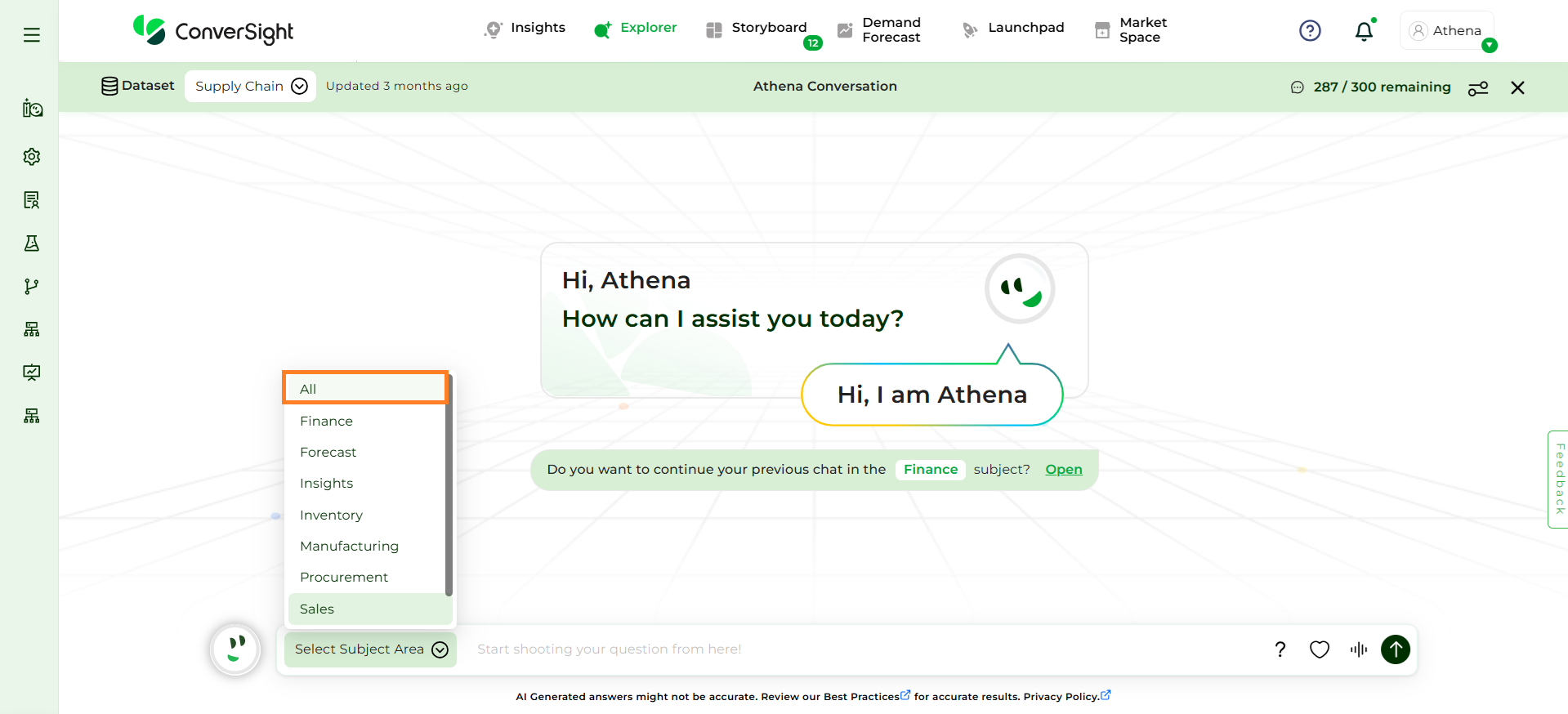 Step 2: Select the relevant Subject Area in which you want to ask queries. This helps Athena focus on the appropriate context and improves the accuracy of the responses. To learn more about Subject Areas, Click Here.