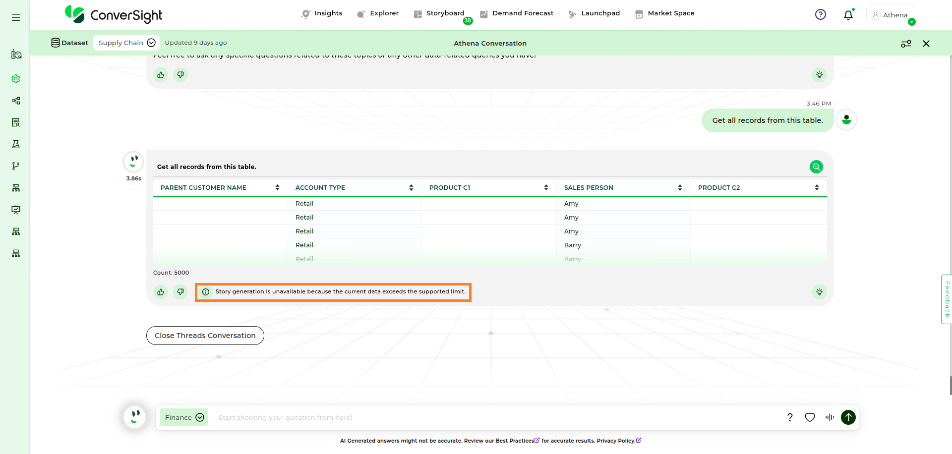 Once you ask a question in Athena and receive a response, the next interaction is a threaded conversation. If you do not wish to continue, you can close the thread by clicking the Close Conversation button.