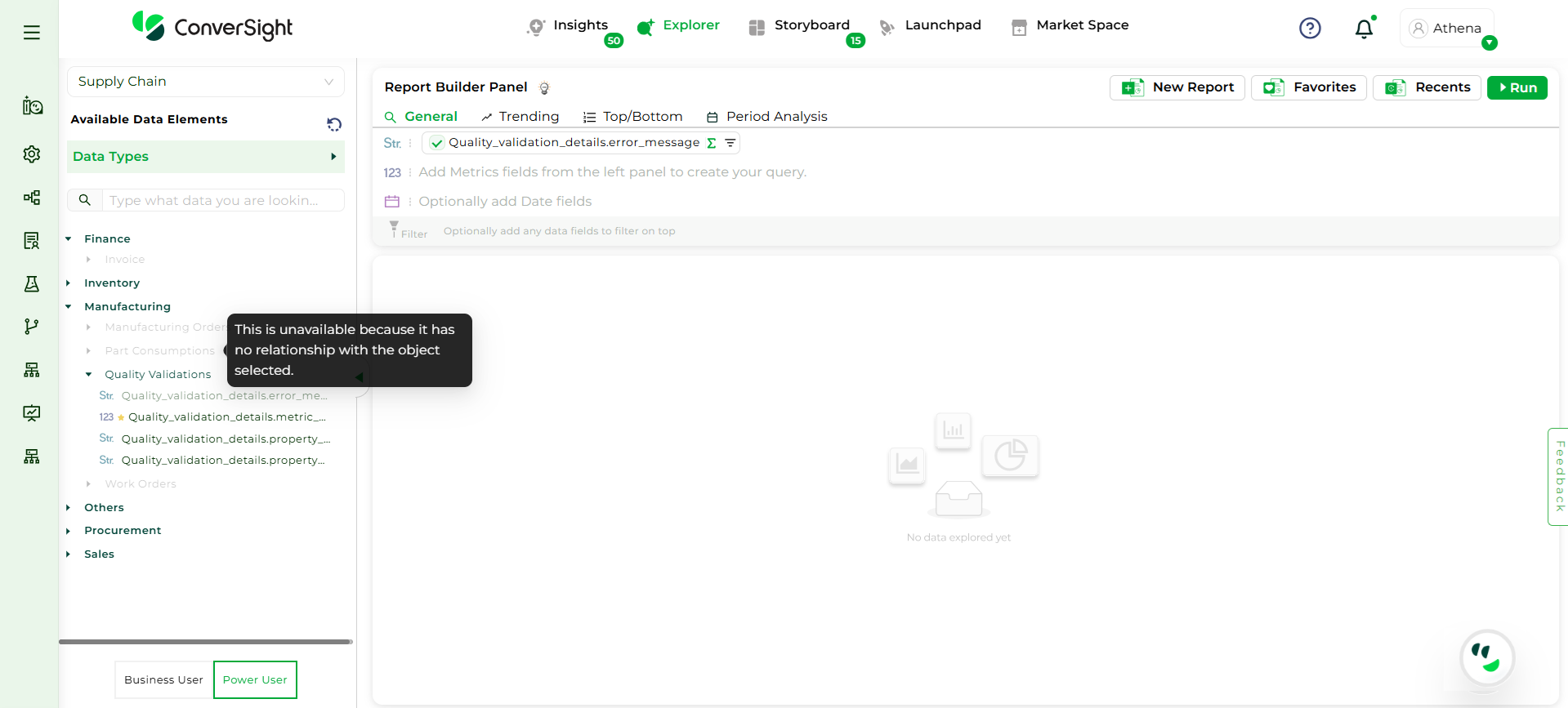 In the Explorer tab, the Business User toggle is designed for users who need simplified access to data relevant to their role, such as sales or procurement and focuses on subject areas that make it easier for them to navigate without needing extensive knowledge of the data structure. On the other hand, Power Users, like data scientists or analysts, need to work with larger datasets across all tables and perform more complex analysis. The toggle allows Power Users to access all data in one view for full exploratory analysis, but they must be familiar with the underlying data architecture to perform cross-table reporting.