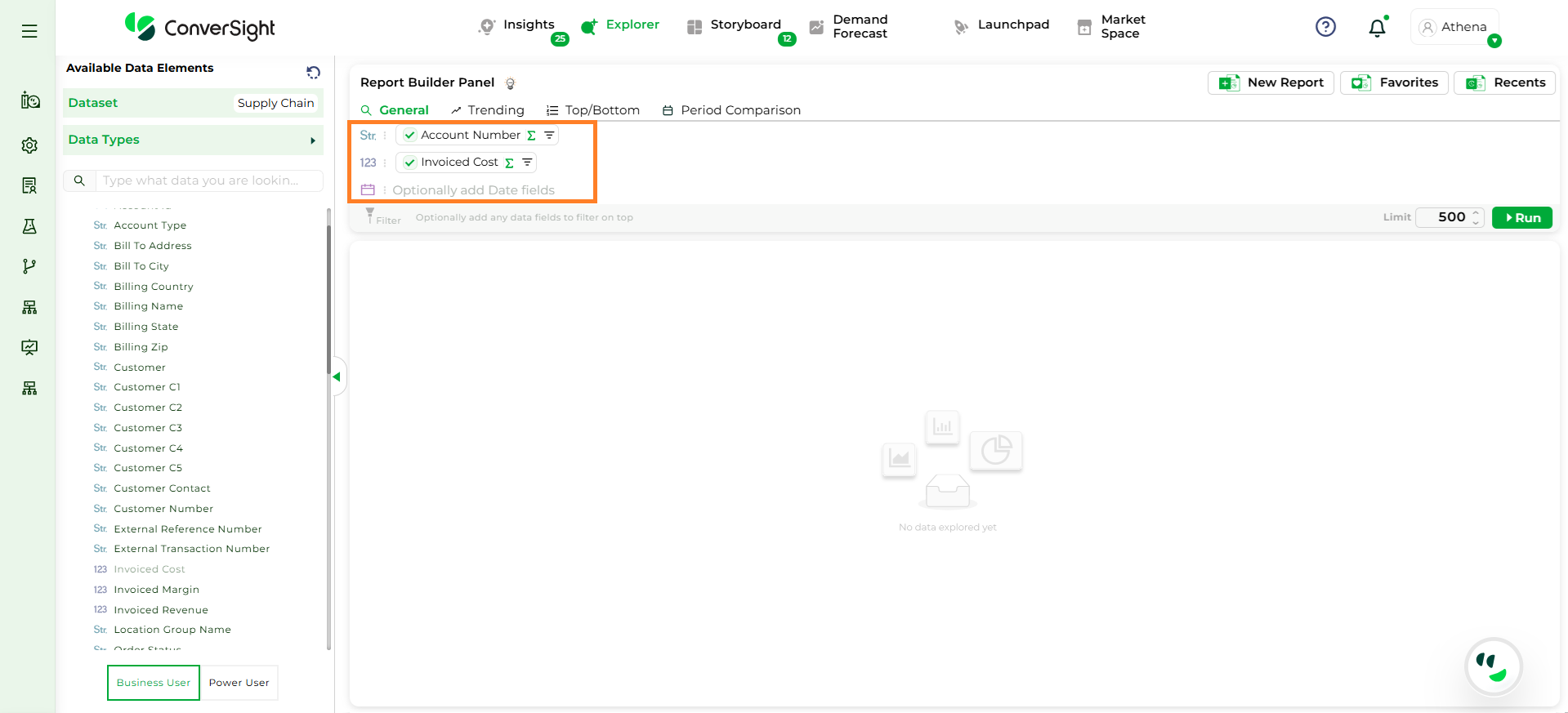 Step 3: To configure the query, select At Least One Dimension and Metric column to enable the Run button. The first metric column selected becomes the primary column for the query. The Date dropdown is set to None by default.