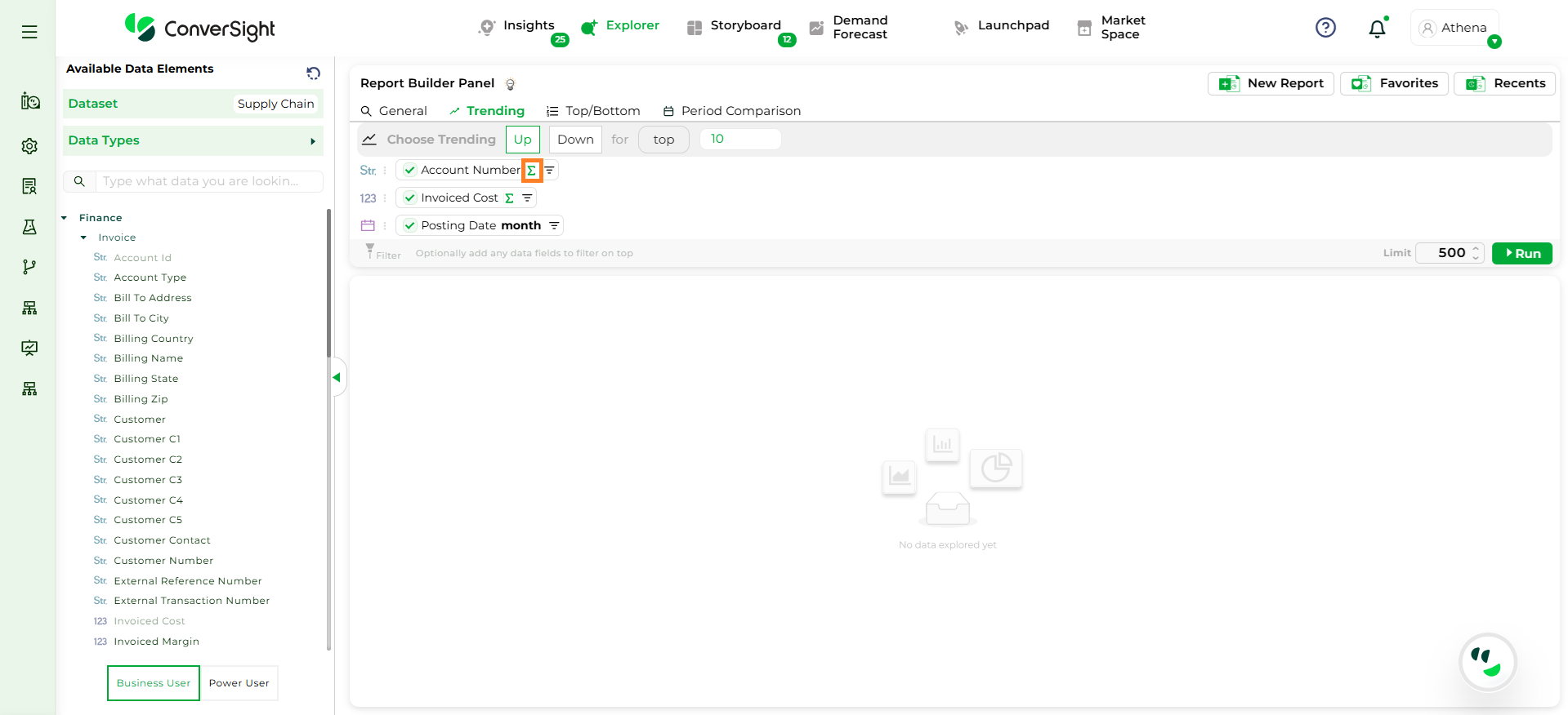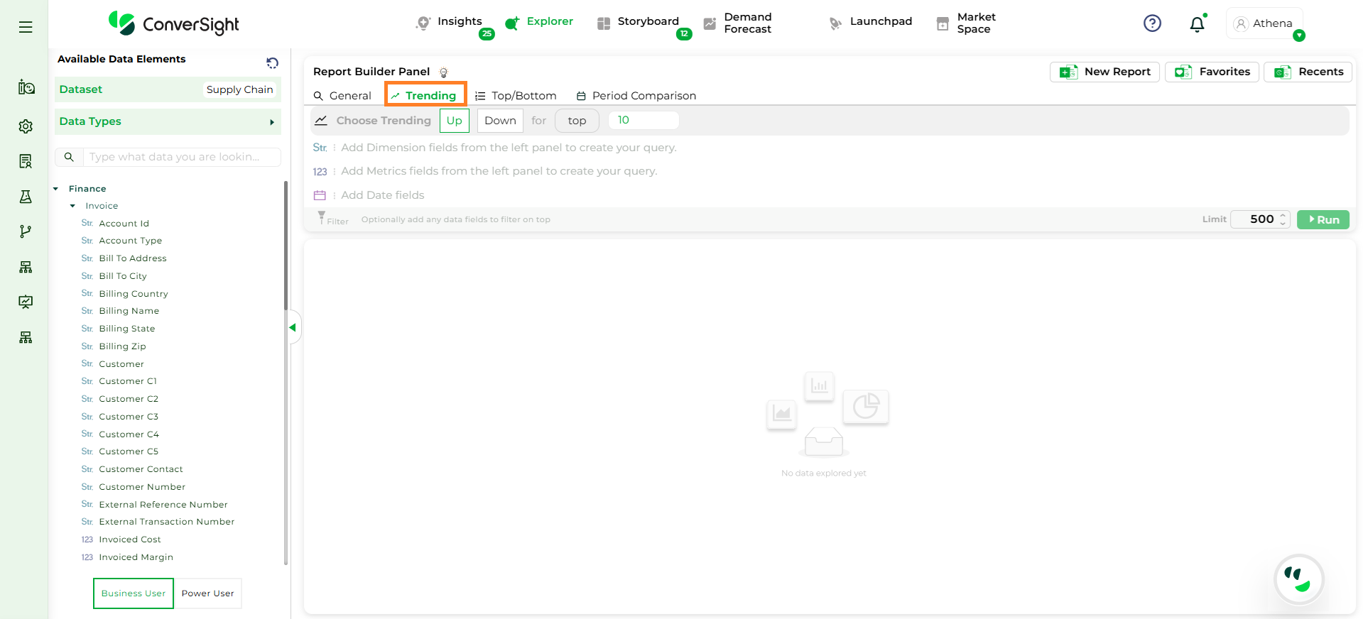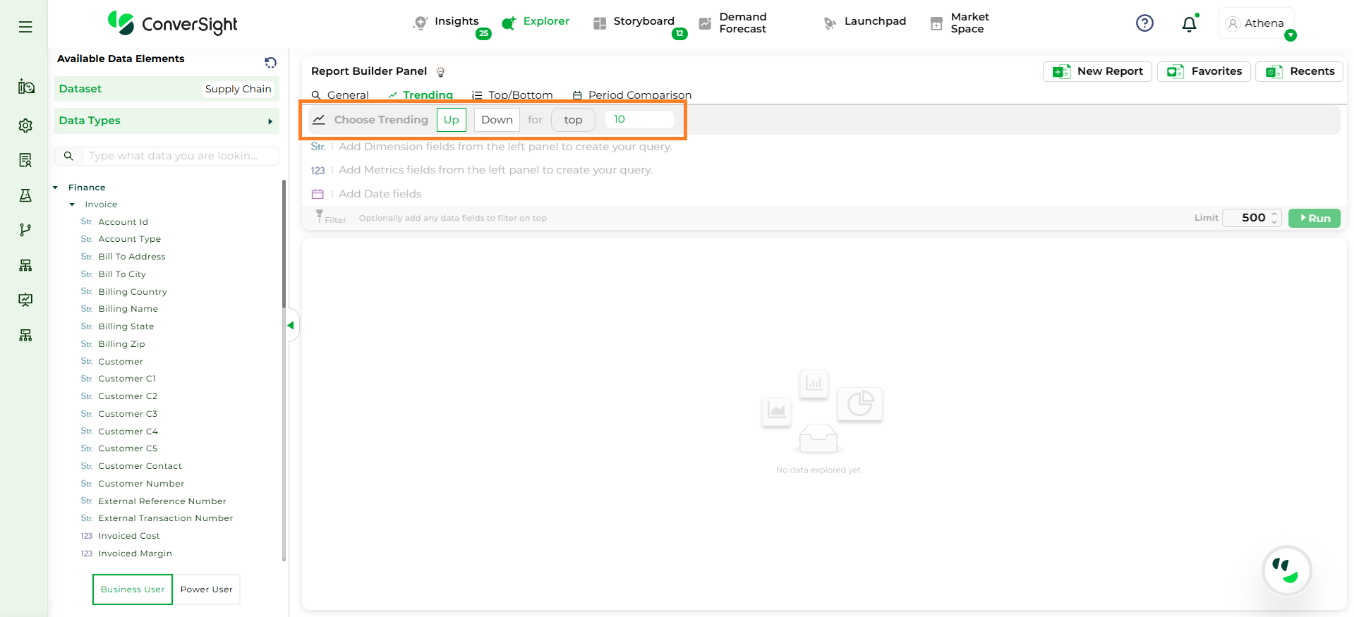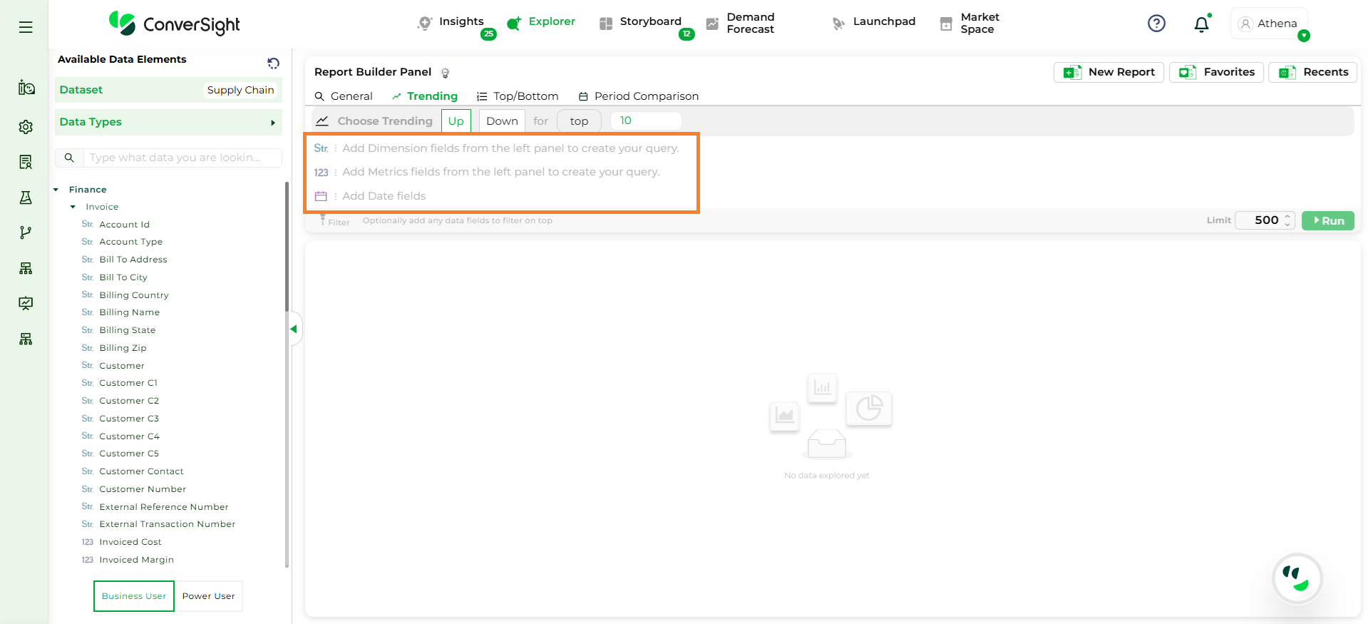 Step 3: To configure a Trending Query, you must select, One Metric column (e.g., Sales), One Dimension column (e.g., Product) and One Date column (e.g., Order Date).