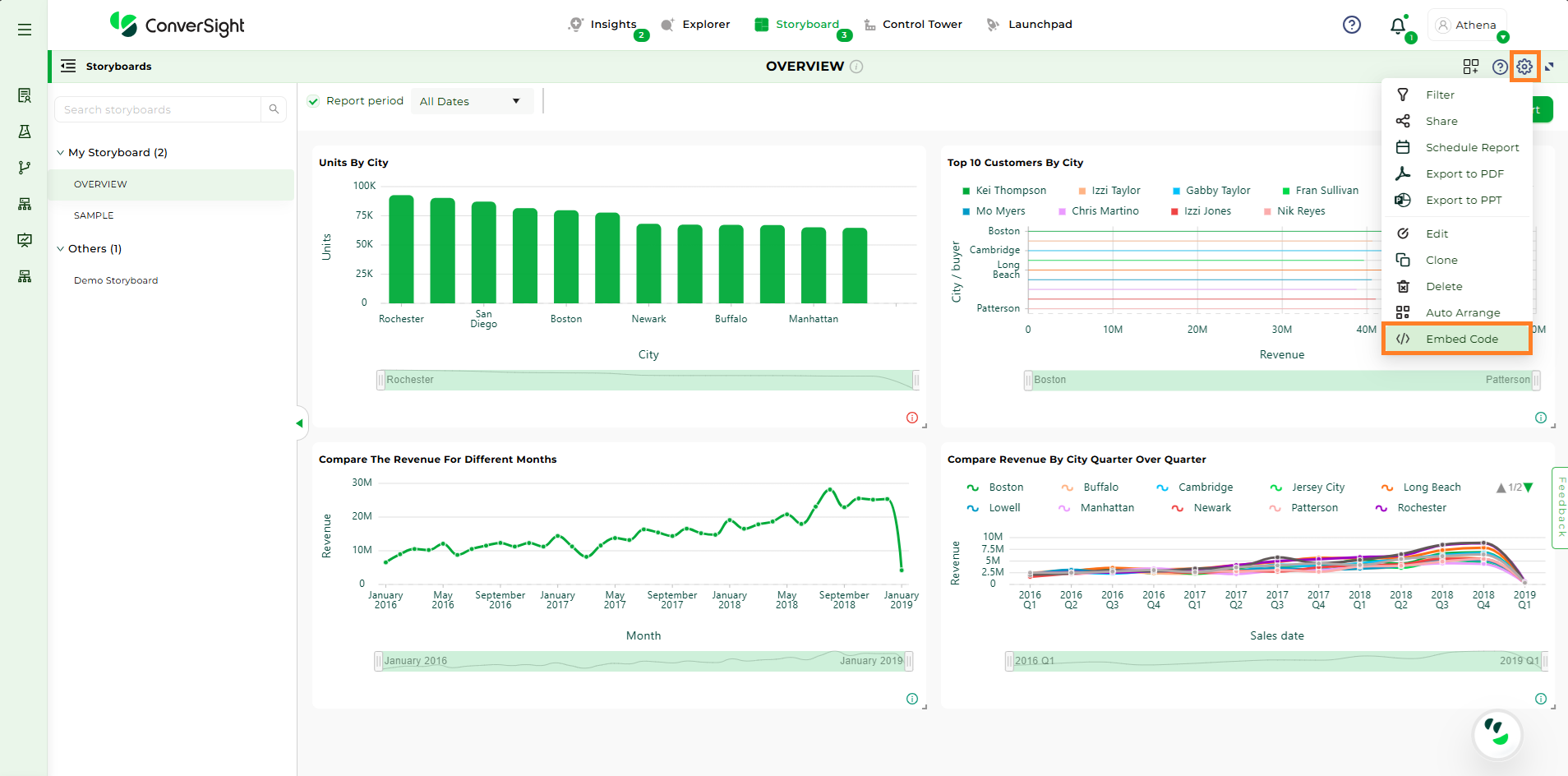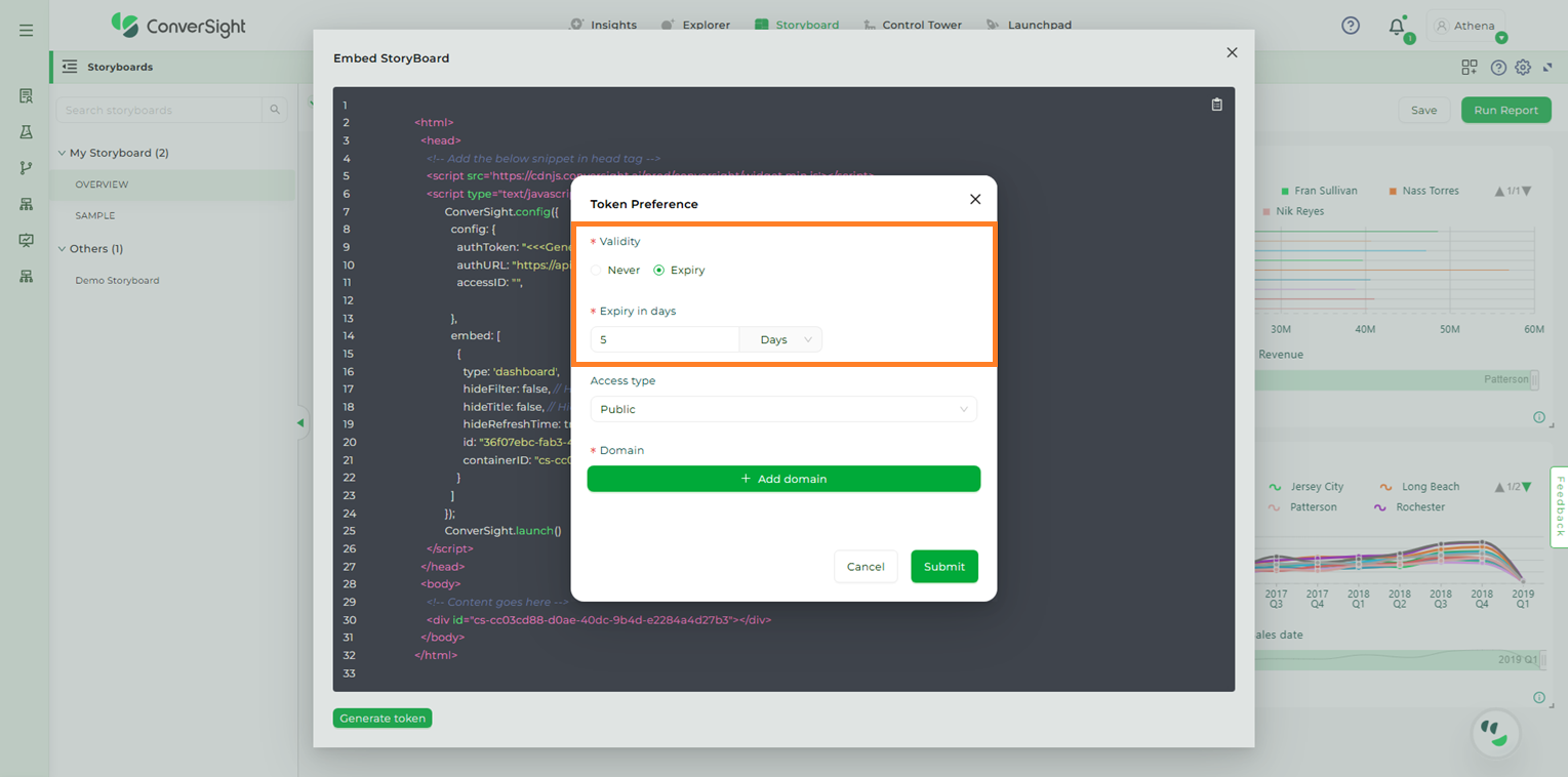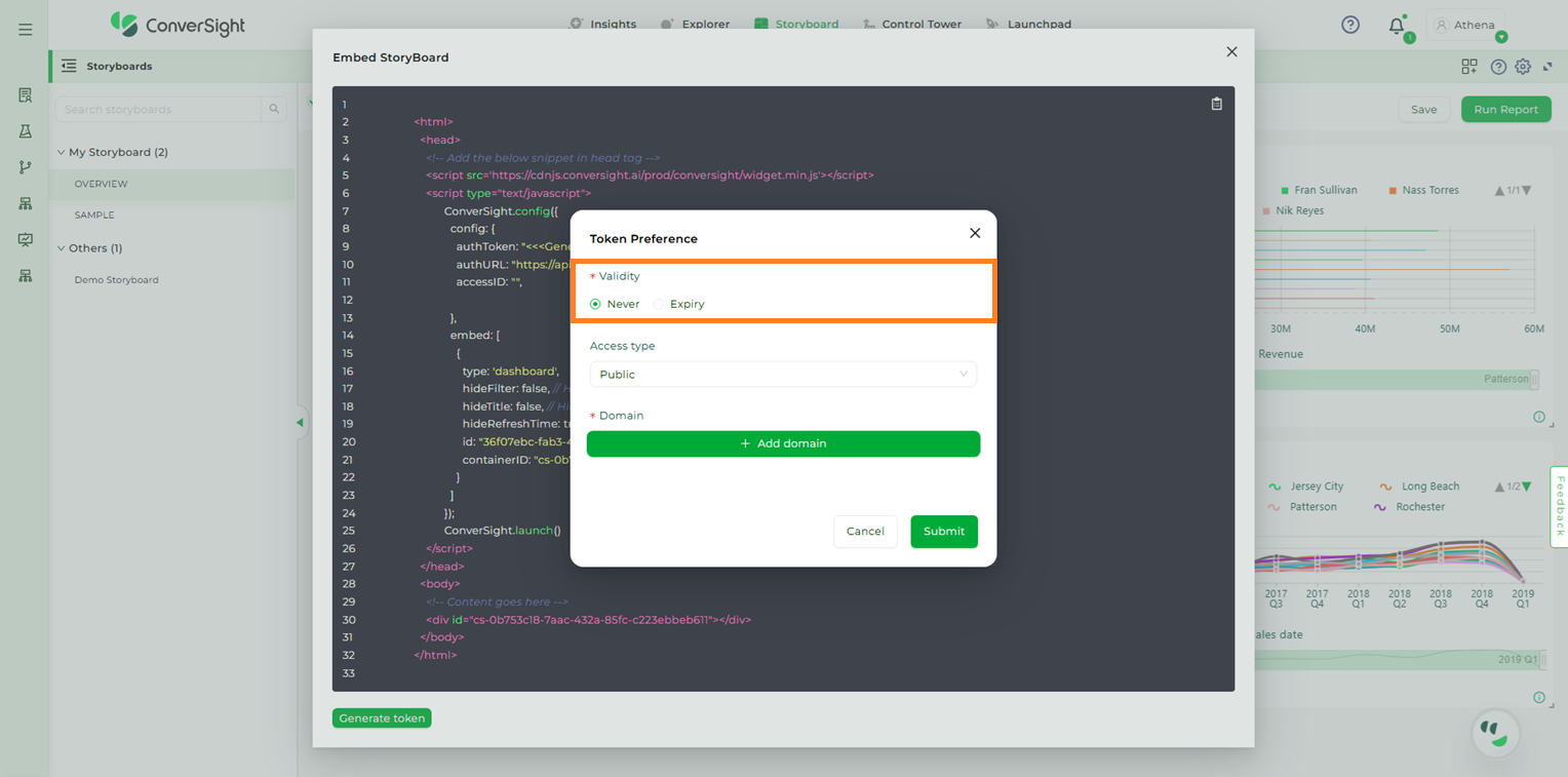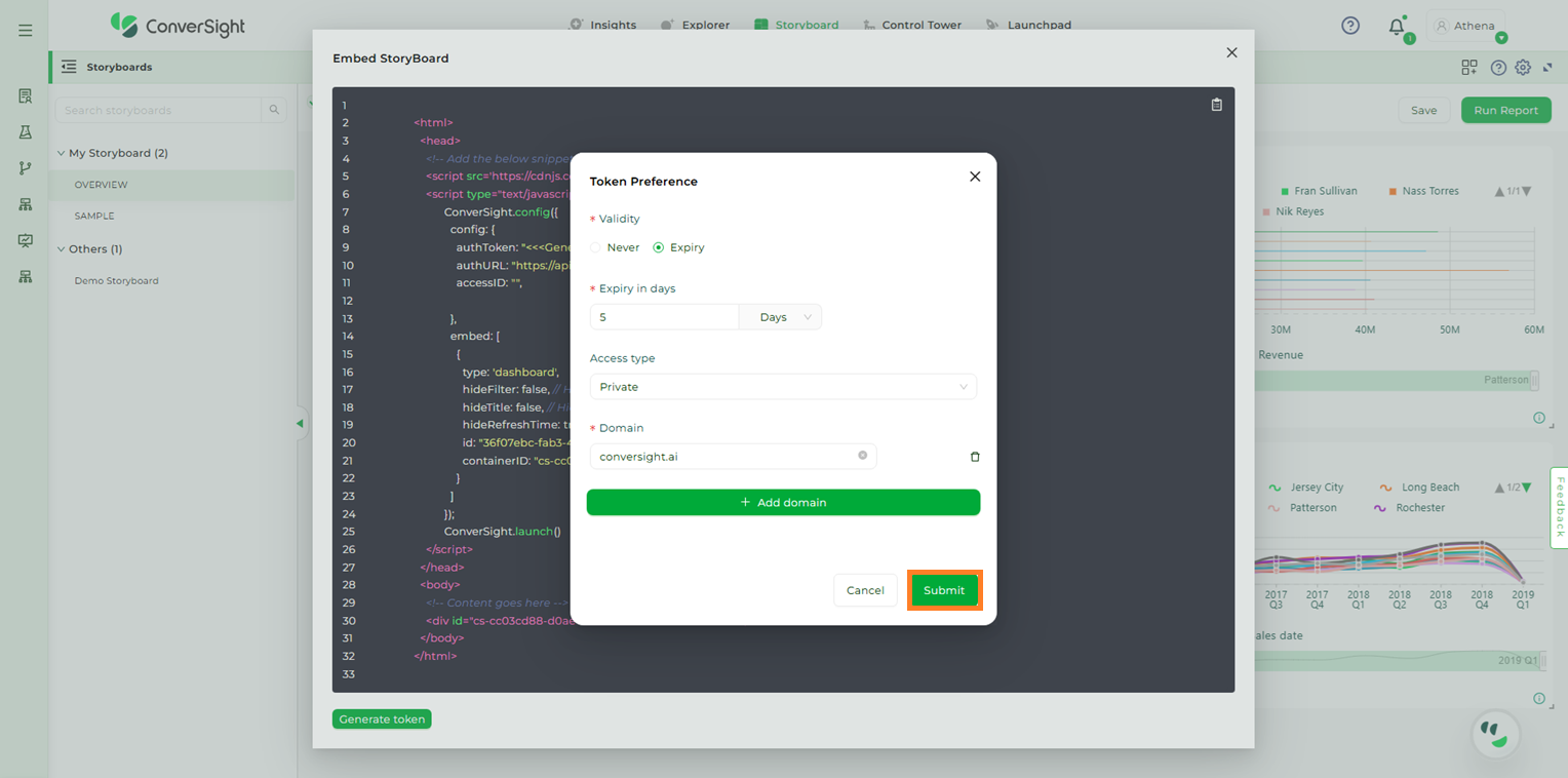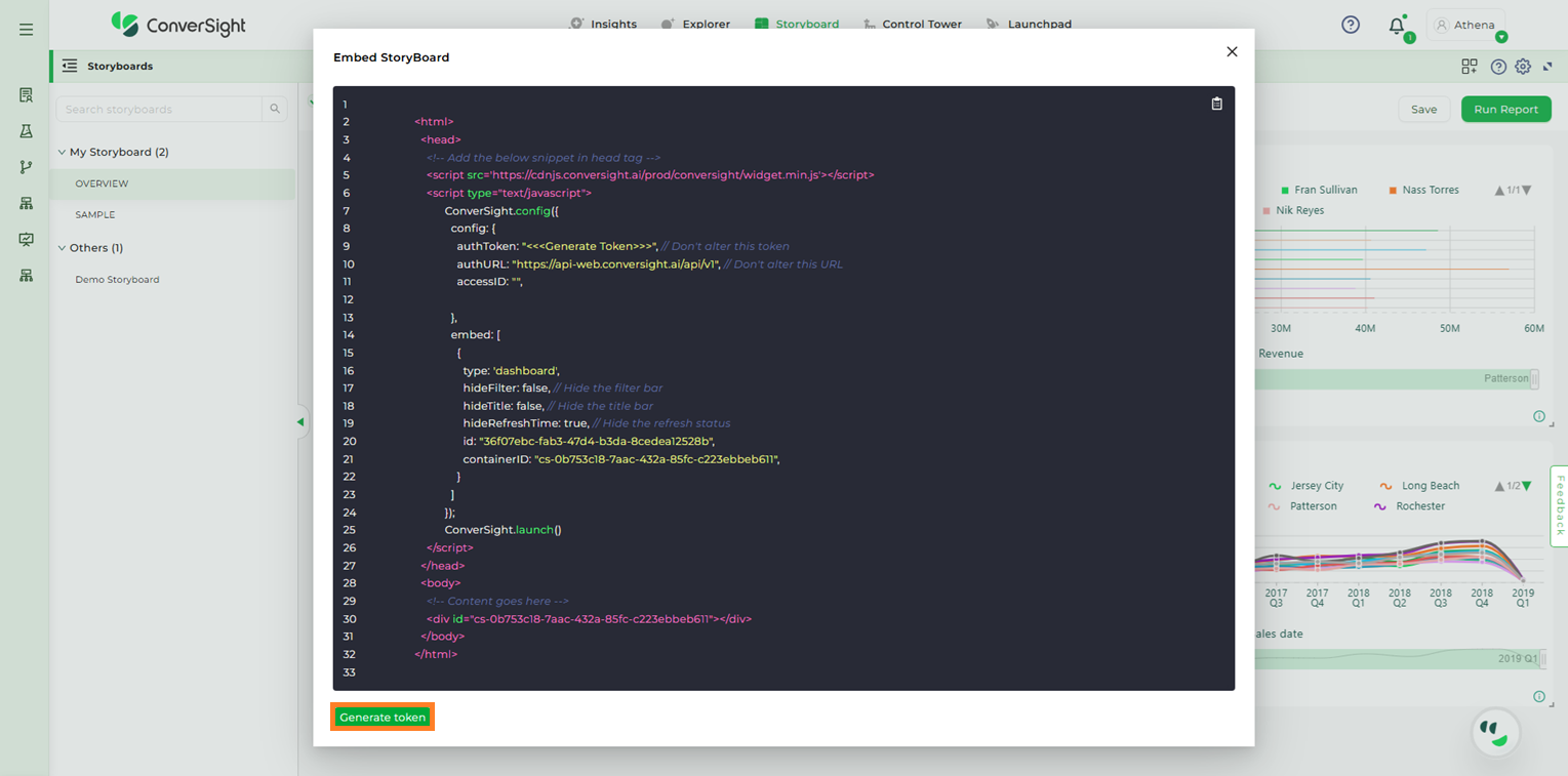 The Embed Storyboard feature proves highly beneficial in scenarios where an organization’s members prefer to utilize Athena within their own applications instead of accessing the ConverSight platform directly. By utilizing this feature, users can apply filters to restrict access, tailoring it to specific users and allowing them to conveniently access data from any location. This demonstrates their resourcefulness and problem-solving abilities in overcoming challenges.