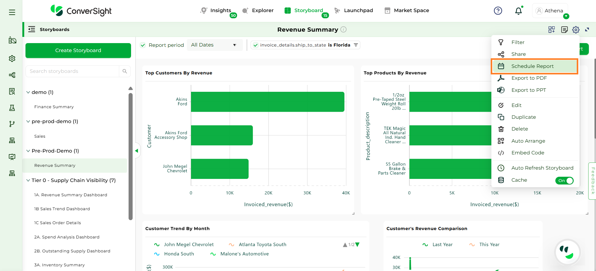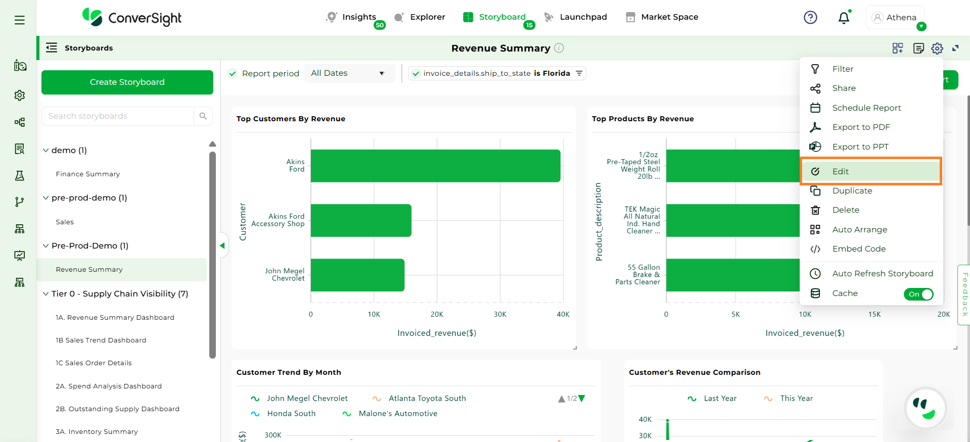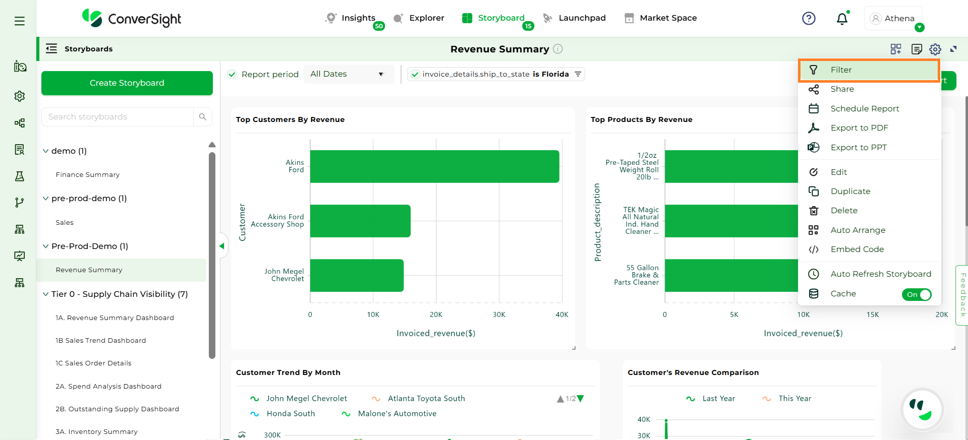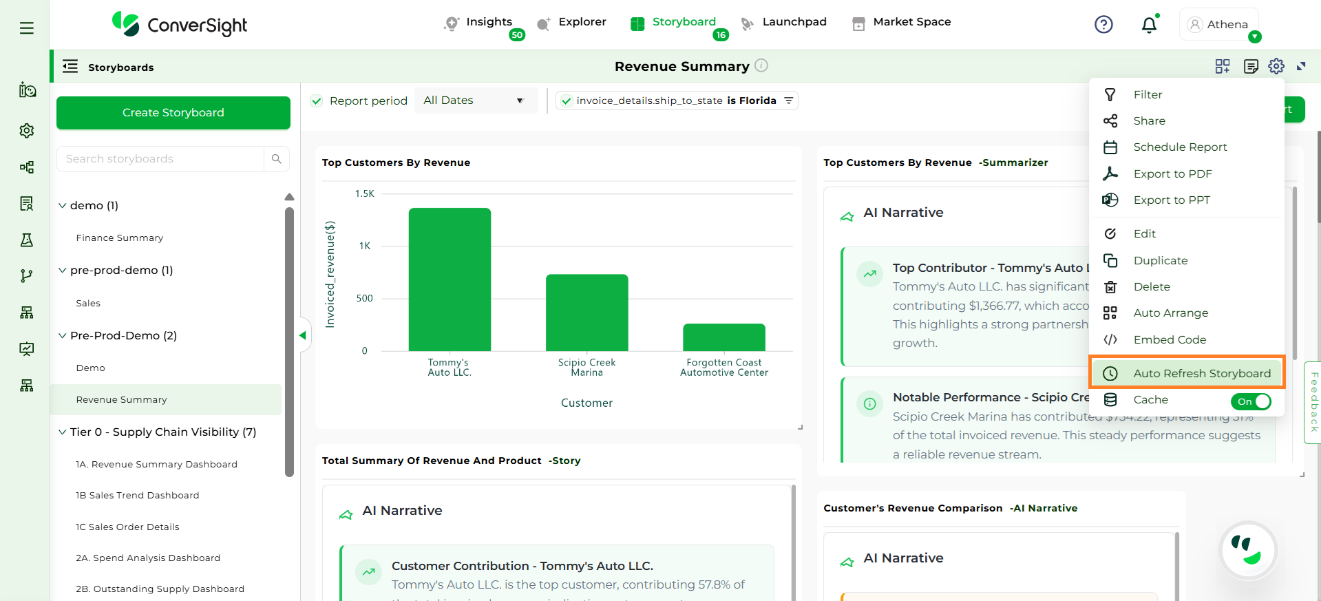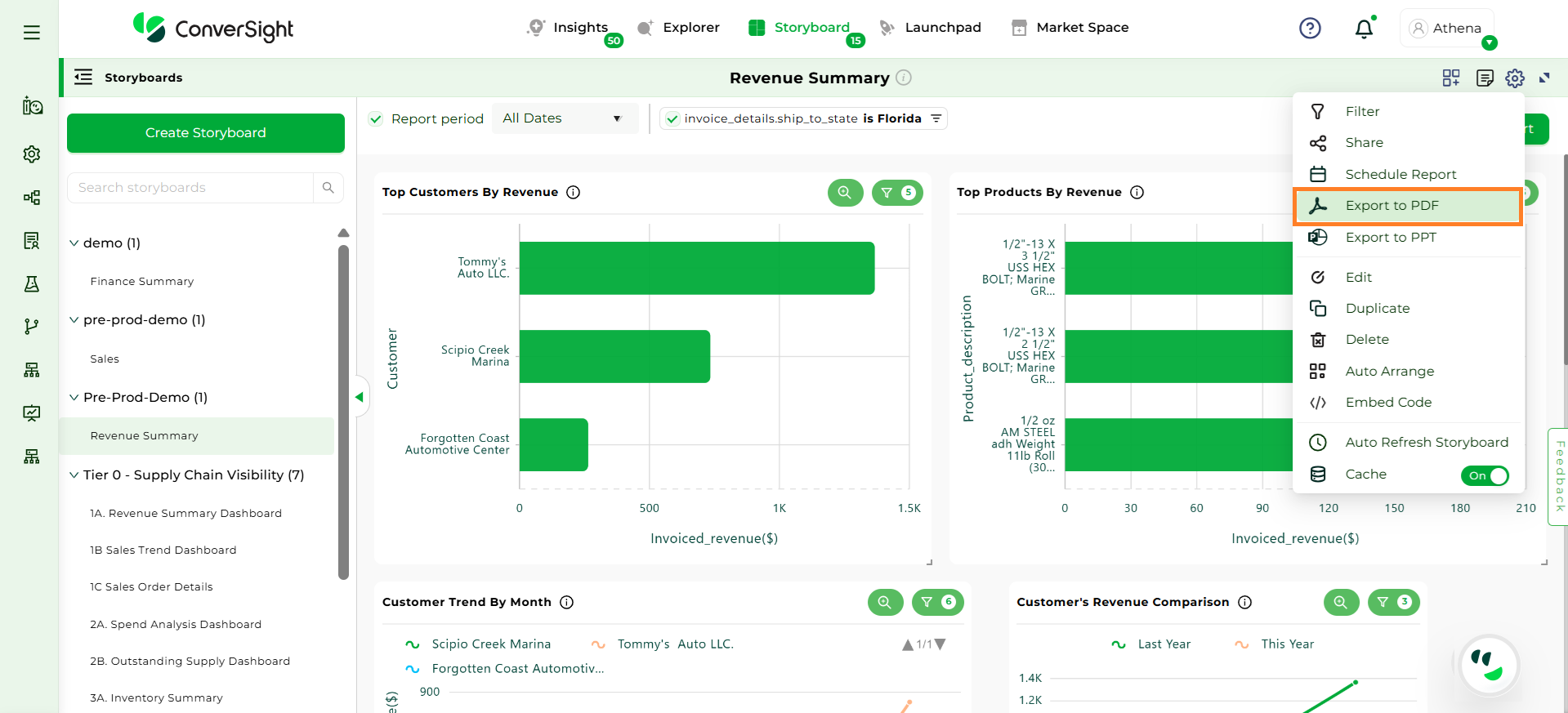Click on Settings icon and select the Export to PDF option. In ConverSight, you can download the entire Storyboard in PDF format, so you can share it with people inside and outside your organization.