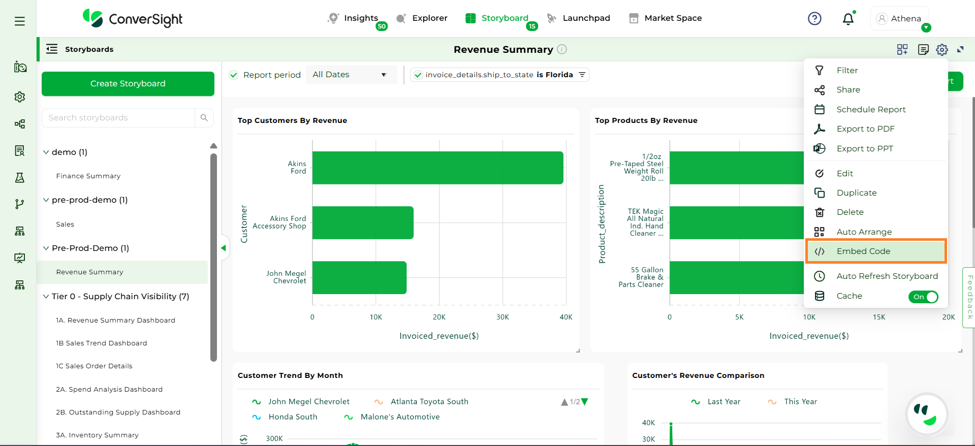 The Embed Code feature allows users to seamlessly integrate visual storyboards into internal or external applications. This enables users to access real-time insights directly within their own applications, without needing to log into the ConverSight platform. Organizations can apply filters and permissions to ensure that each embedded storyboard is securely tailored to the intended audience, making it easier to deliver data-driven narratives across departments or client-facing portals.