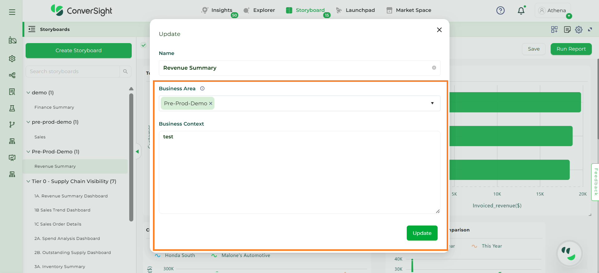 By clicking on the Edit icon, you can add a new Business Area to a storyboard. In addition to this, you can provide business context to give a clearer explanation. You can add more than one Business Area to the storyboard, allowing for a more detailed and organized presentation.