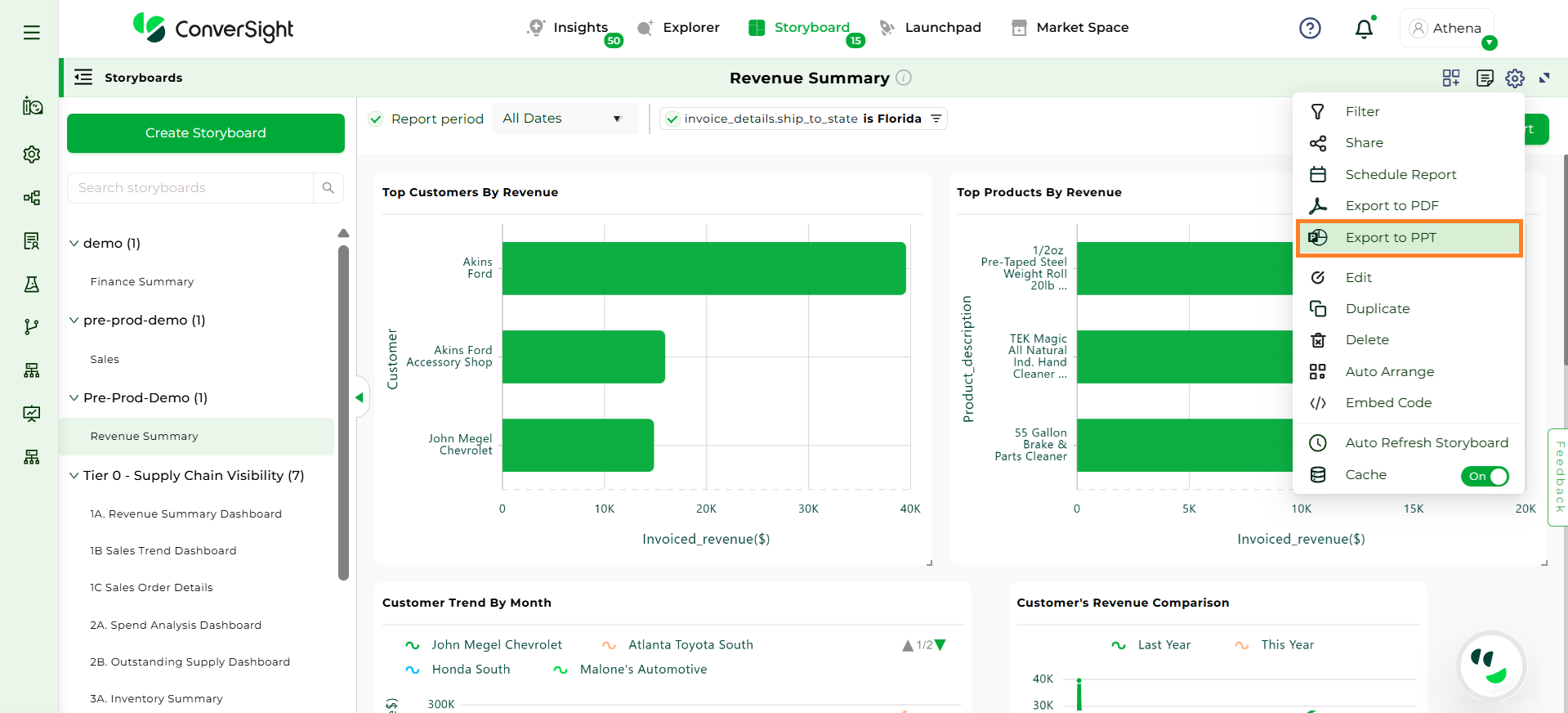 To generate a PowerPoint (PPT) version of your report, choose the specific storyboard and then click on the Export to PPT option. In ConverSight, you can download the entire Storyboard in PPT format, so you can share it with people inside and outside your organization.
