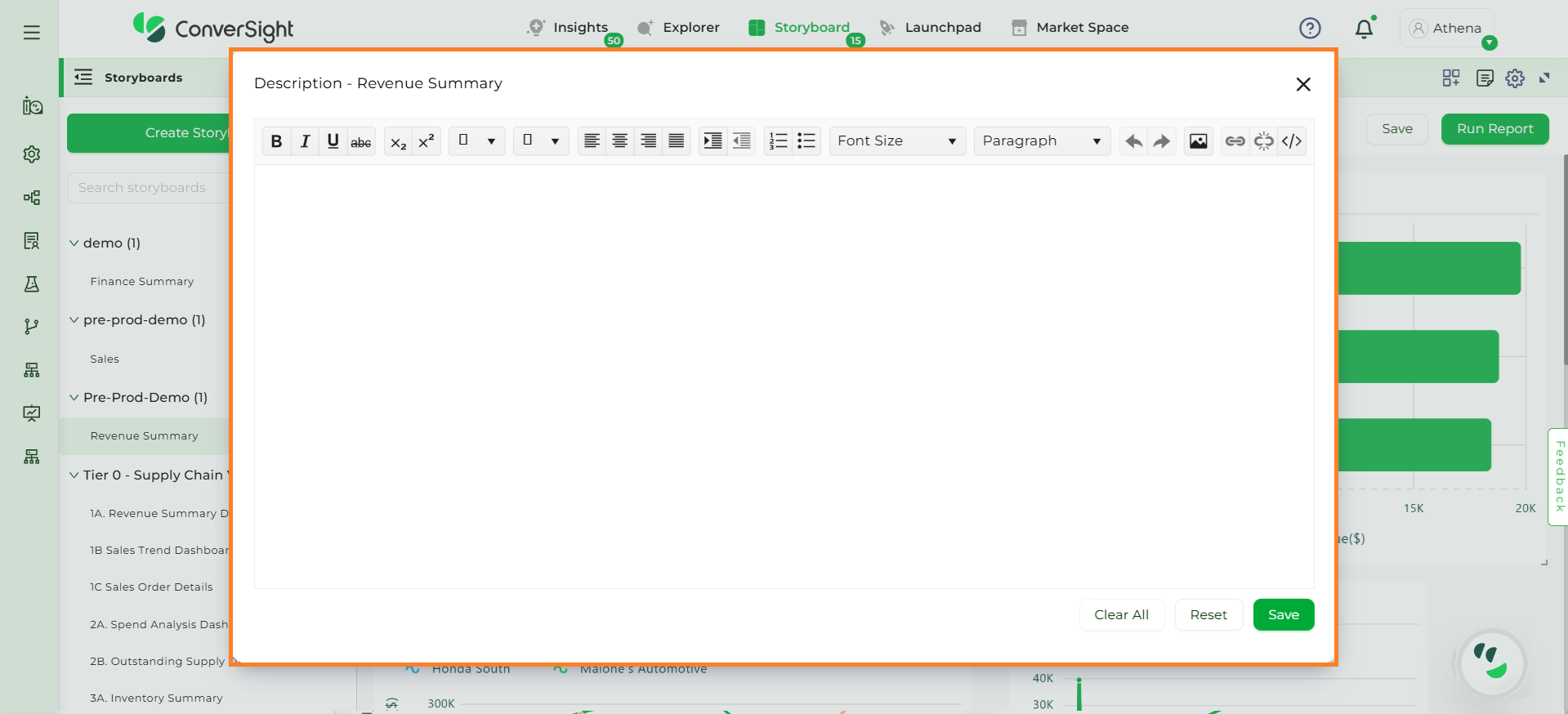 In conclusion, a Storyboard is your personalized canvas for data visualization and organization. It empowers you to effortlessly compile, access and showcase your charts, graphs and insights in a single, cohesive space. In a world inundated with data, Storyboards offer clarity and convenience, ensuring that your most critical insights are always at your fingertips, ready to inform and guide your decisions.
