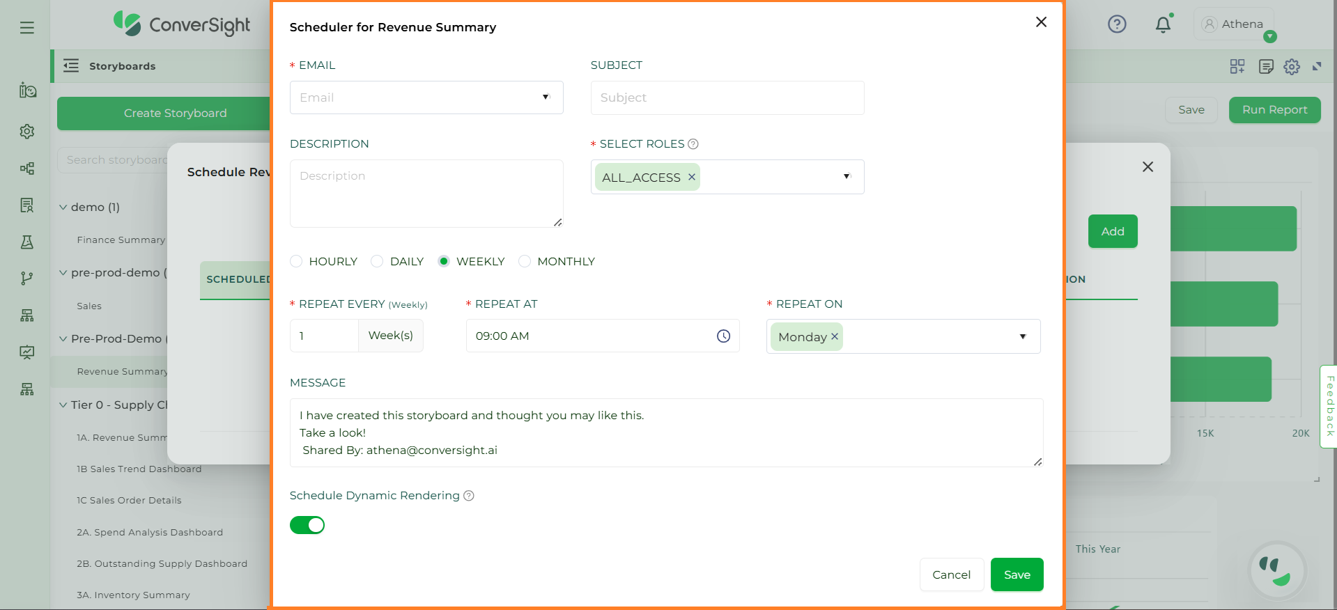 In the Scheduled Storyboard dialog box, you can add your email address as well as emails you would like to CC. You can set your schedule to daily or weekly and can also set your timings. Once you save your scheduled Storyboard, it will be sent to the recipient email with your set timings.