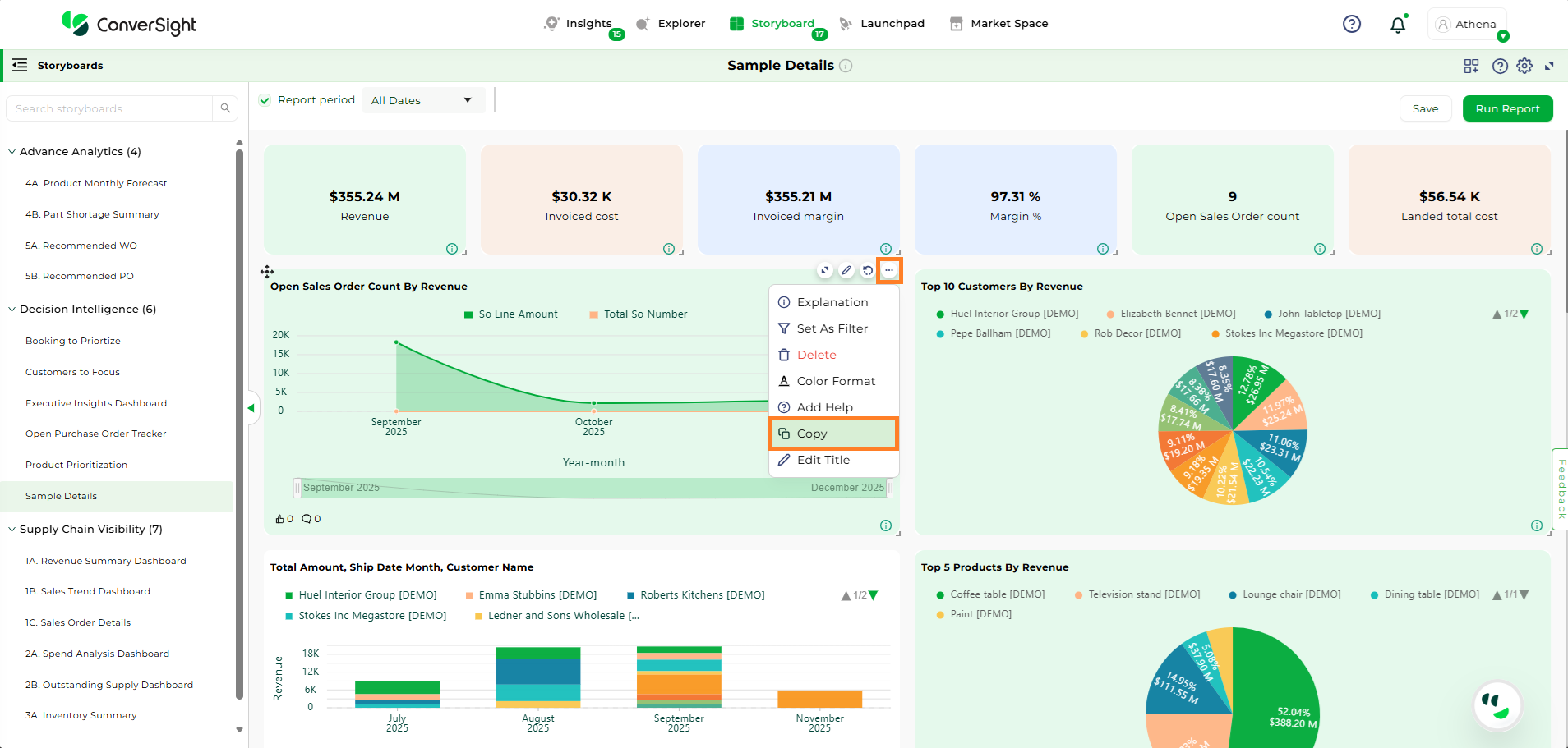 The Copy option allows users to duplicate an insight from one storyboard to another. After selecting the target storyboard, click Submit to complete the action.