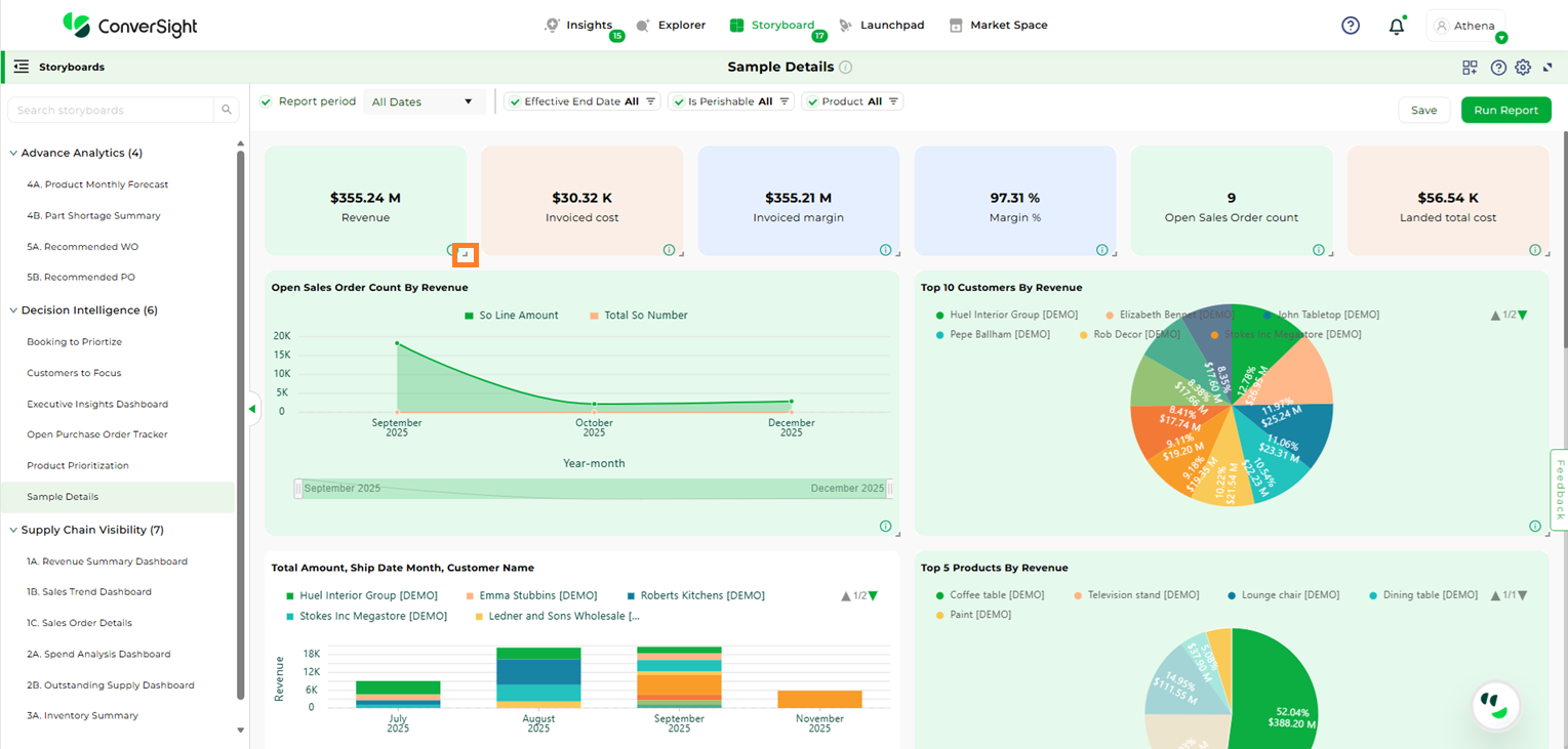 To apply this filter to all storyboard components, click the desired row in the filter component. You will then see the filter applied across all components in the storyboard, along with the specific filter details. In this example, the filter applied is Item Name is Coffee table.
