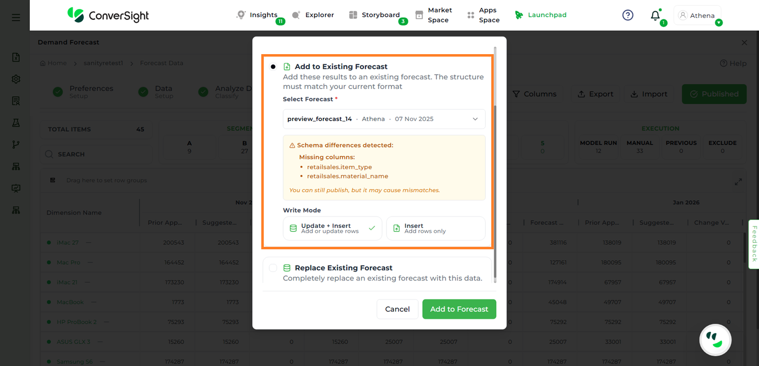 Add to Existing Forecast – Appends the results of the current forecast to an existing one. Users must select the target forecast from the dropdown list.