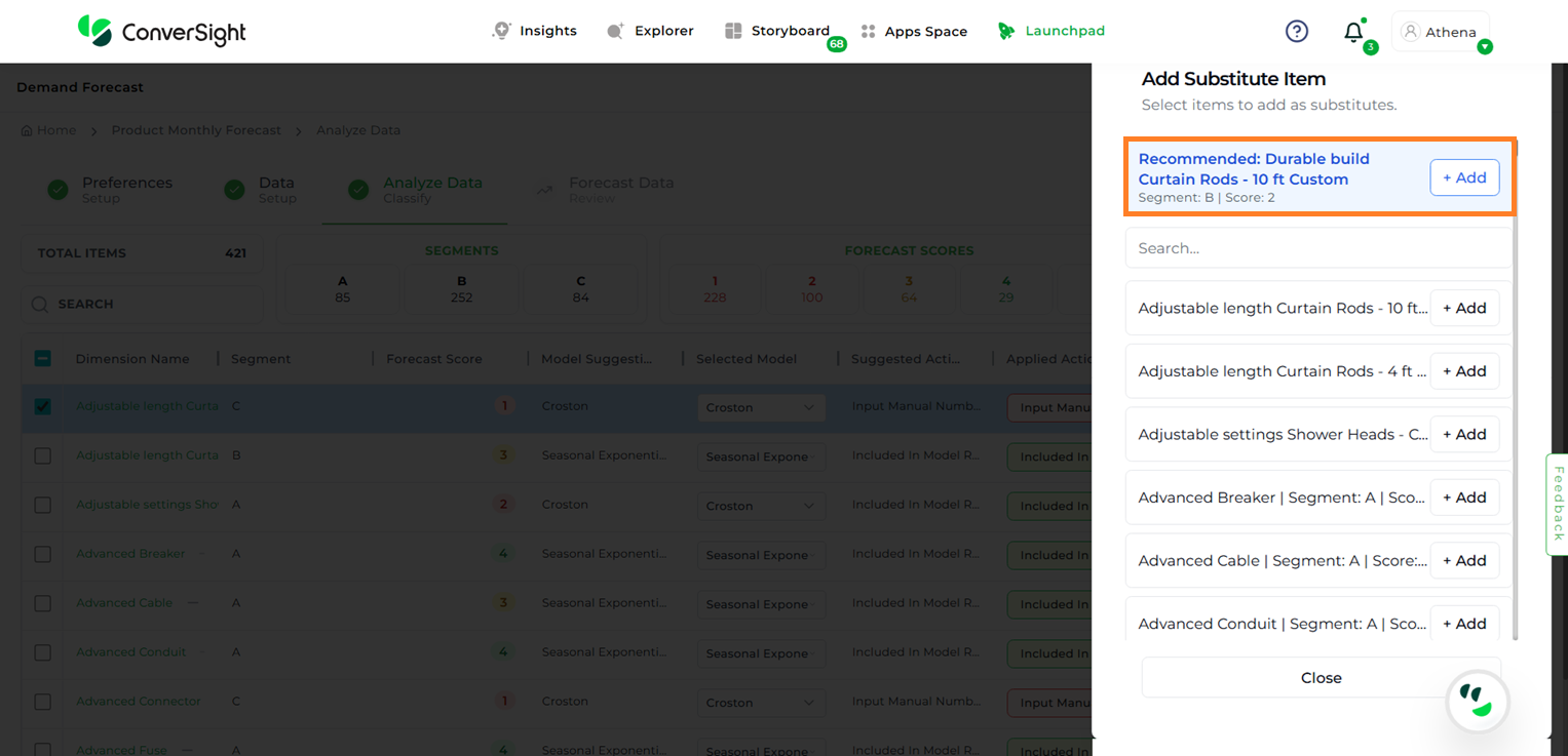 Users can then click the Add button next to the desired item(s) to include them as substitutes. By default, the app provides a recommendation for which item is more suitable to be substituted.