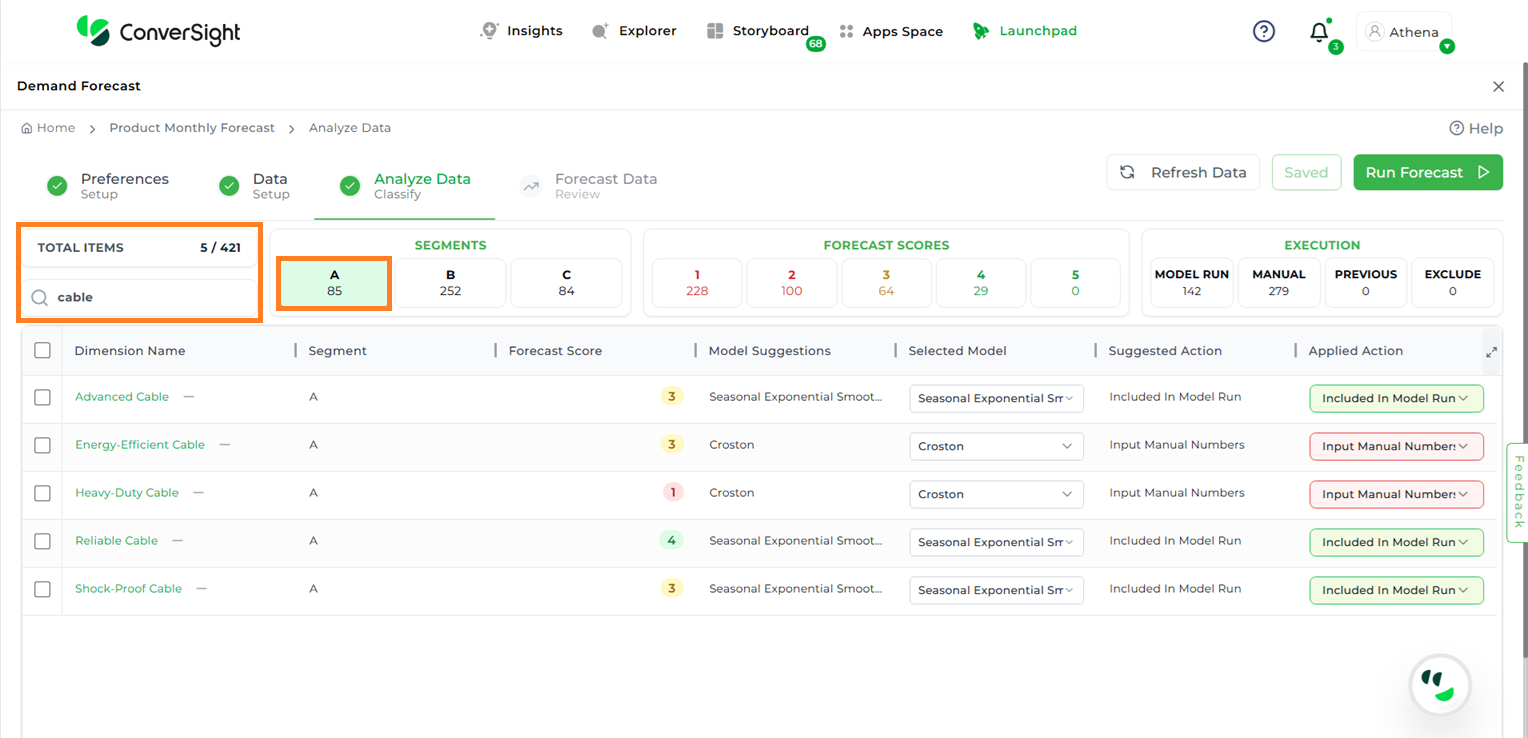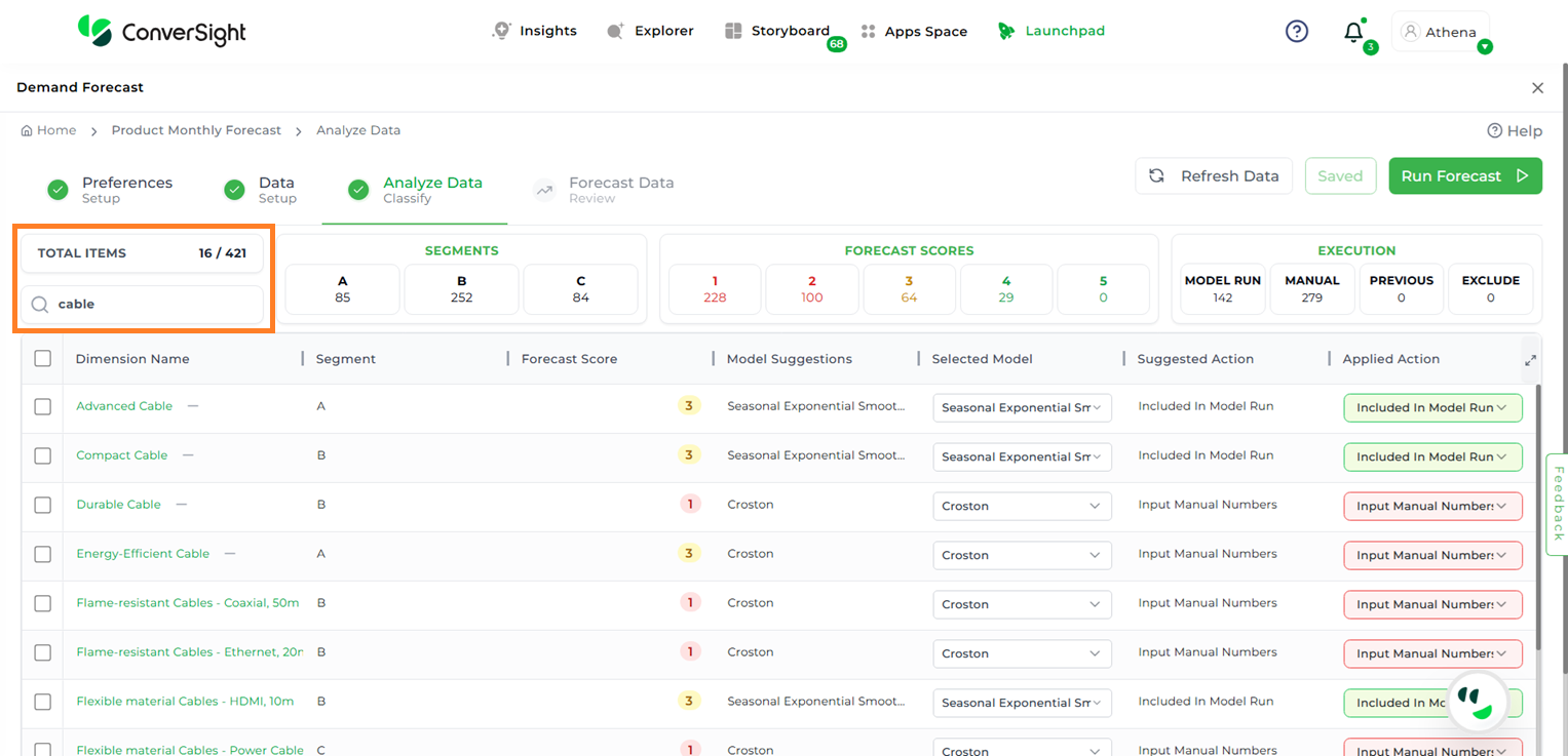 In the Classifications step, users can segment and categorize items based on specific thresholds and demand patterns to refine their forecasting strategies. The app automatically categorizes items into three classes—A, B, or C—based on how much each item contributes to a specific metric (such as revenue, sales volume, or demand), when all items are considered together.