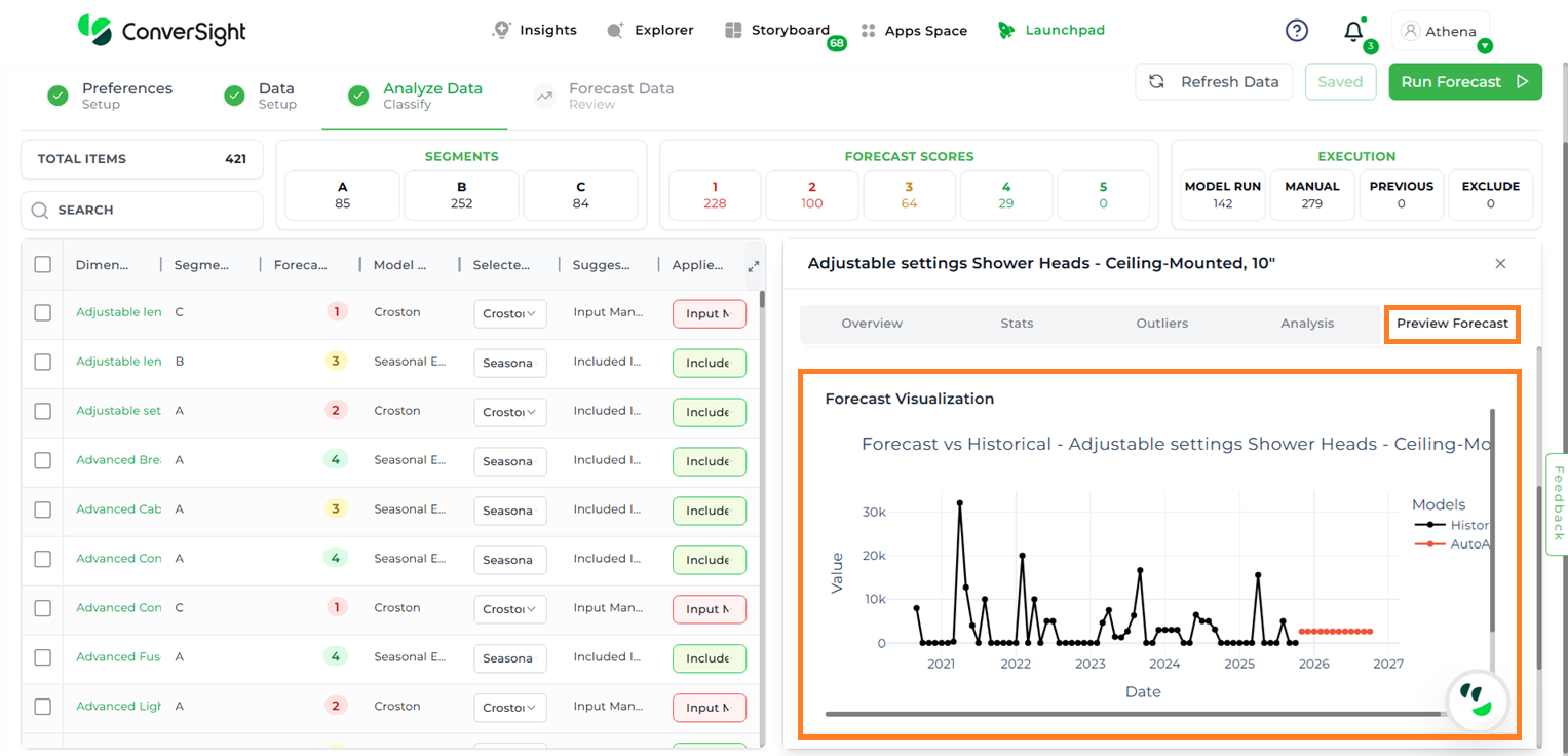 Users can generate a forecast for a specific item to view the corresponding graphs across multiple models—without needing to run the entire forecast each time for individual items or different model configurations.