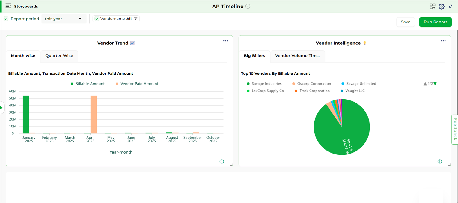The Procurement and Payables storyboards offer a comprehensive view of supplier management and cash outflows, ensuring cost efficiency and timely vendor payments.