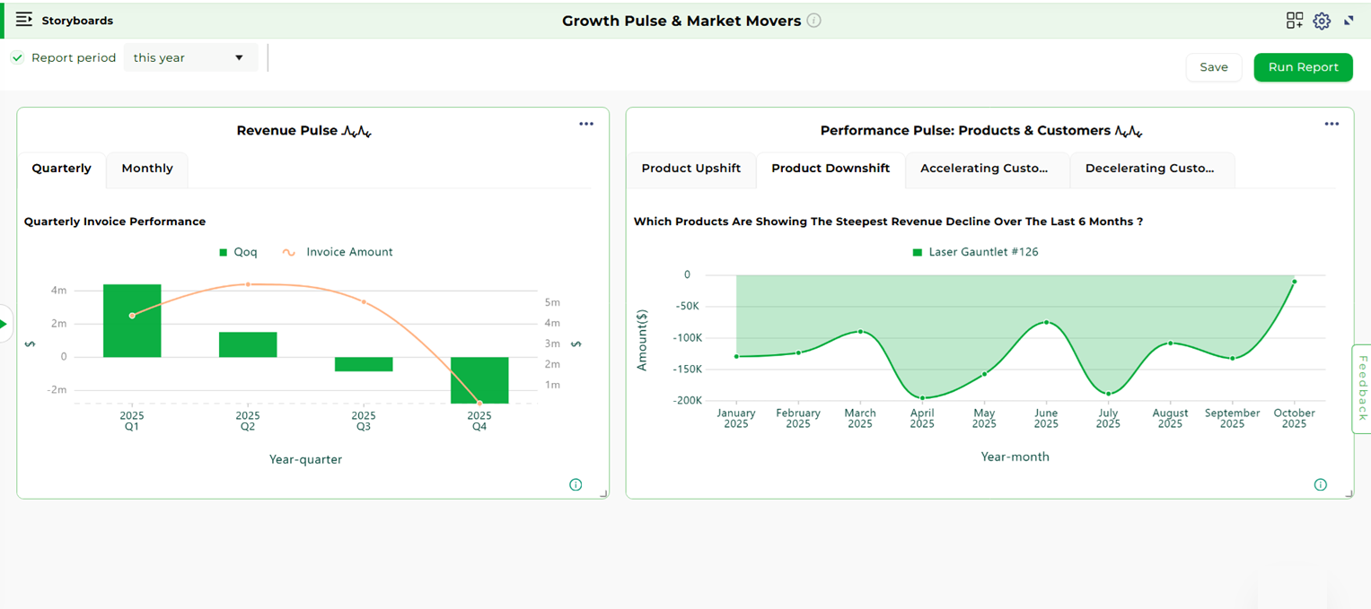 These storyboards provide powerful insights across various business functions, helping users track performance, optimize financial operations, and make data-driven decisions.