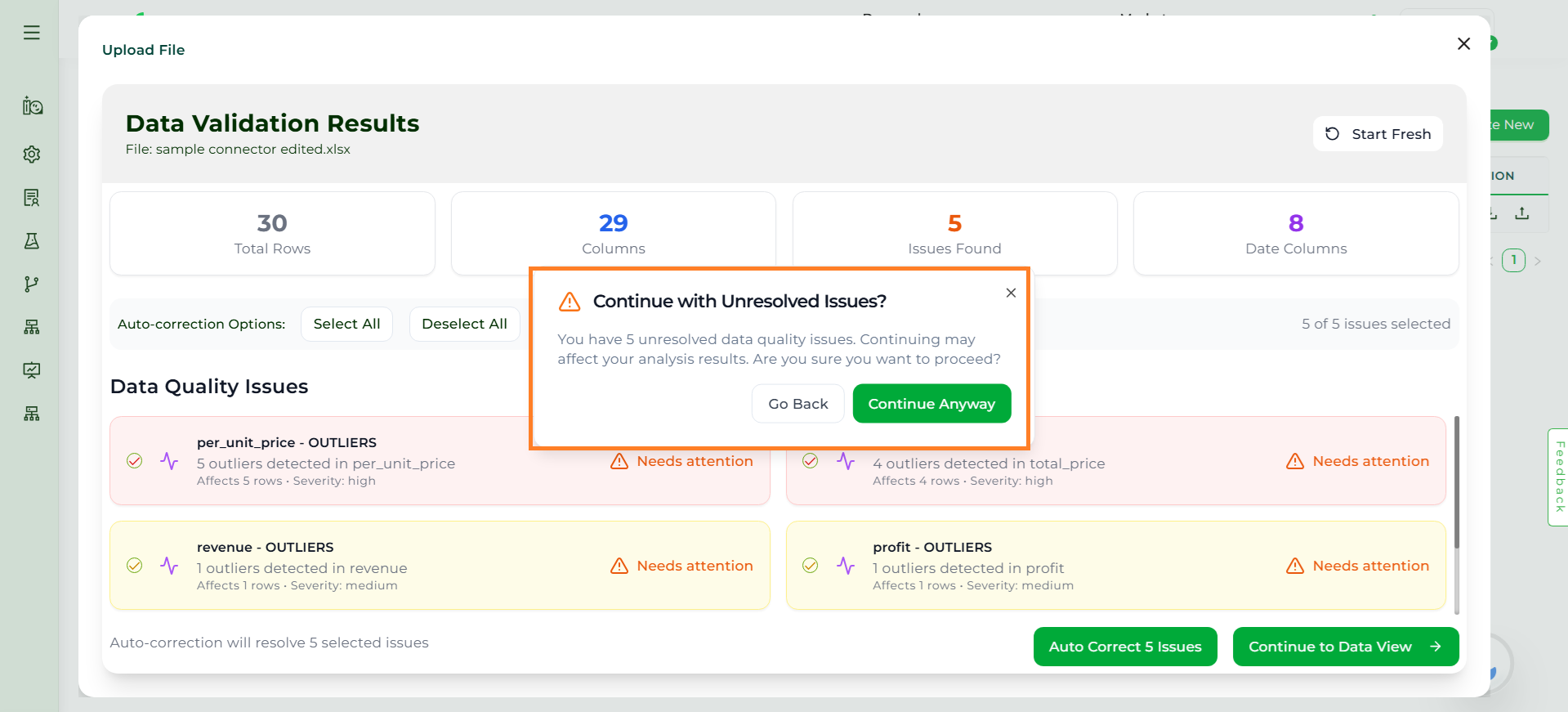 If users choose to continue without auto-correcting the issues and click Continue to Data View, the system will display a warning message. This ensures users are fully aware of data risks before moving forward.