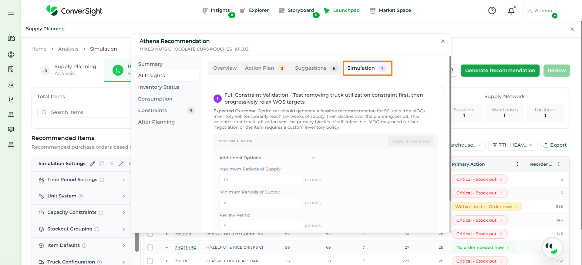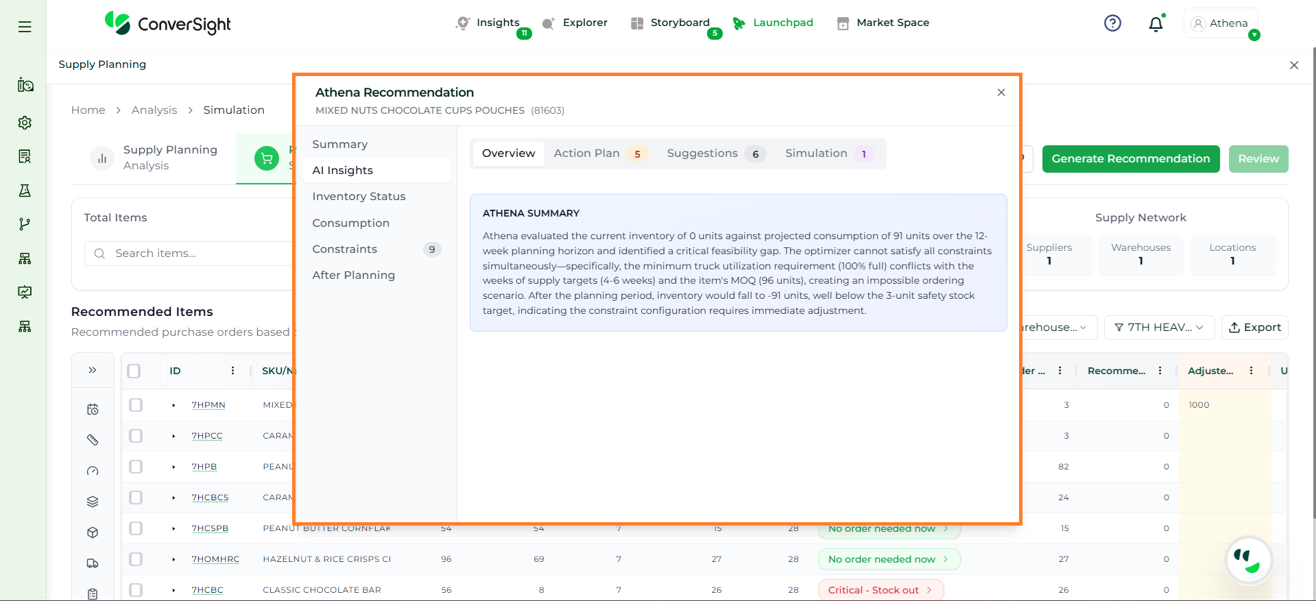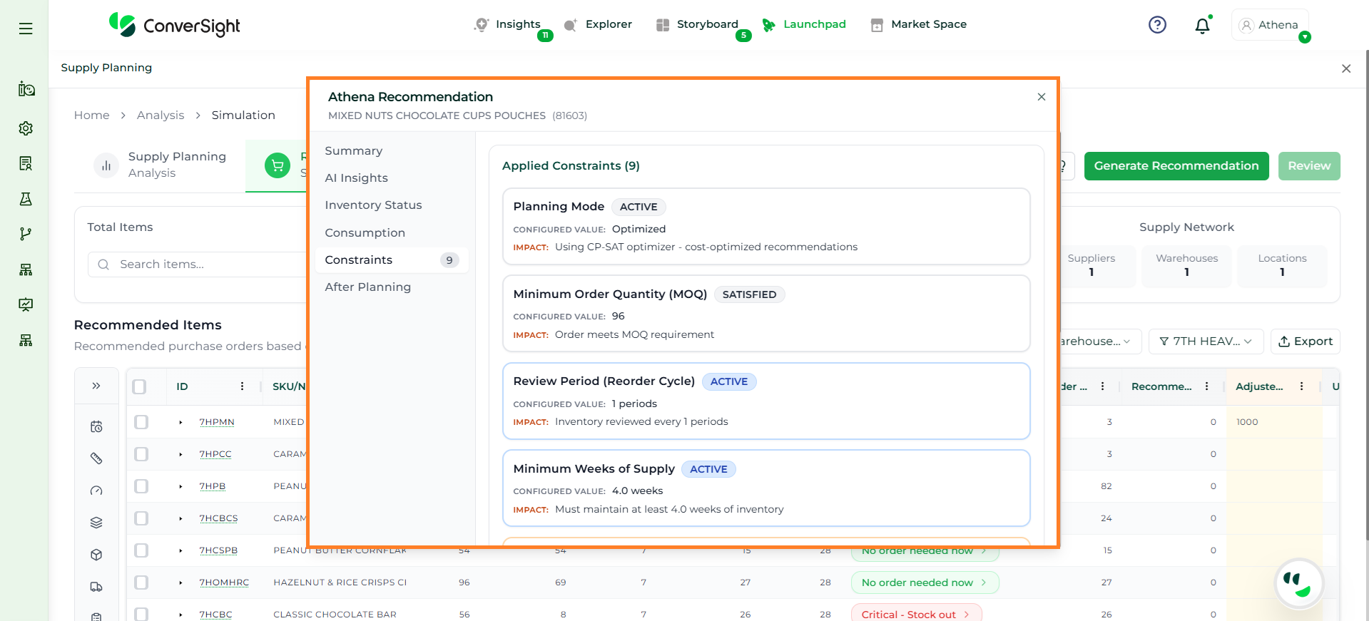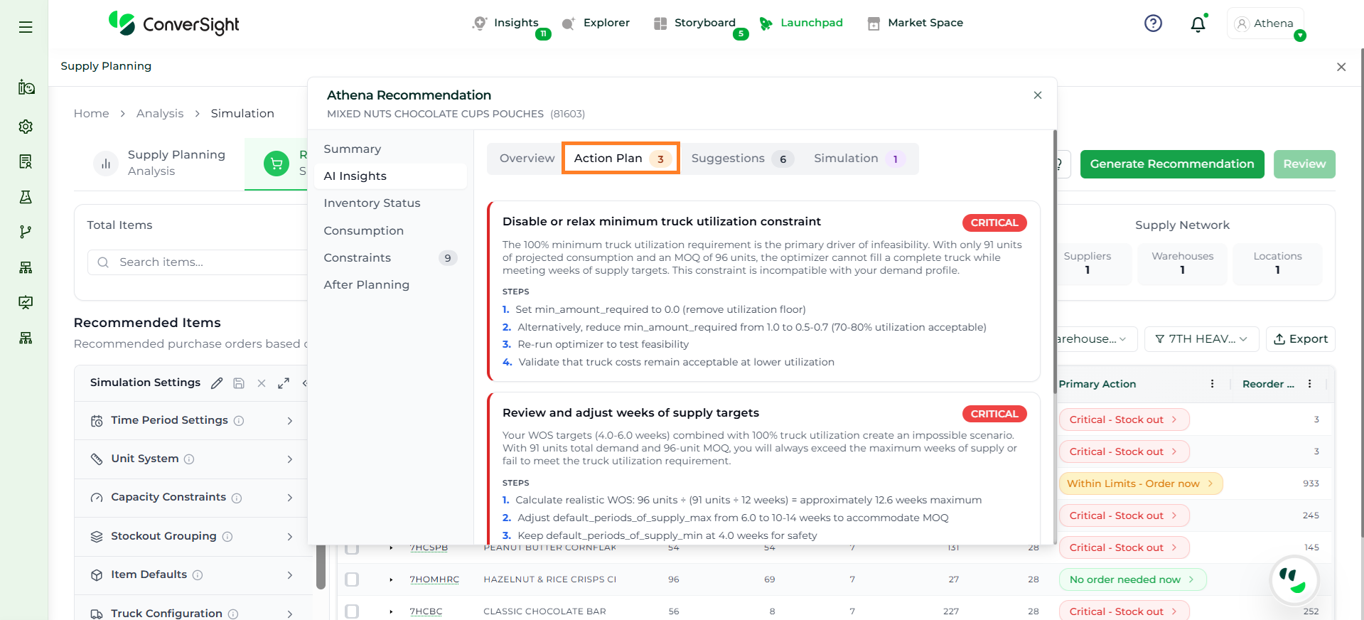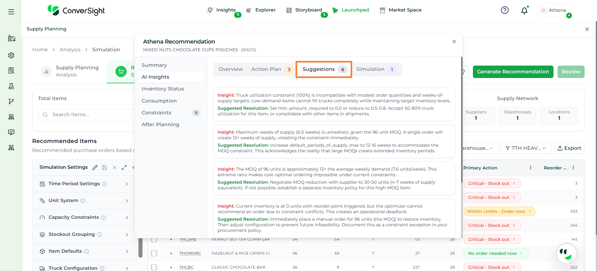 Athena highlights the underlying reasons behind each issue and suggests alternative configurations or parameter adjustments. These may include changes to MOQ, weeks of supply, review periods, or other planning constraints.