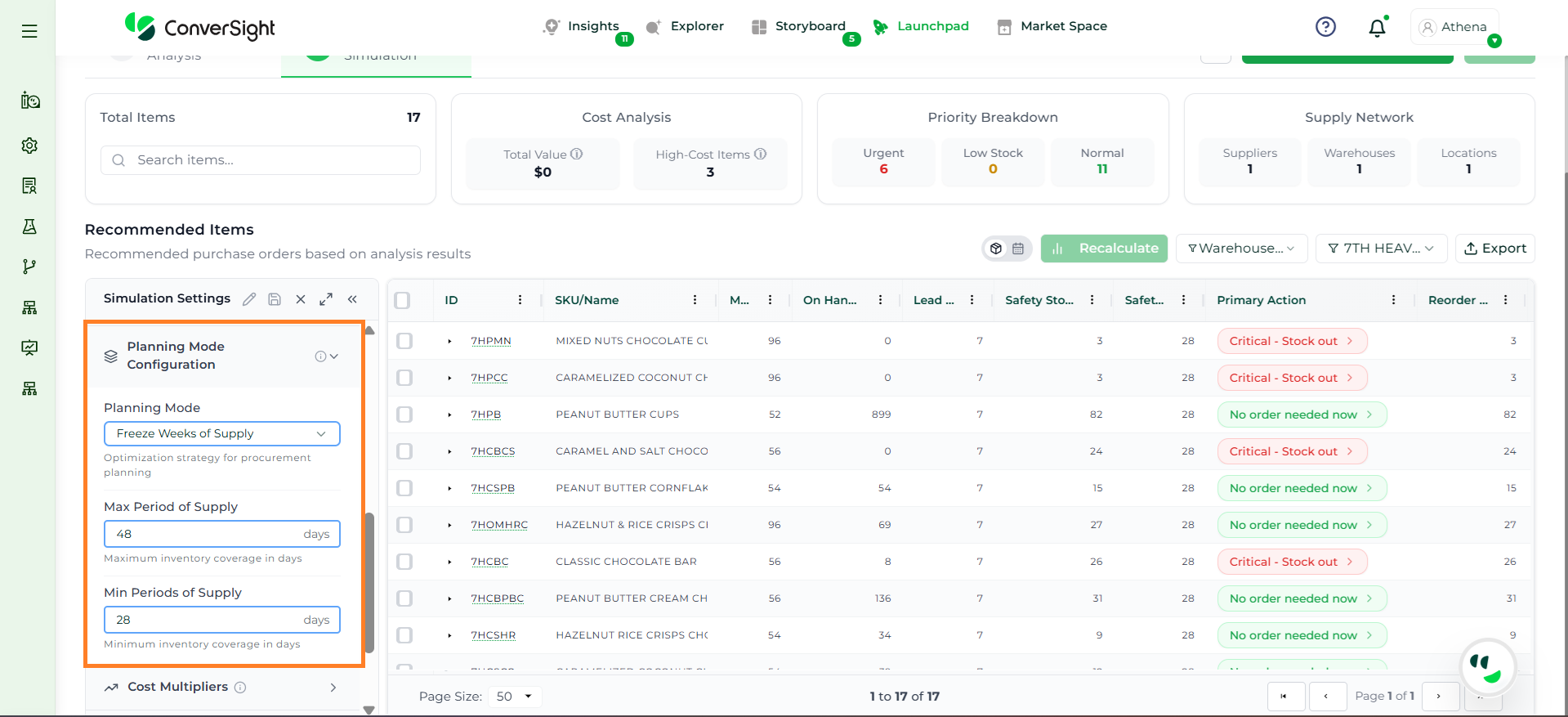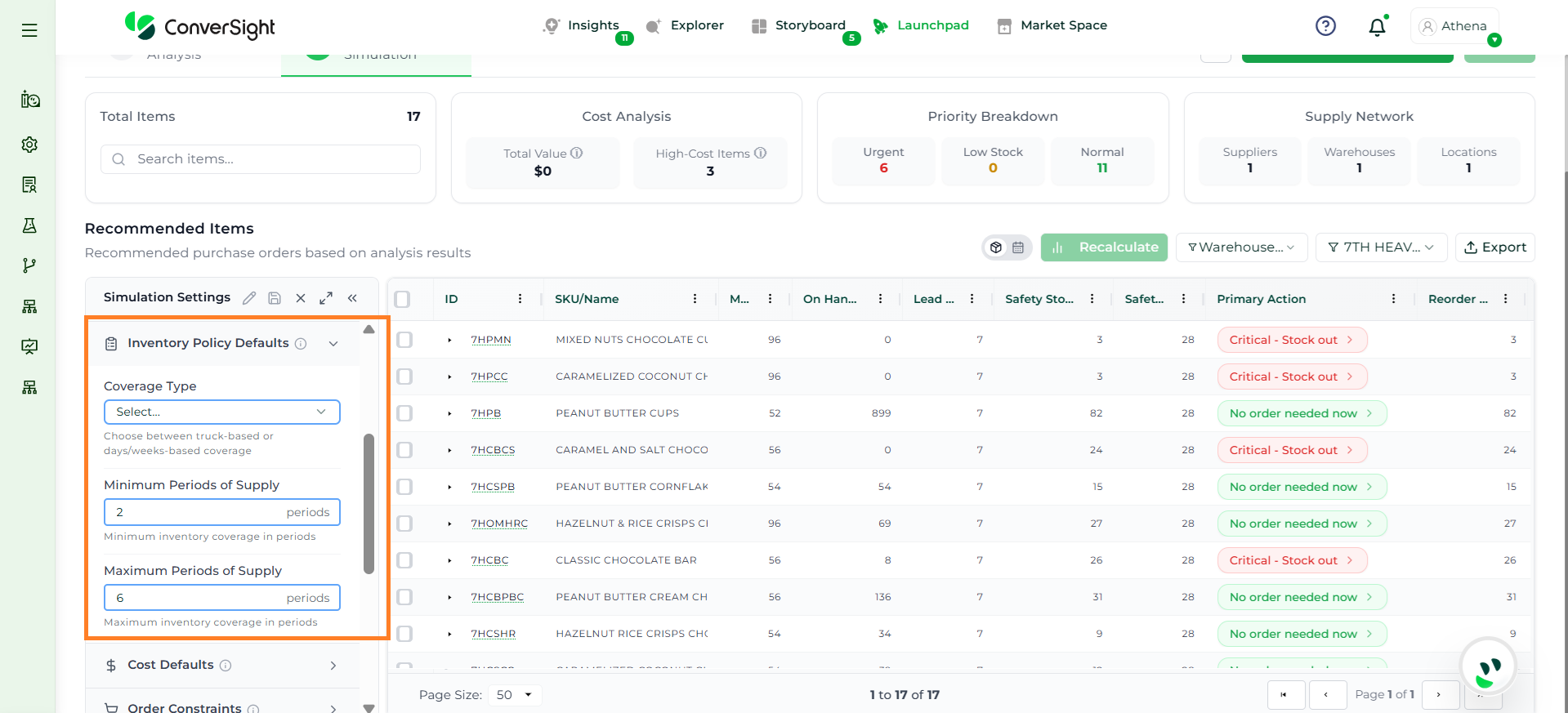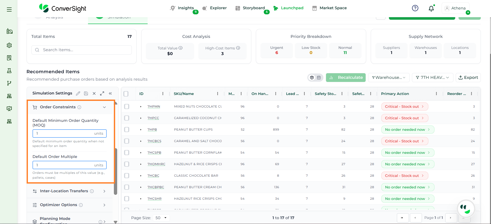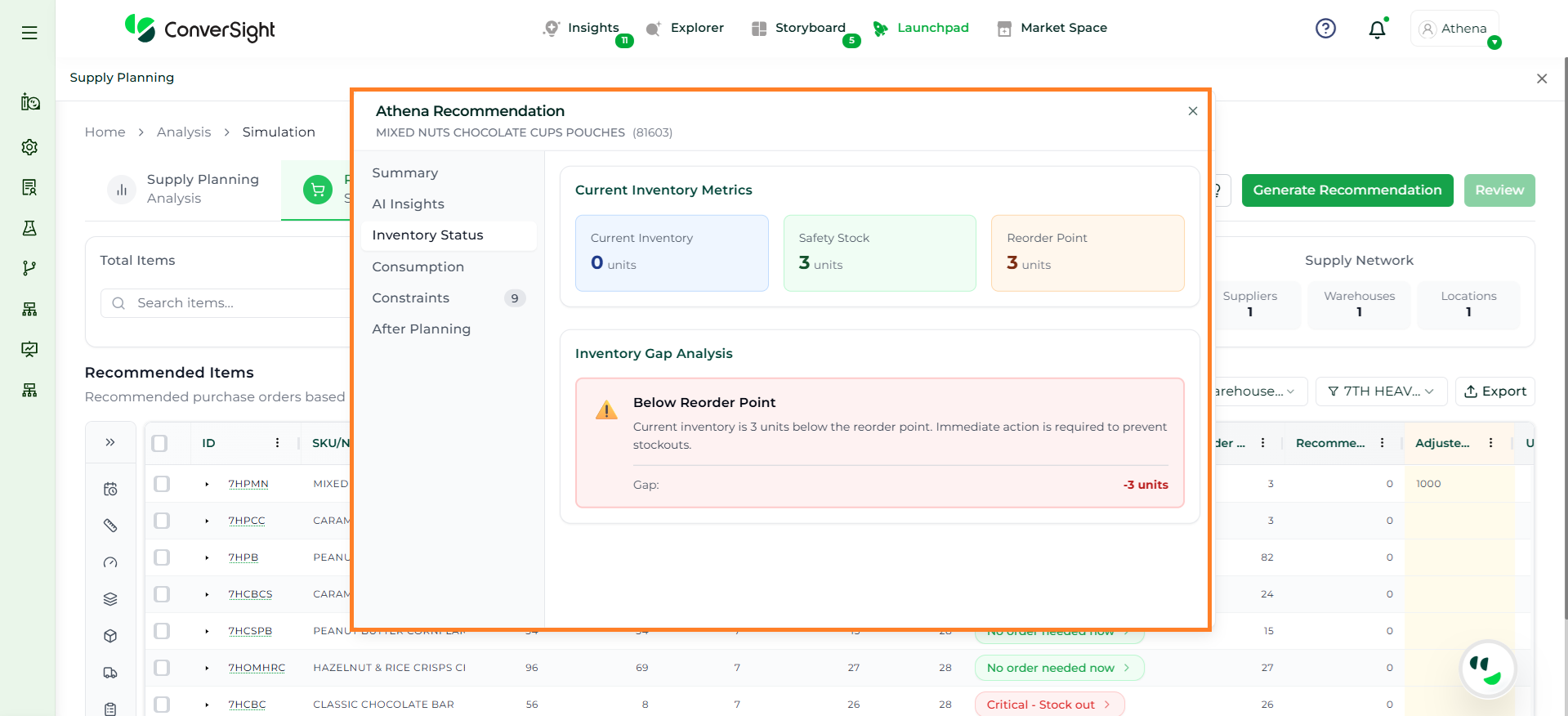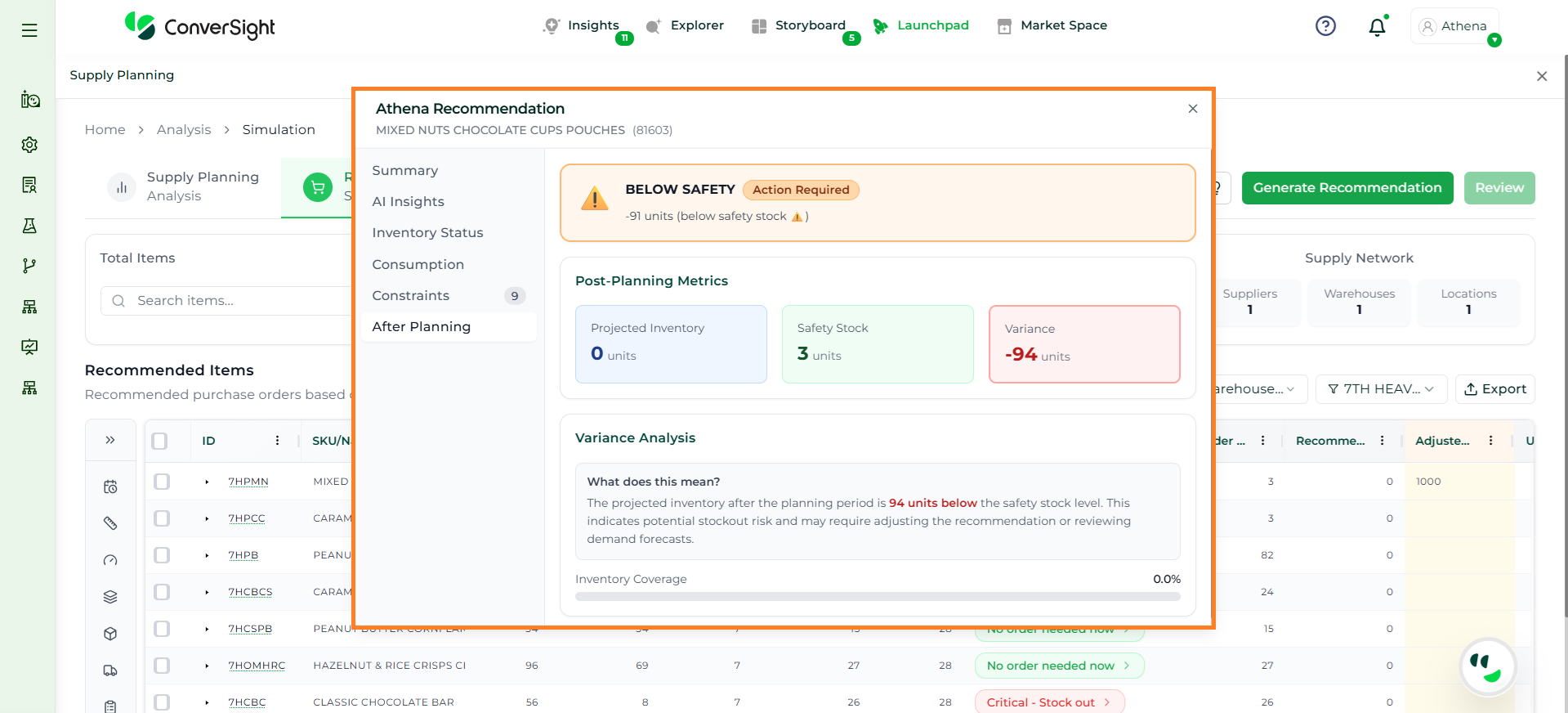 Athena highlights the underlying reasons behind each issue and suggests alternative configurations or parameter adjustments. These may include changes to MOQ, weeks of supply, review periods, or other planning constraints.