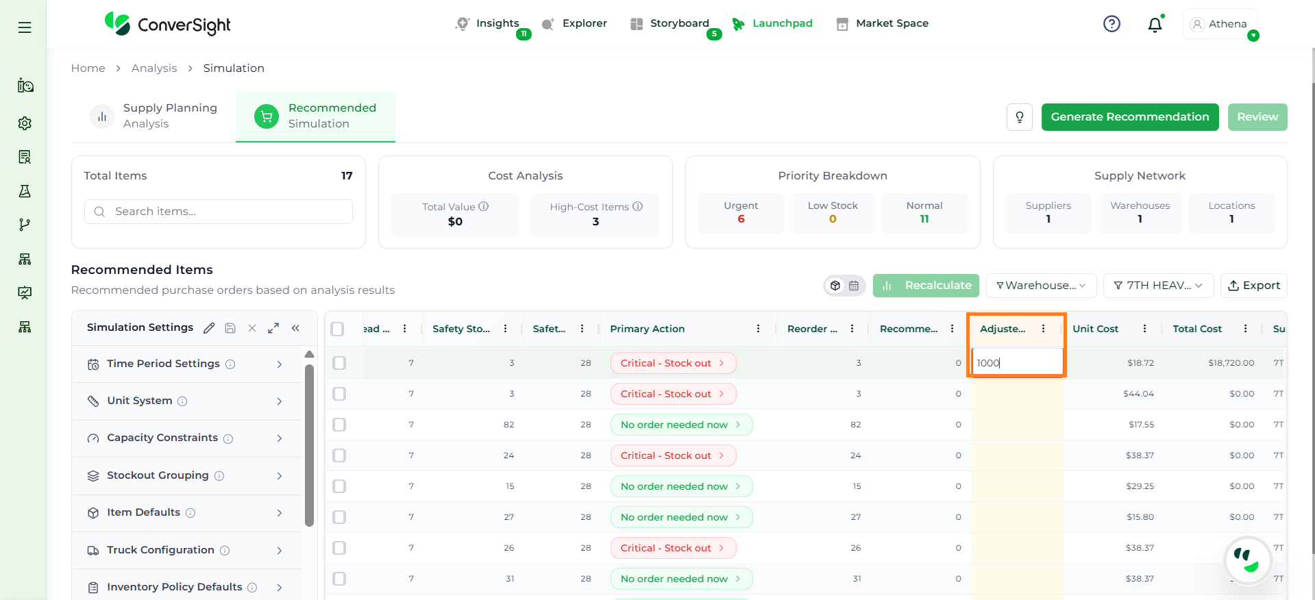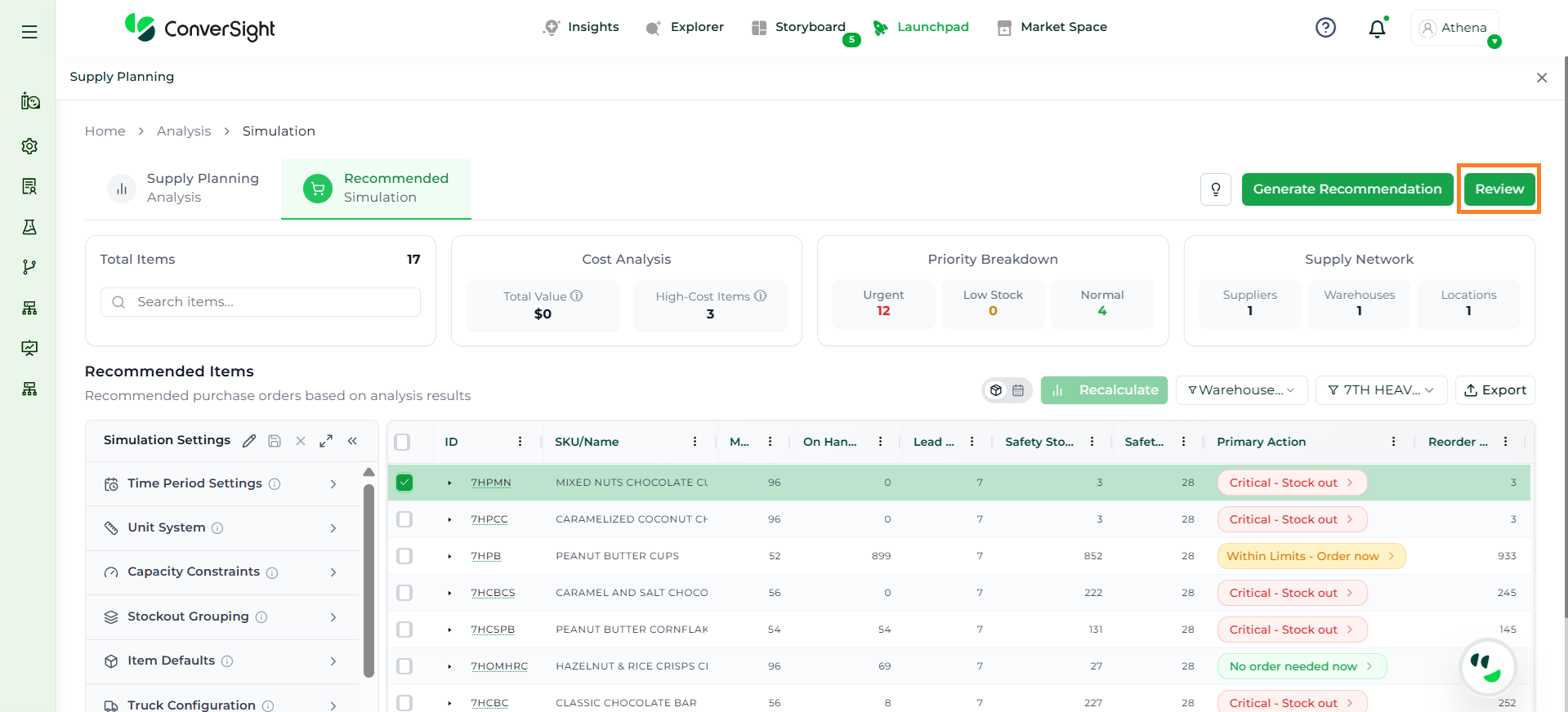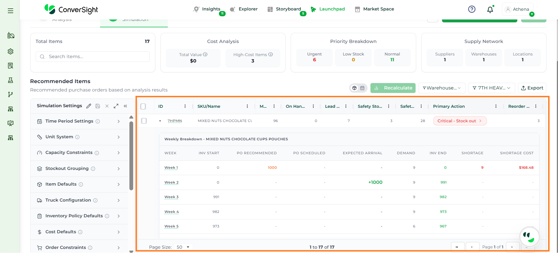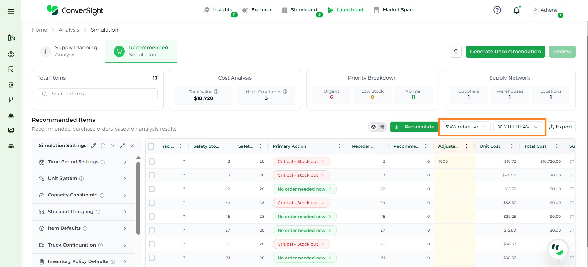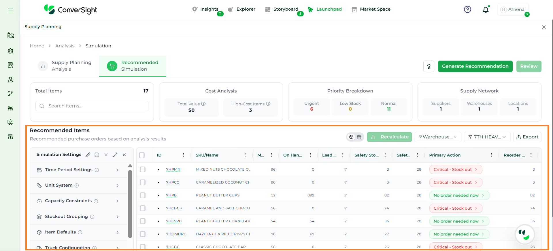 Athena highlights the underlying reasons behind each issue and suggests alternative configurations or parameter adjustments. These may include changes to MOQ, weeks of supply, review periods, or other planning constraints.