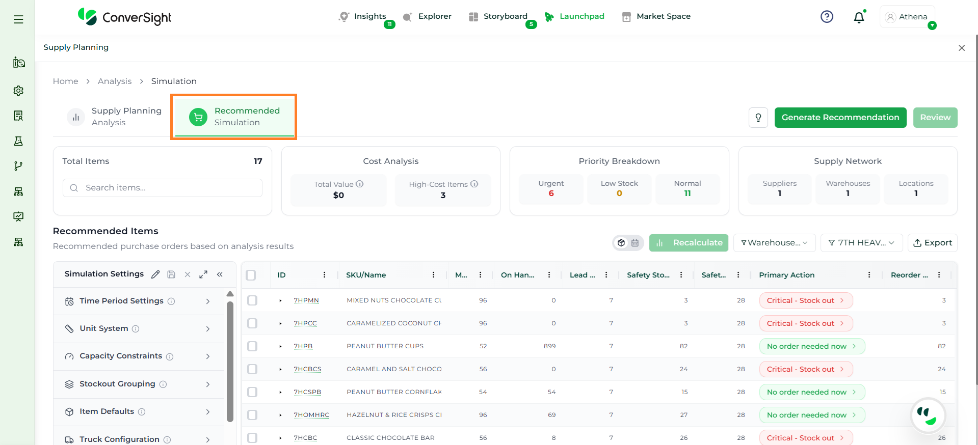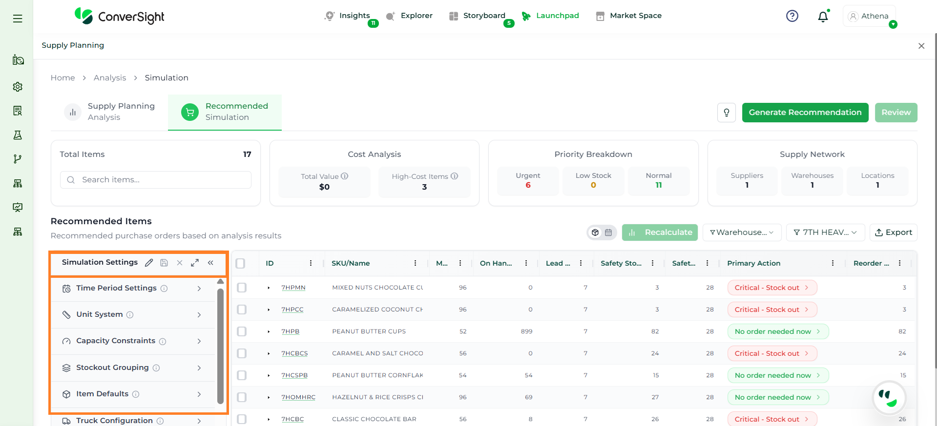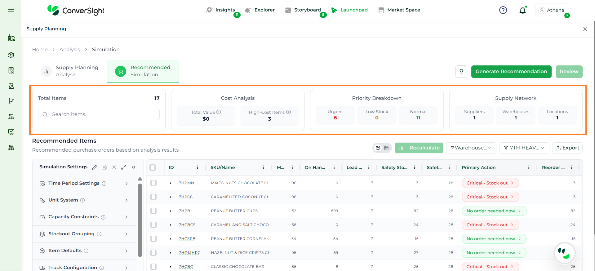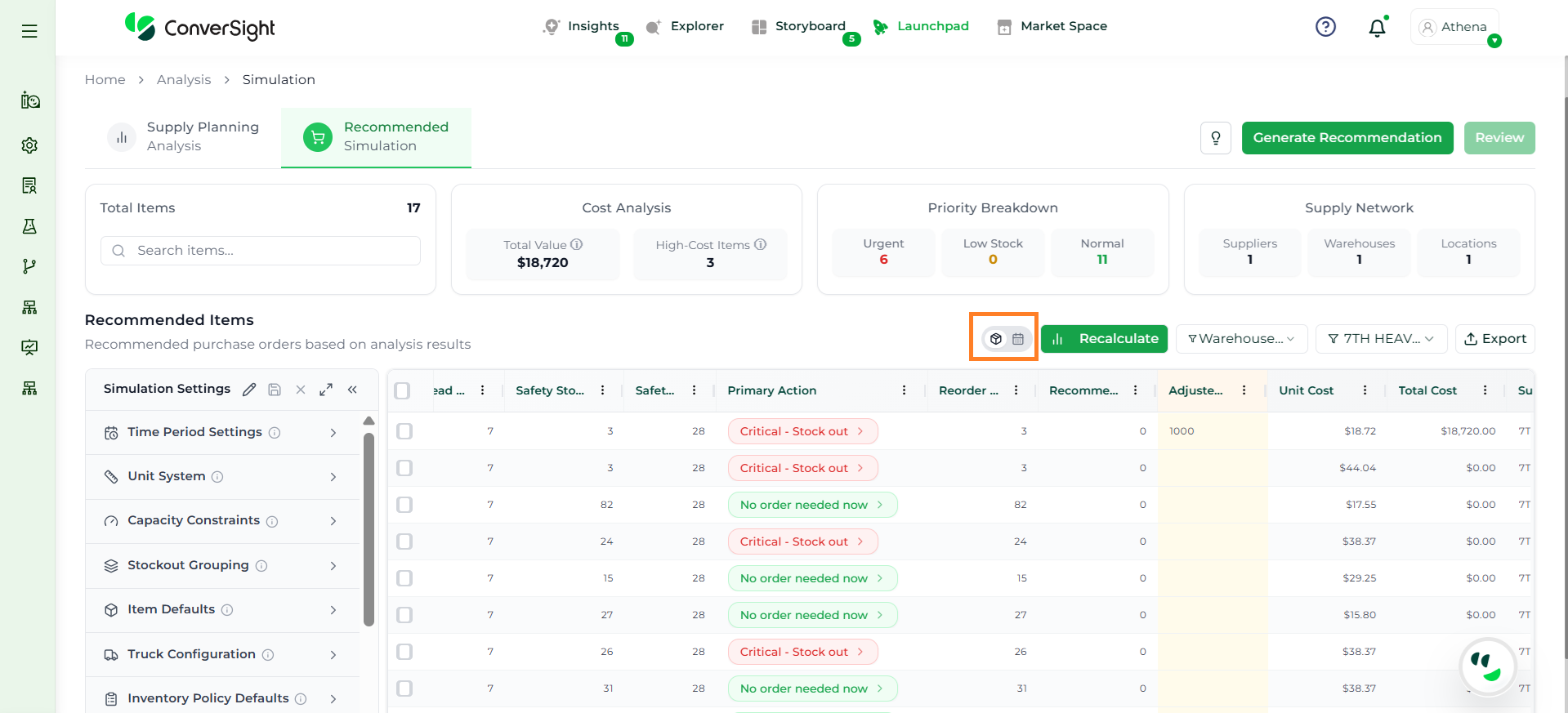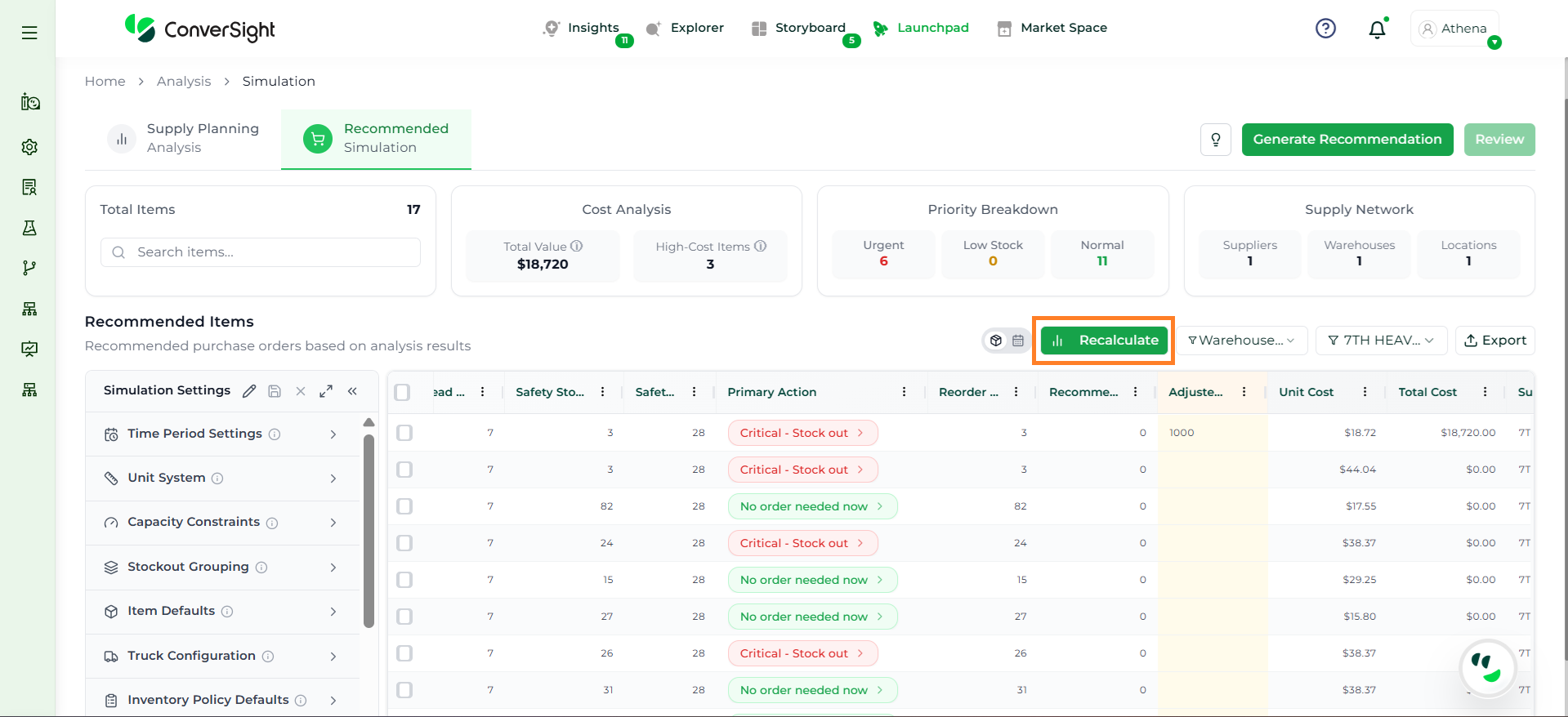 Athena highlights the underlying reasons behind each issue and suggests alternative configurations or parameter adjustments. These may include changes to MOQ, weeks of supply, review periods, or other planning constraints.