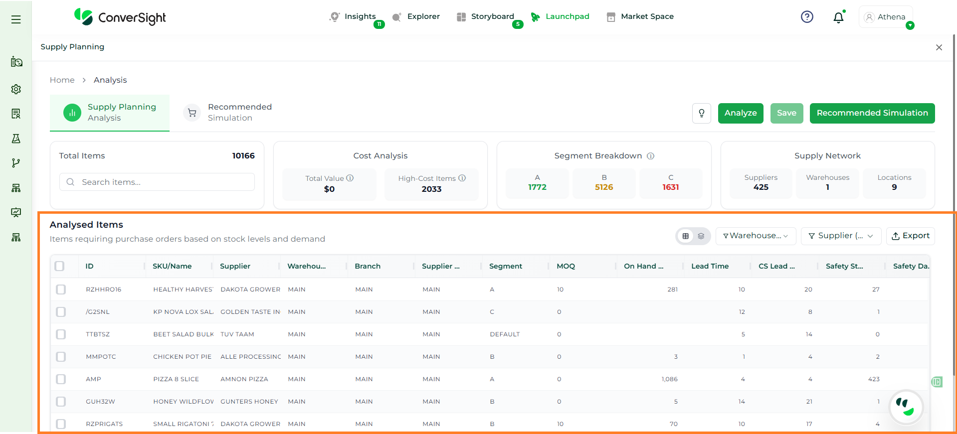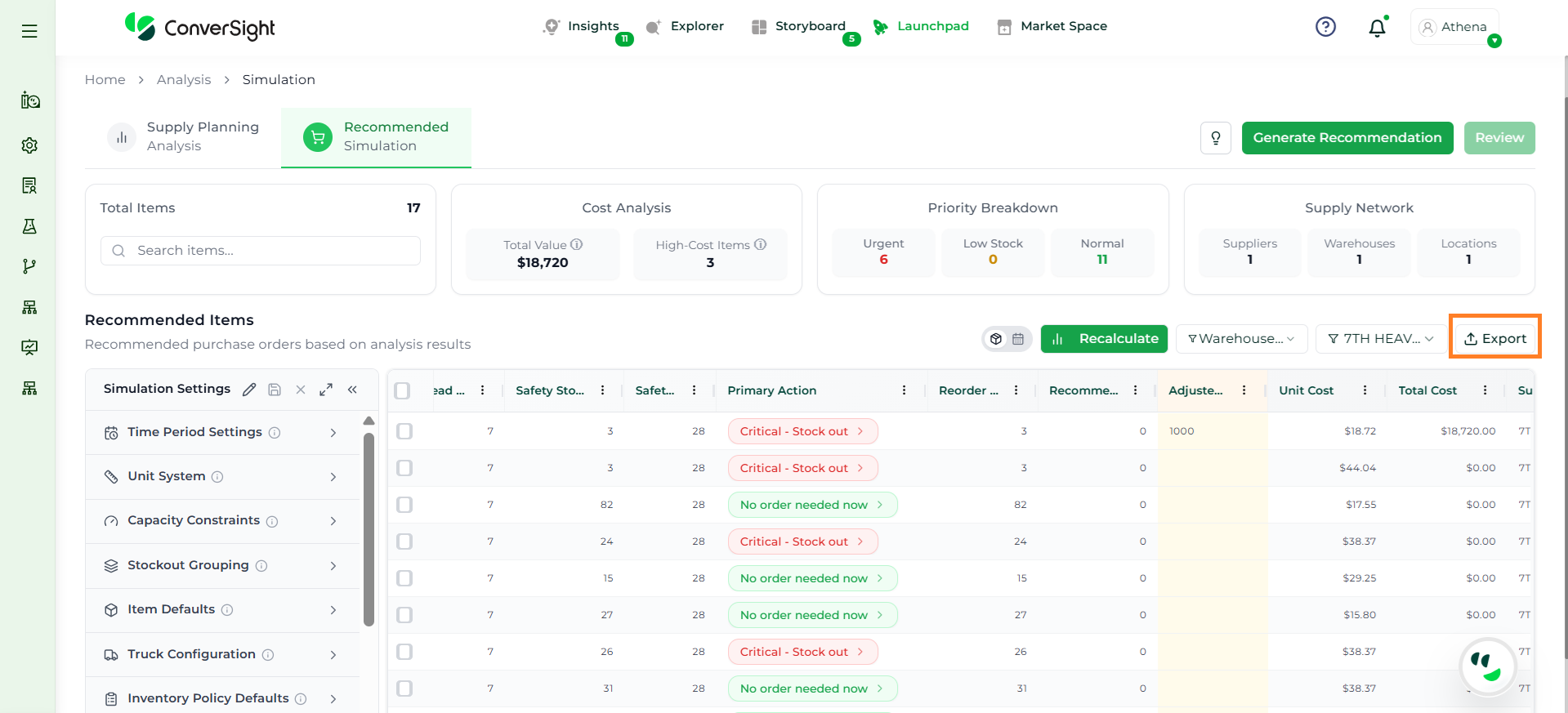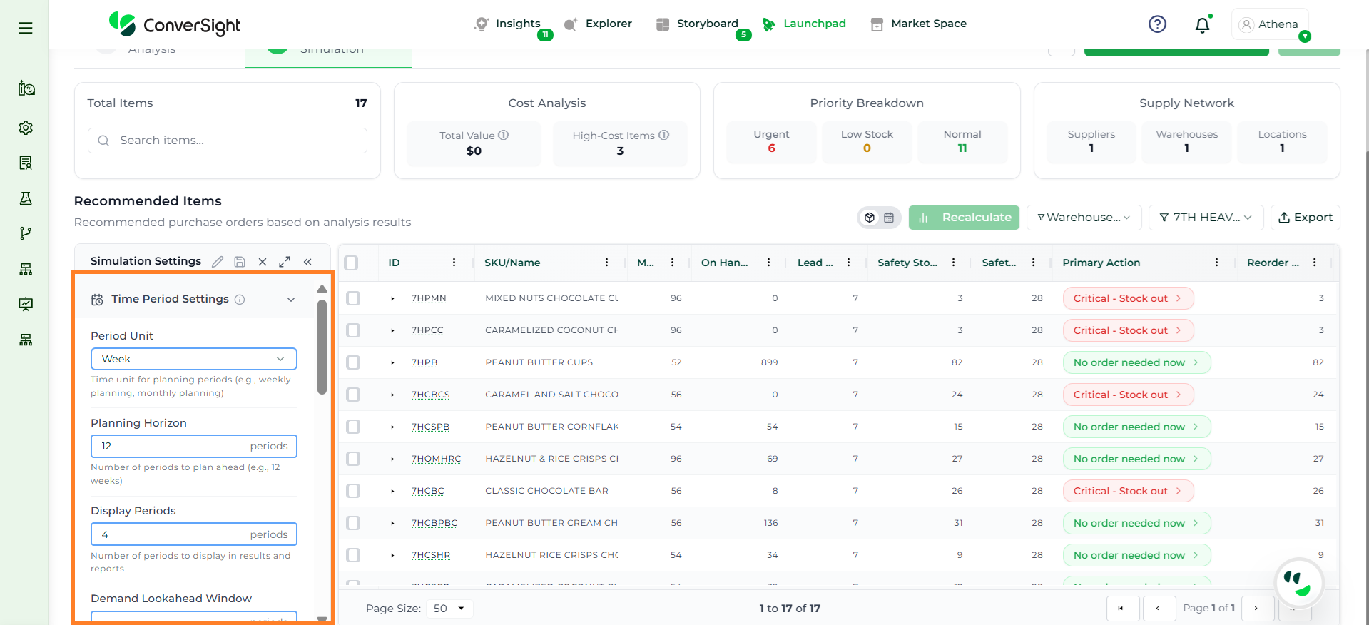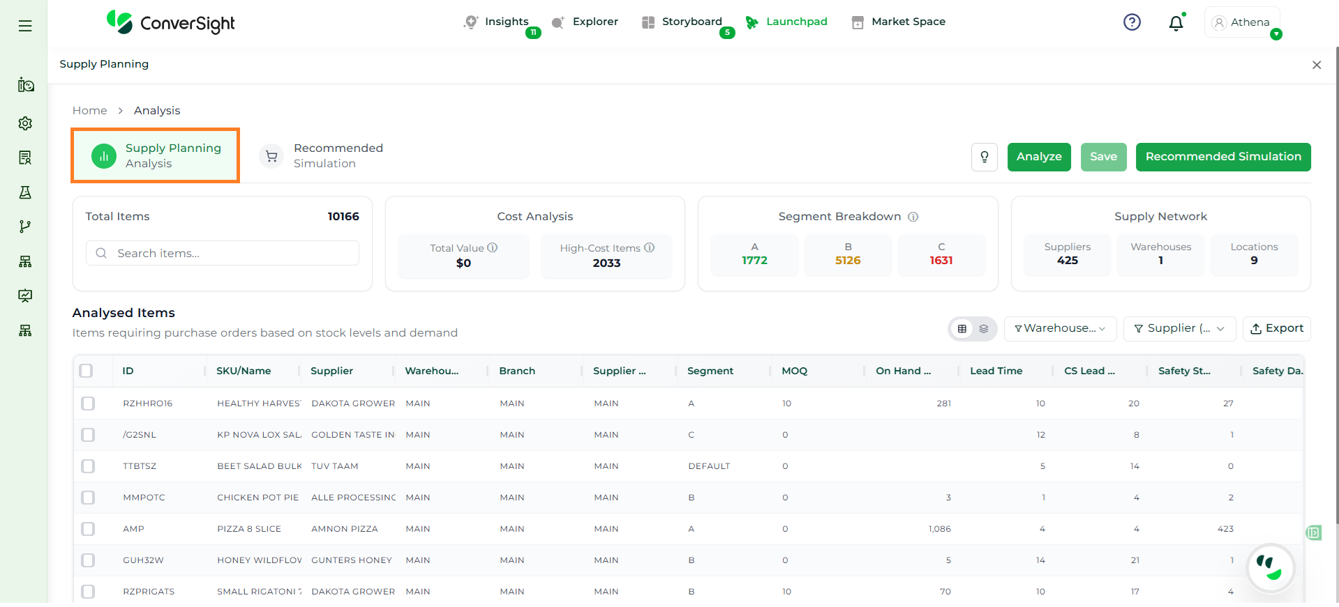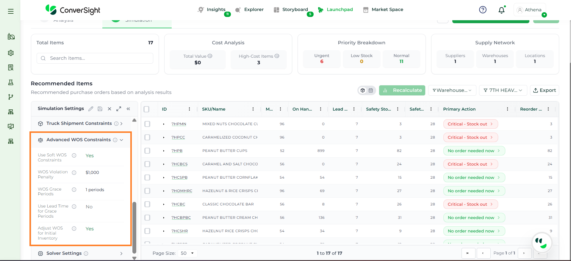 Athena highlights the underlying reasons behind each issue and suggests alternative configurations or parameter adjustments. These may include changes to MOQ, weeks of supply, review periods, or other planning constraints.