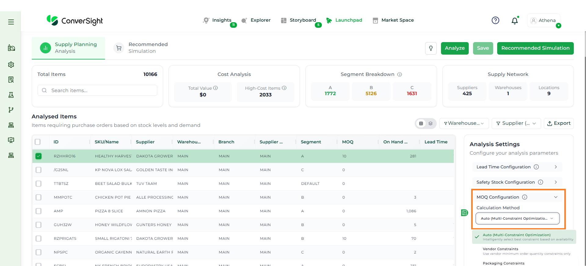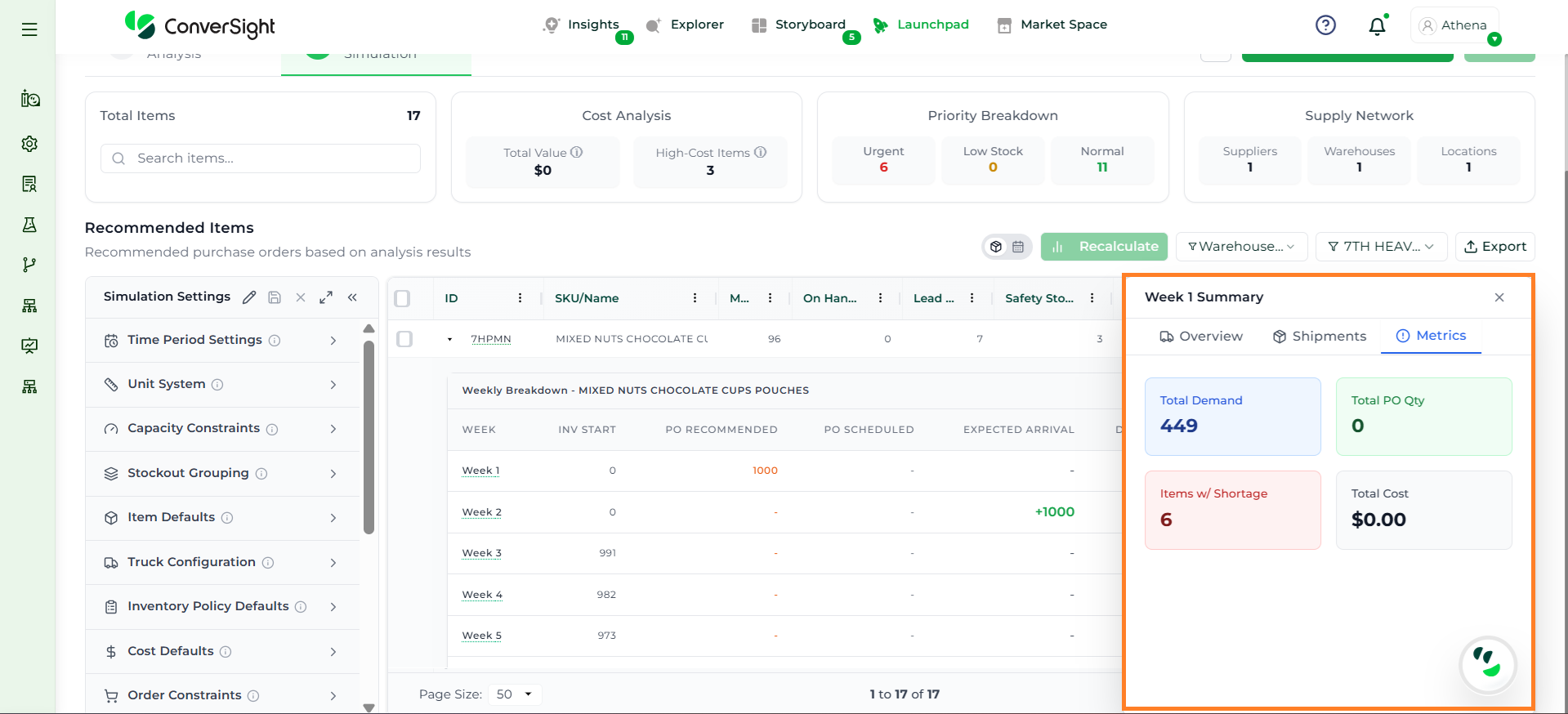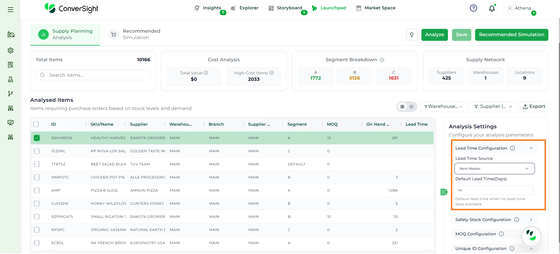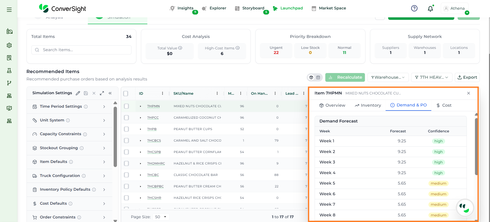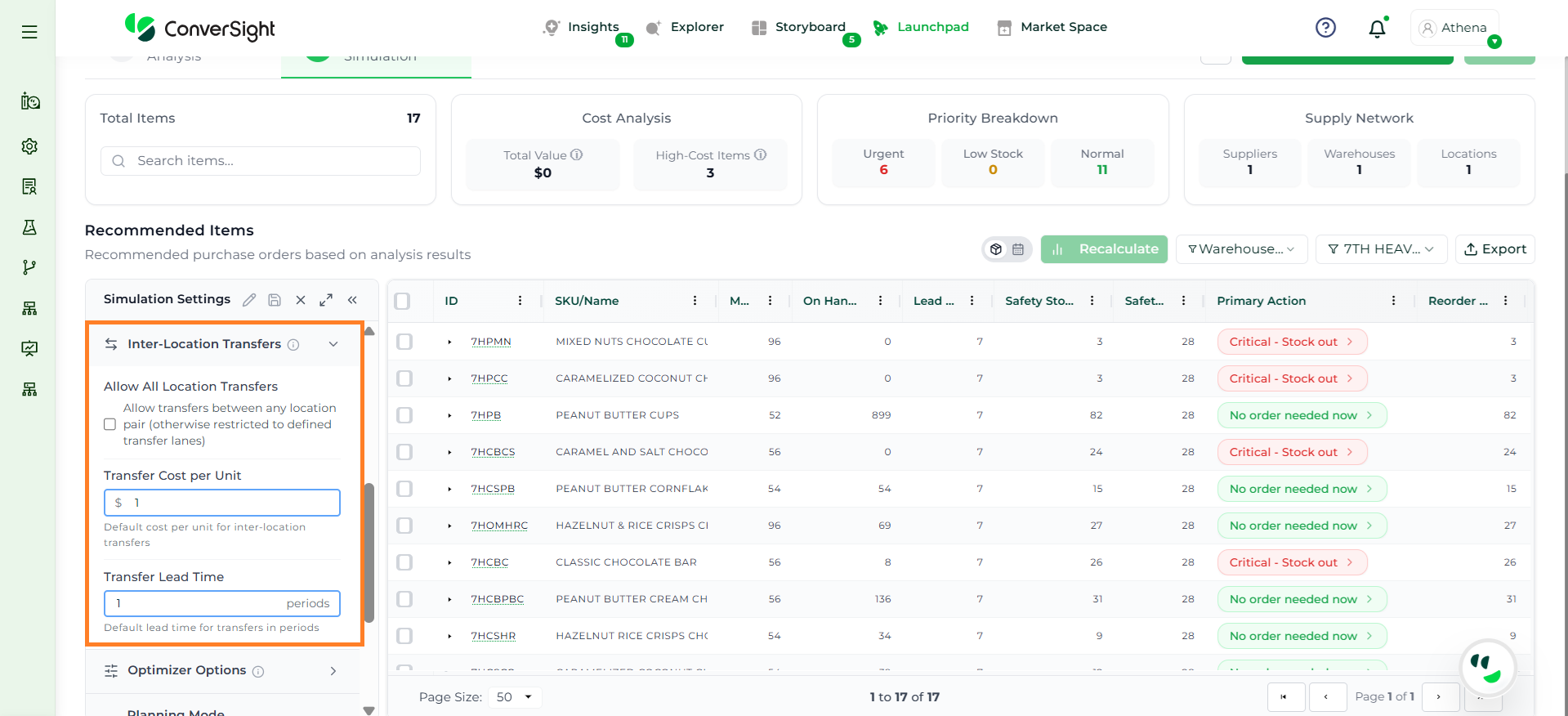 Athena highlights the underlying reasons behind each issue and suggests alternative configurations or parameter adjustments. These may include changes to MOQ, weeks of supply, review periods, or other planning constraints.