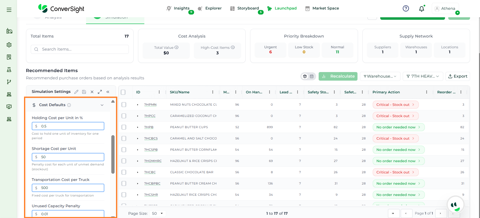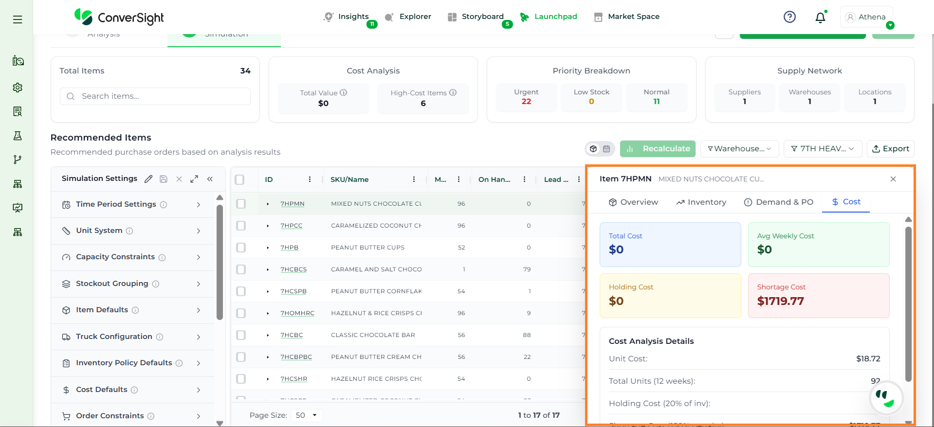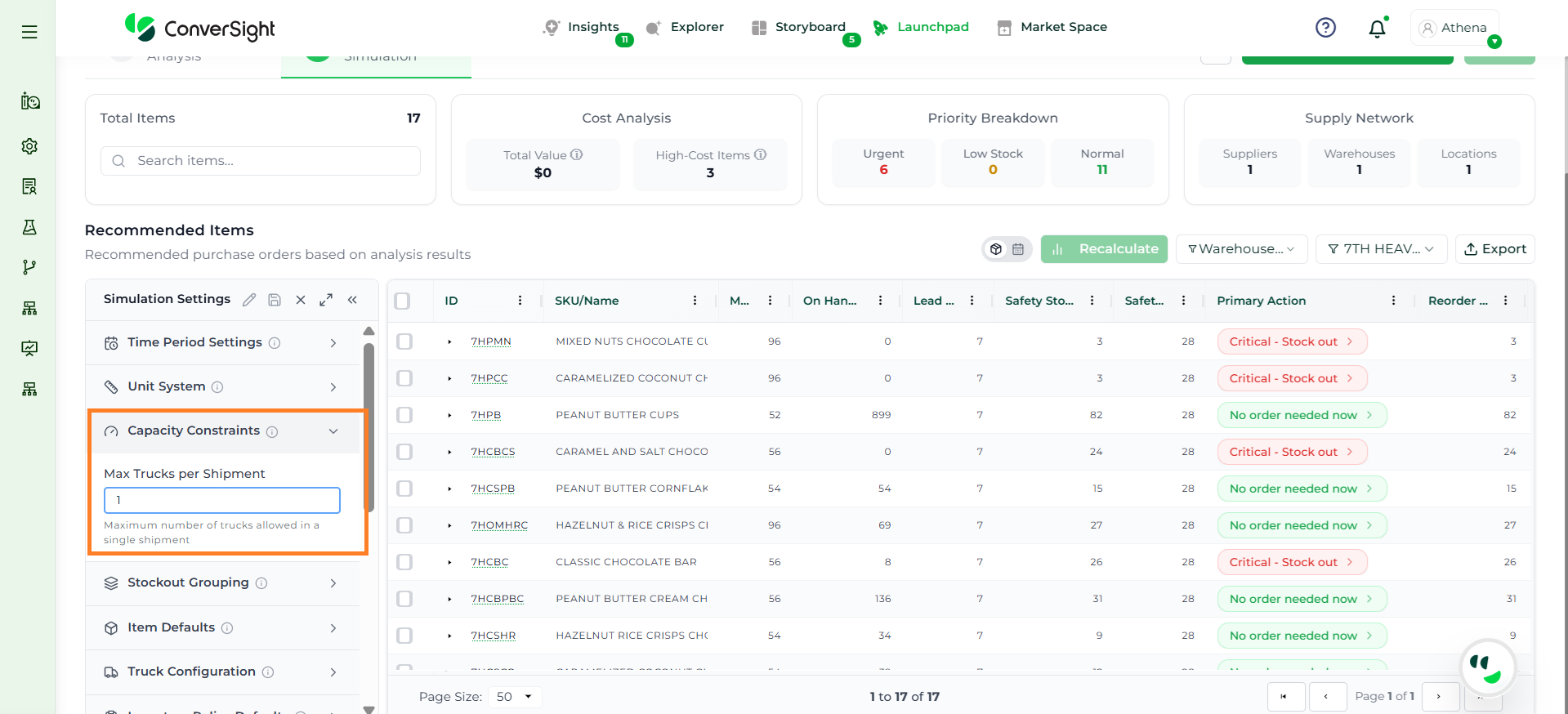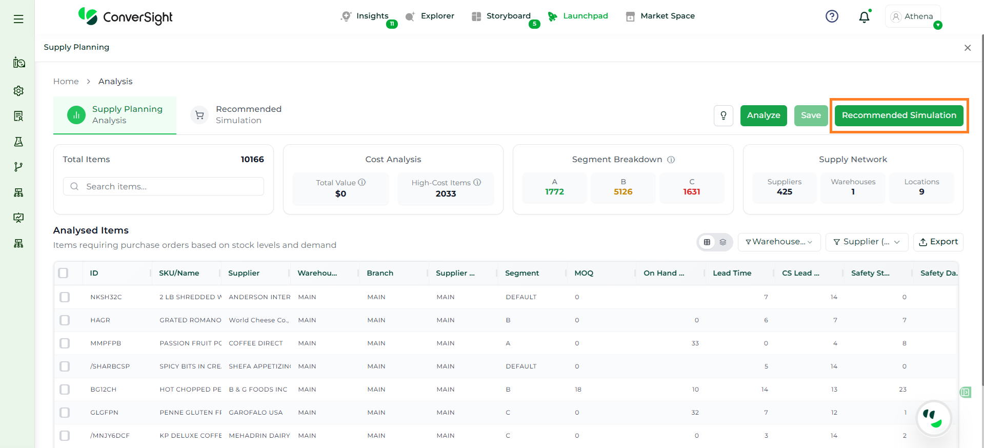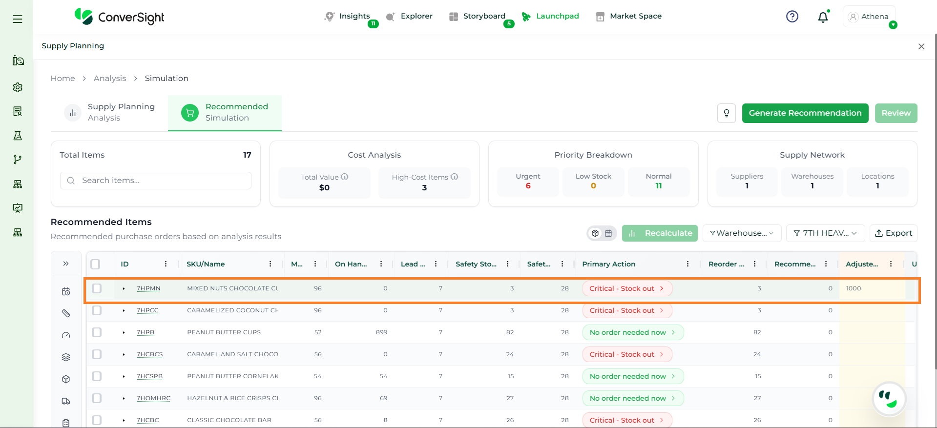 Athena highlights the underlying reasons behind each issue and suggests alternative configurations or parameter adjustments. These may include changes to MOQ, weeks of supply, review periods, or other planning constraints.