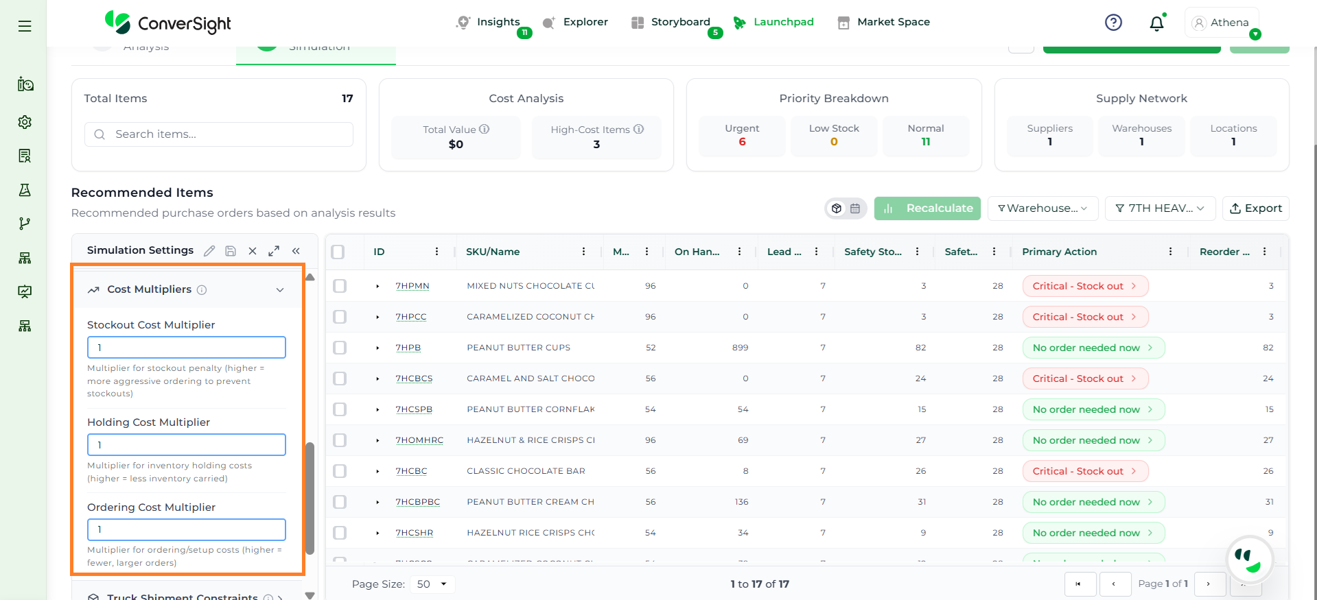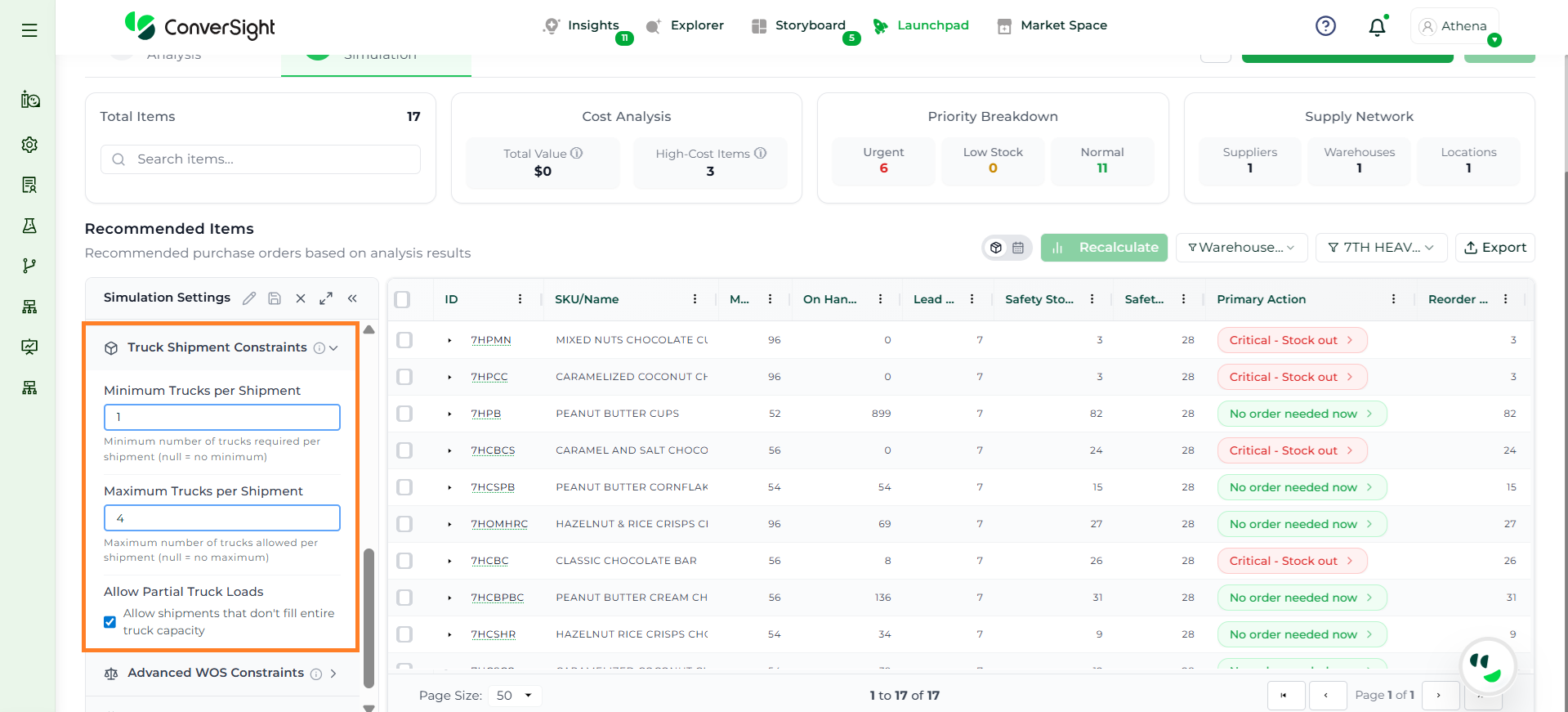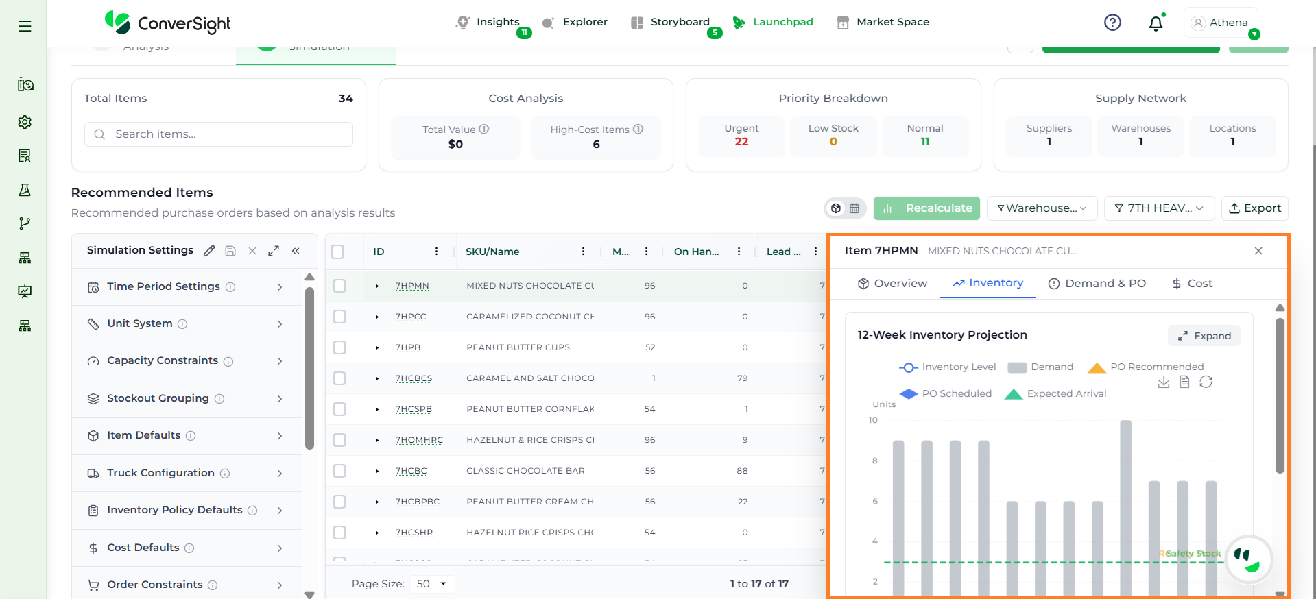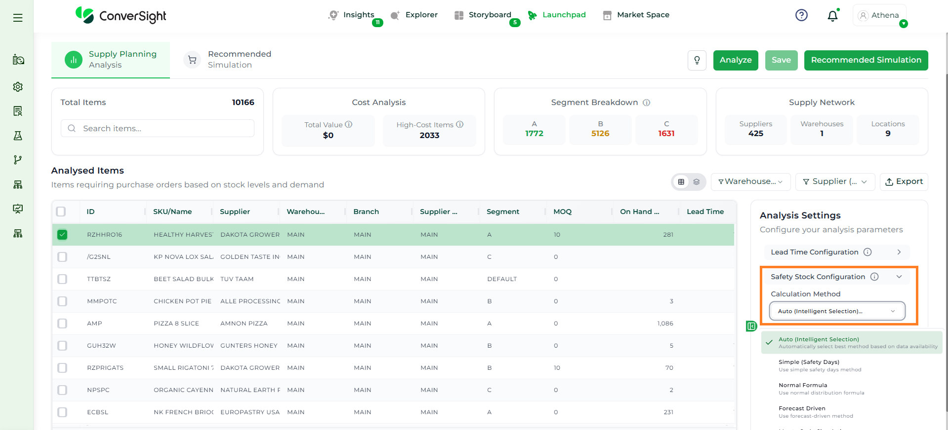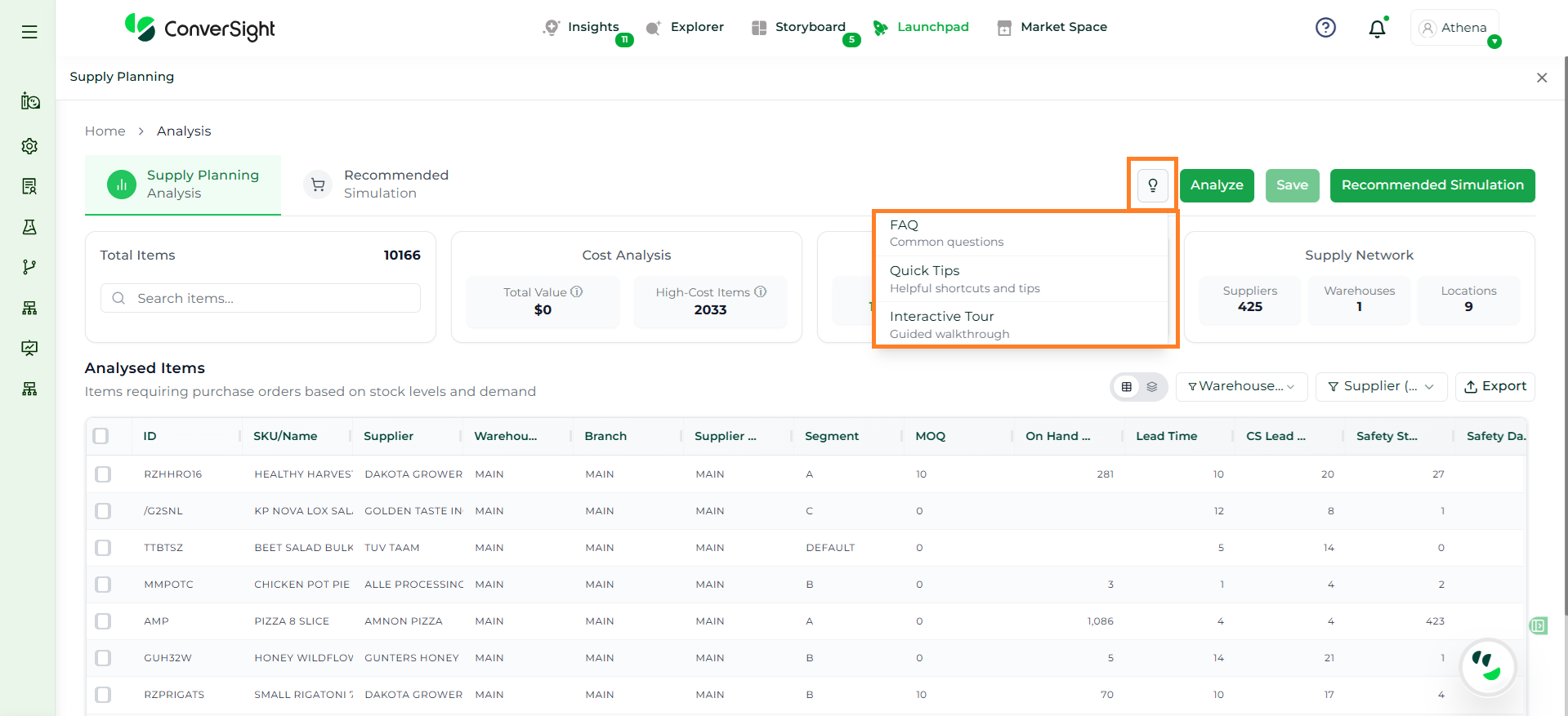 Athena highlights the underlying reasons behind each issue and suggests alternative configurations or parameter adjustments. These may include changes to MOQ, weeks of supply, review periods, or other planning constraints.