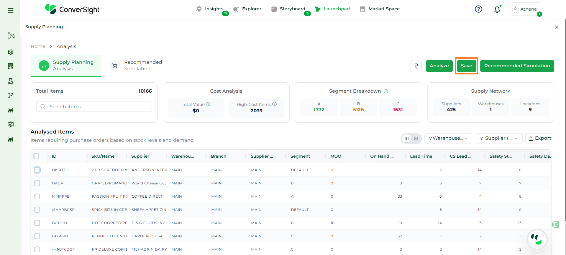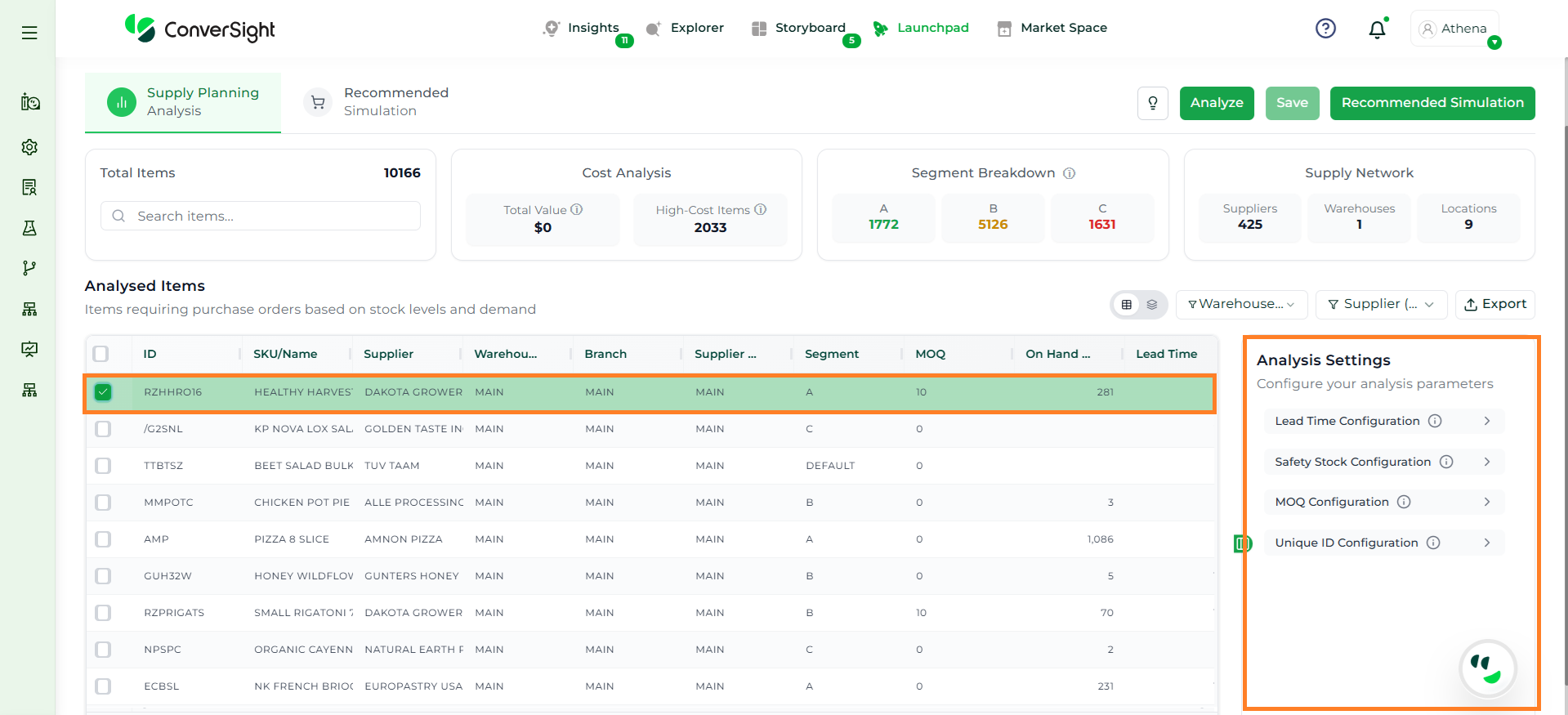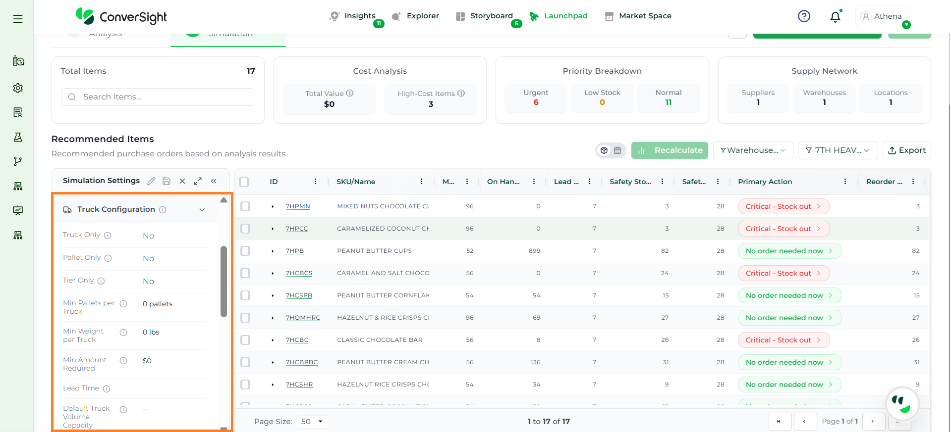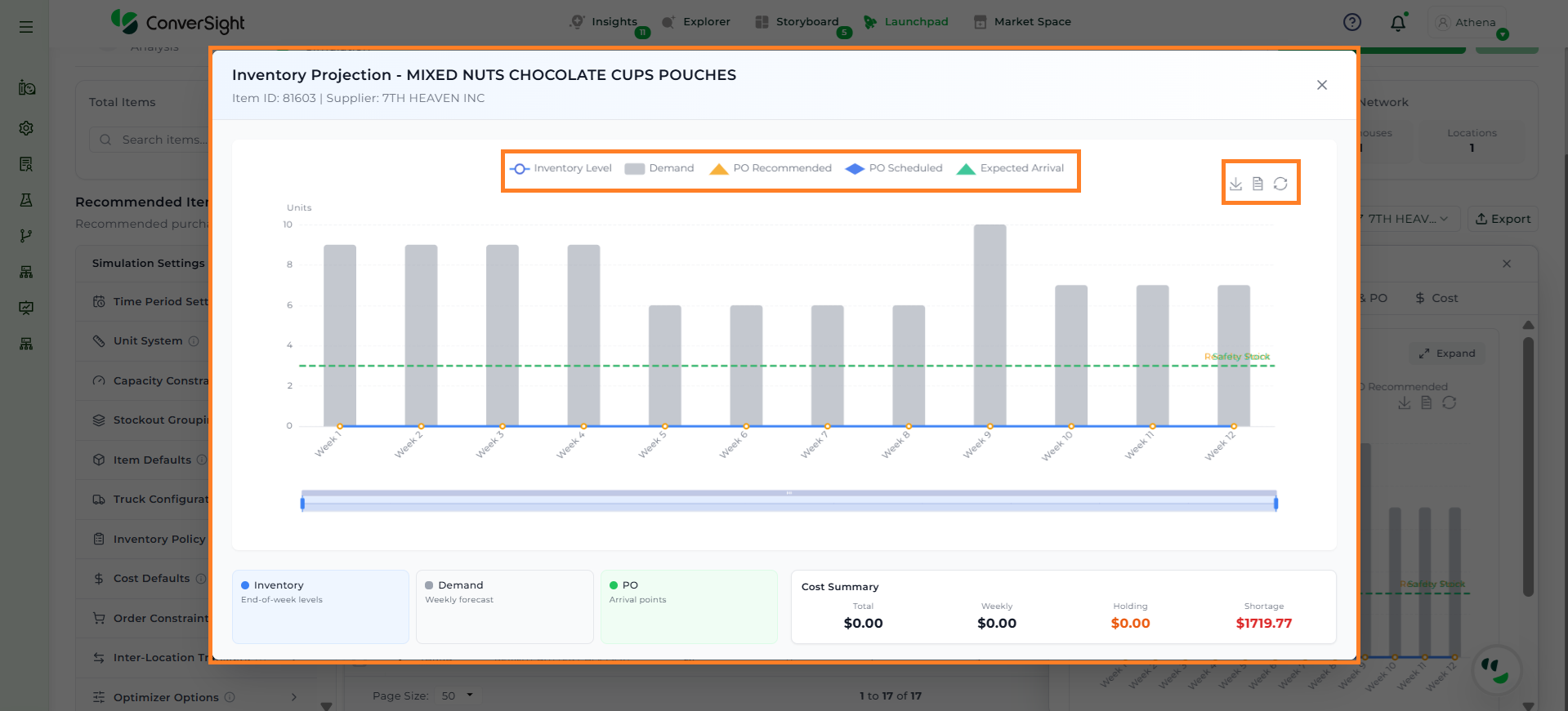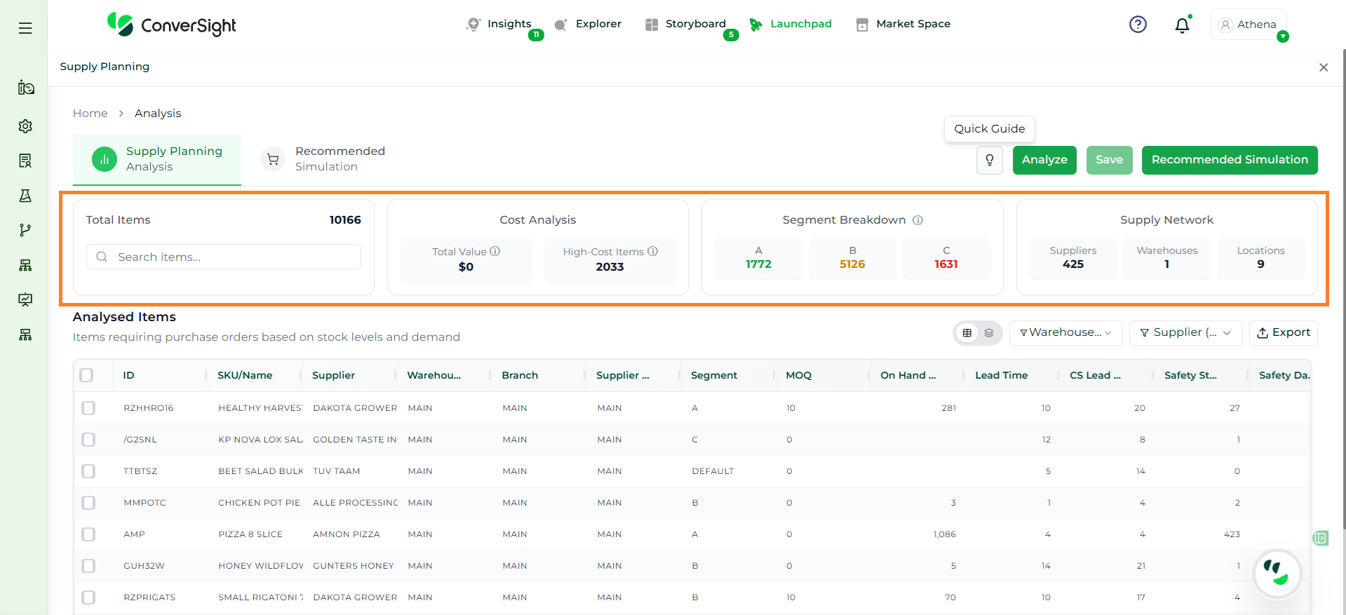 Athena highlights the underlying reasons behind each issue and suggests alternative configurations or parameter adjustments. These may include changes to MOQ, weeks of supply, review periods, or other planning constraints.