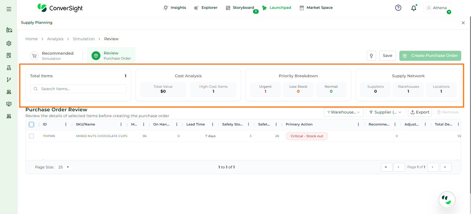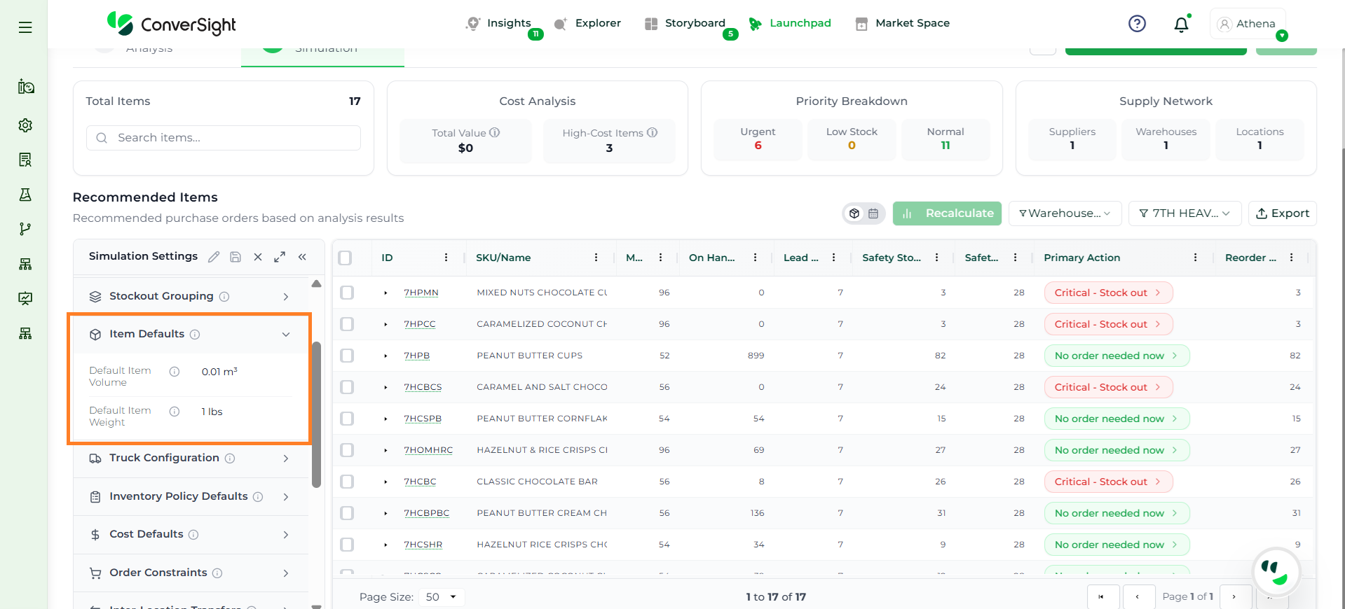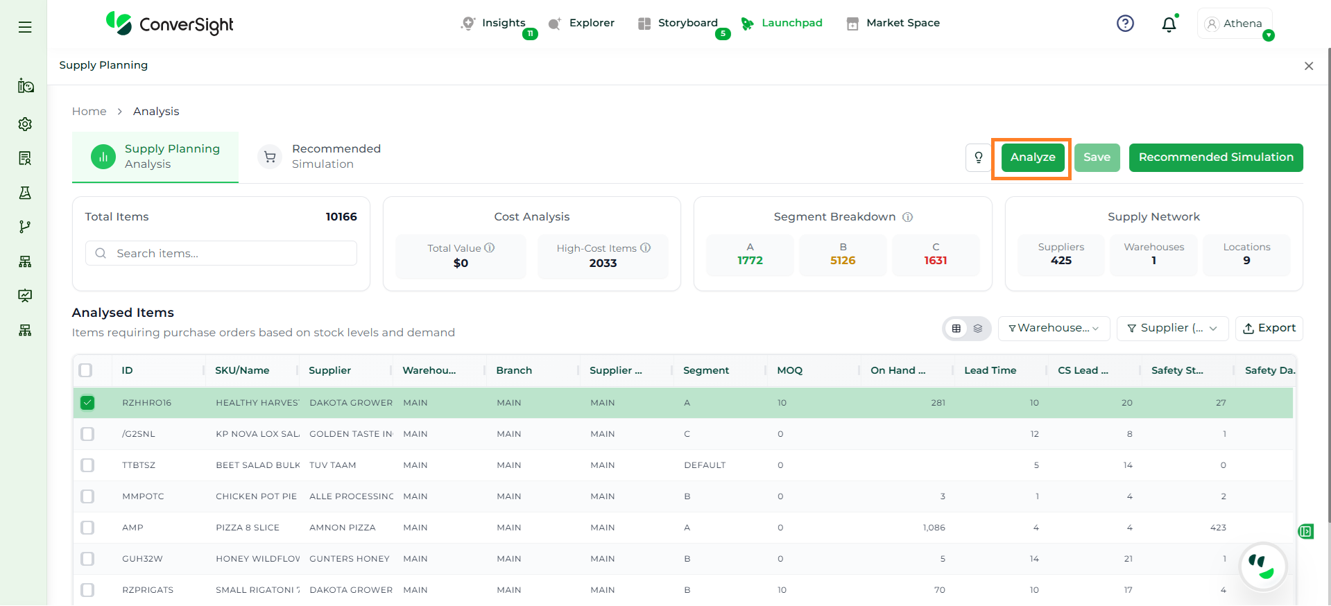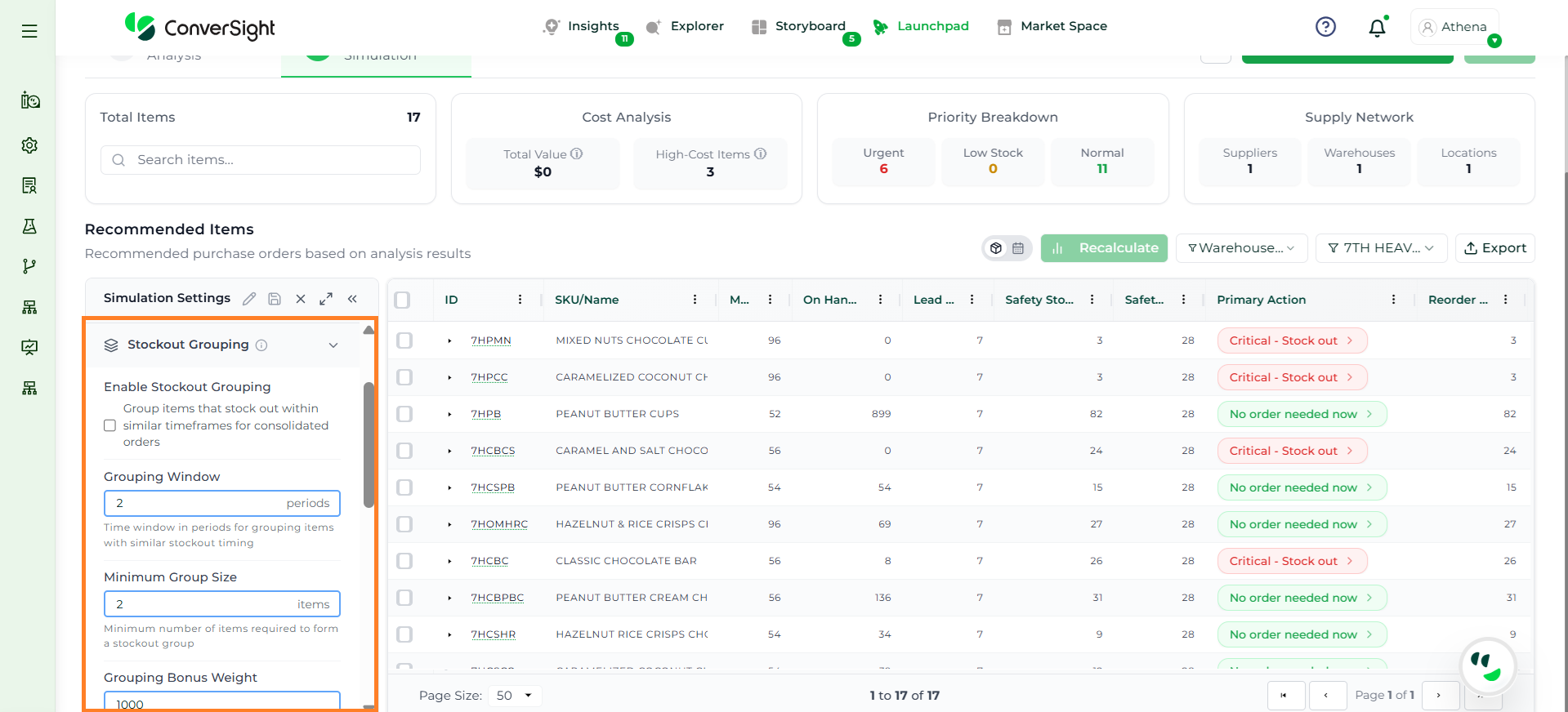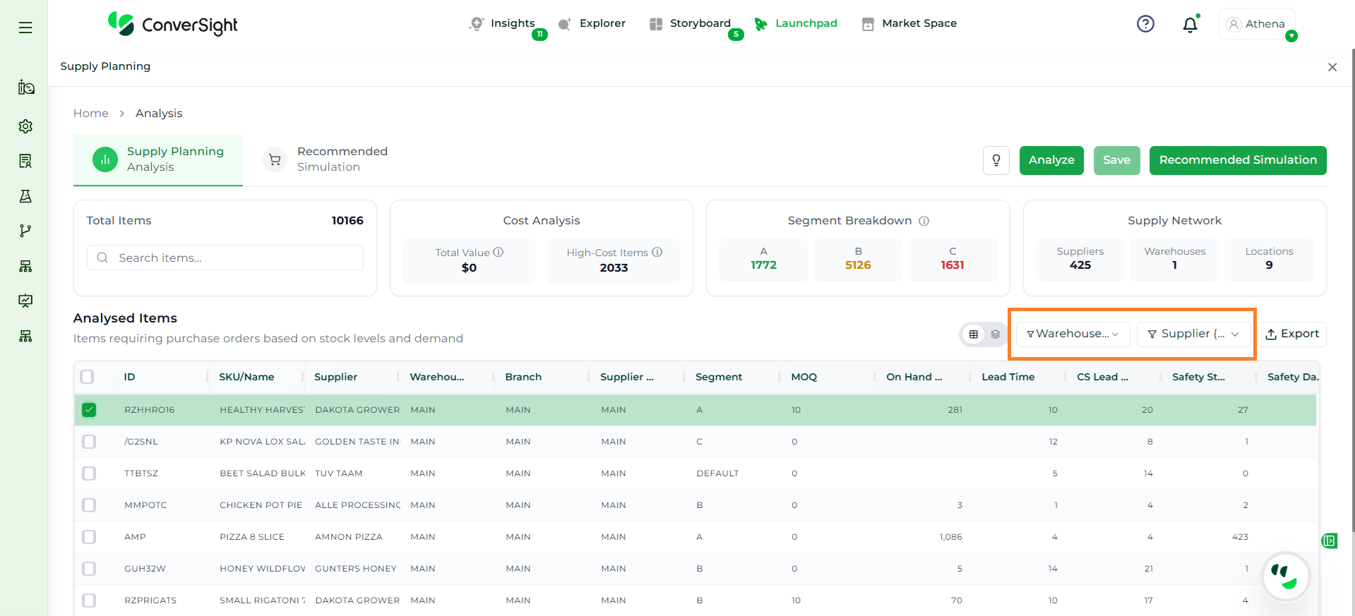 Athena highlights the underlying reasons behind each issue and suggests alternative configurations or parameter adjustments. These may include changes to MOQ, weeks of supply, review periods, or other planning constraints.