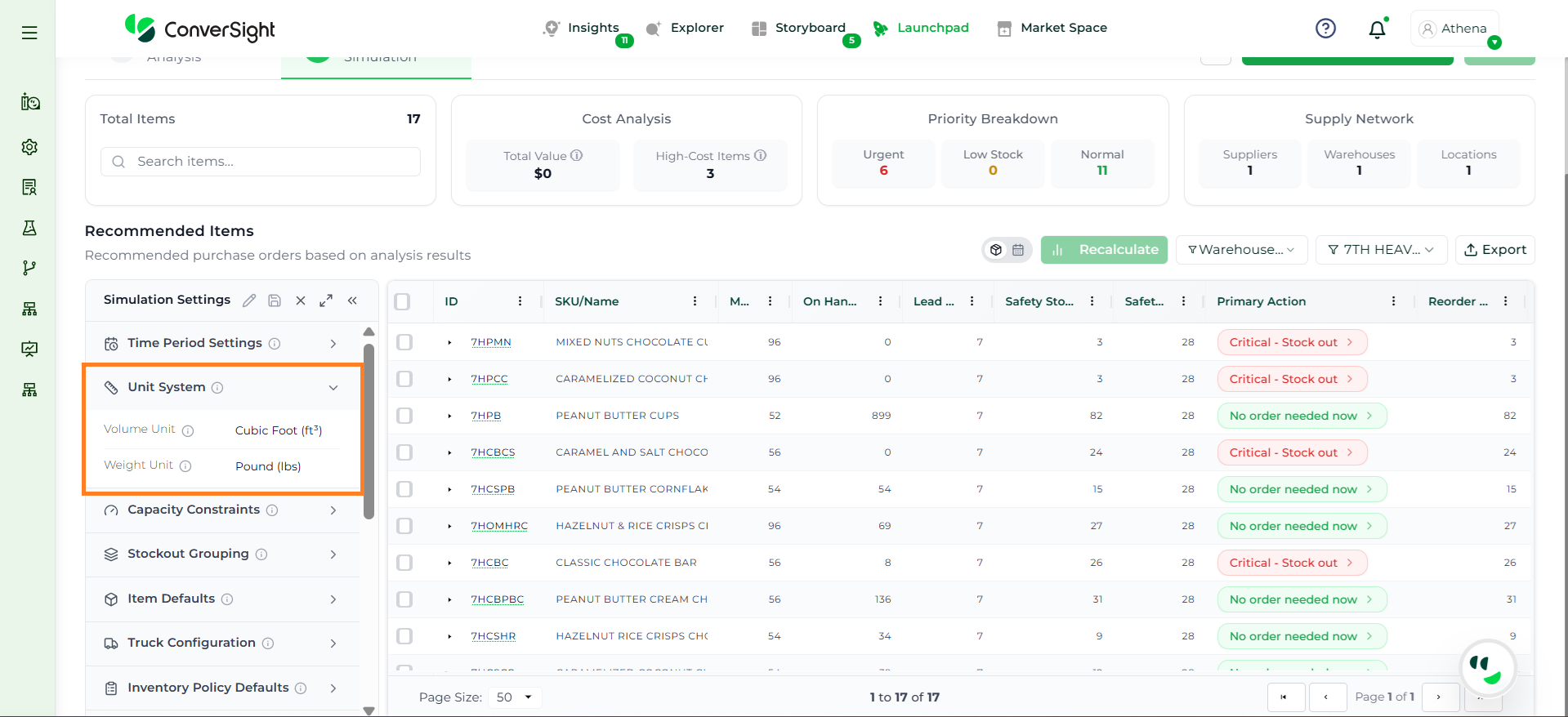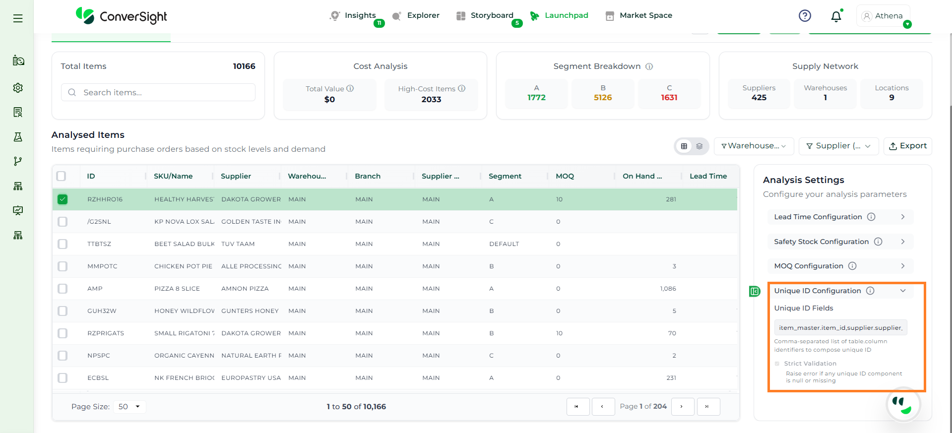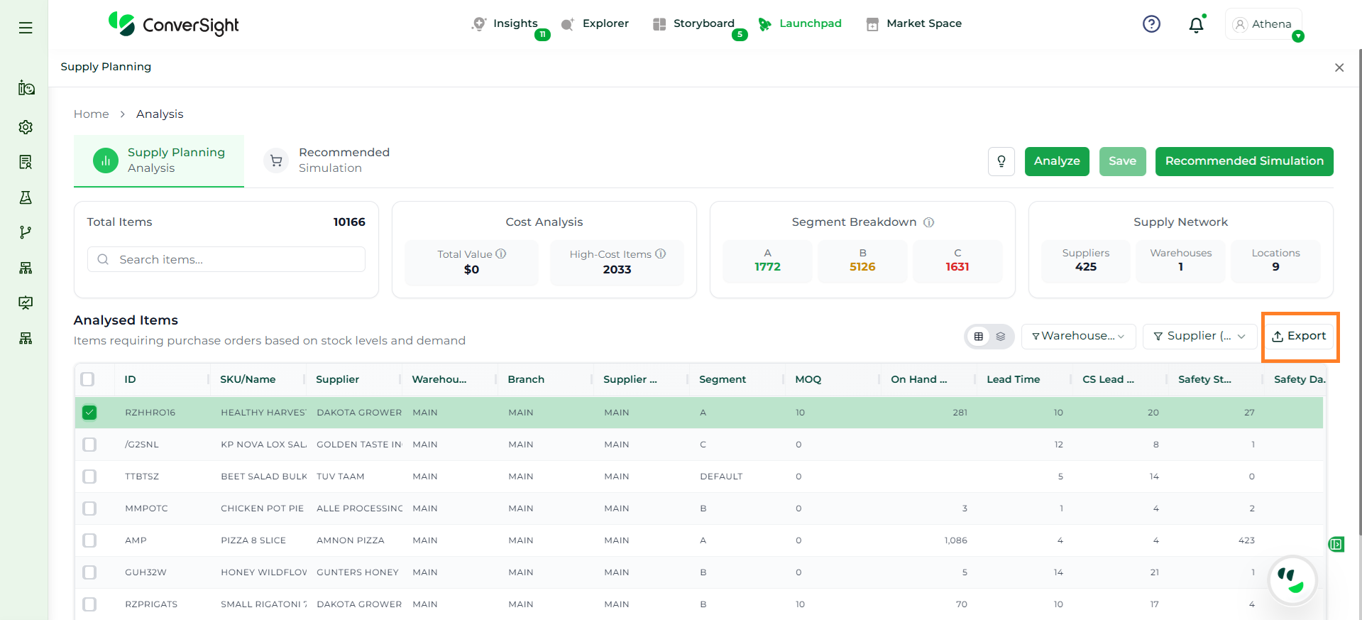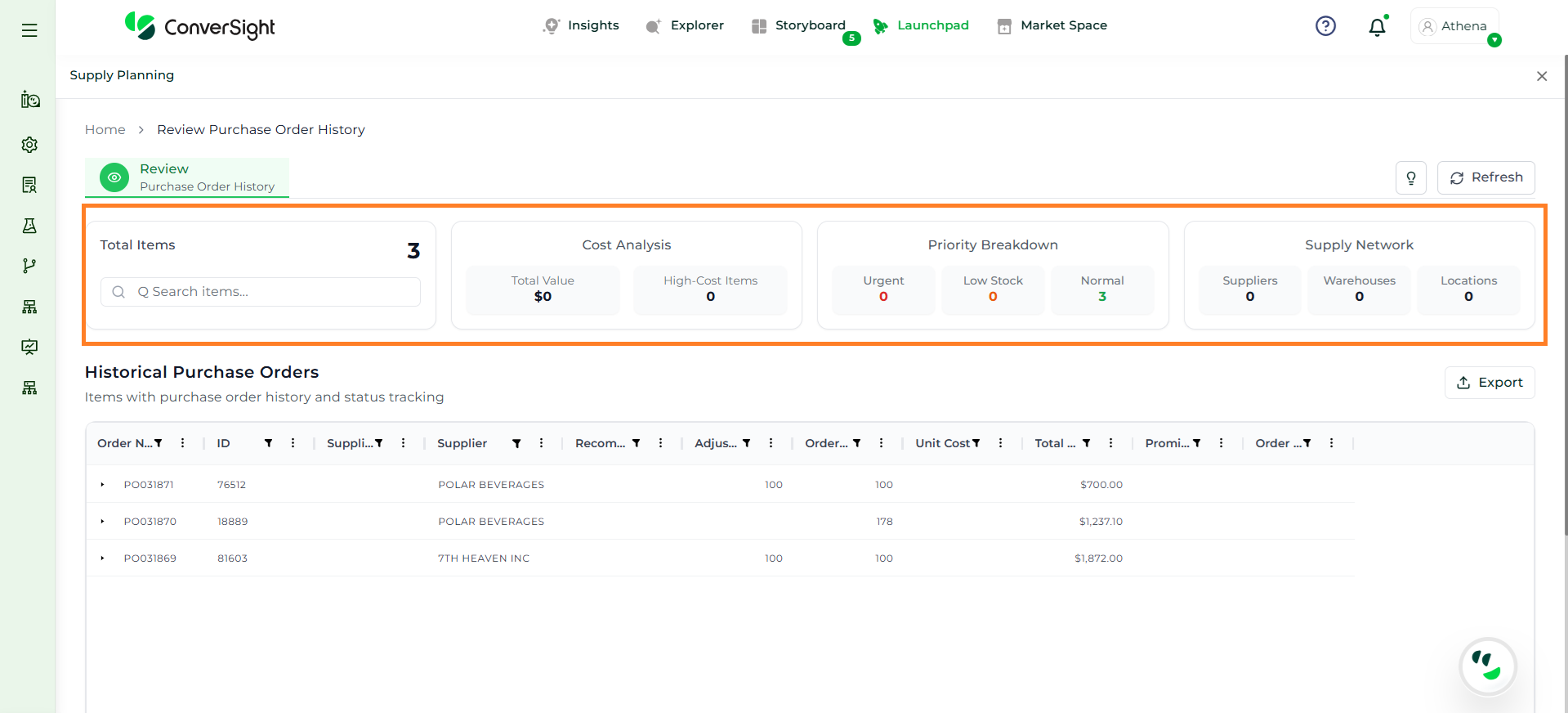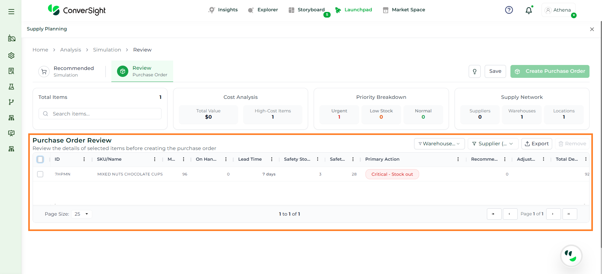 Athena highlights the underlying reasons behind each issue and suggests alternative configurations or parameter adjustments. These may include changes to MOQ, weeks of supply, review periods, or other planning constraints.