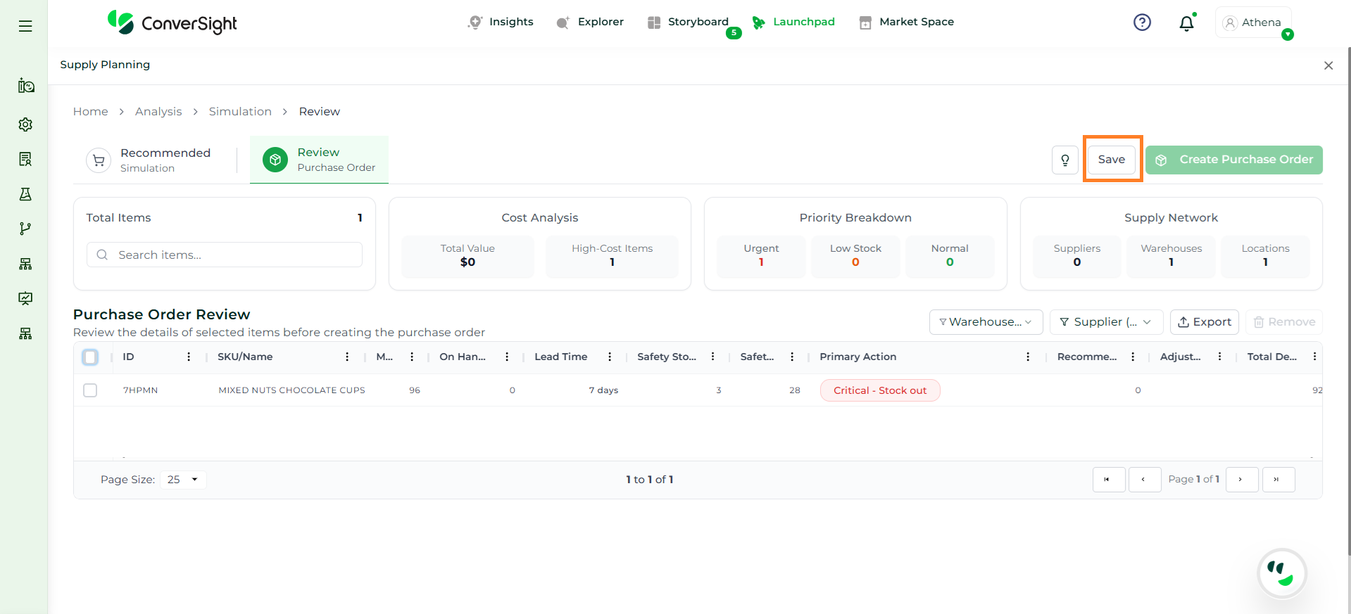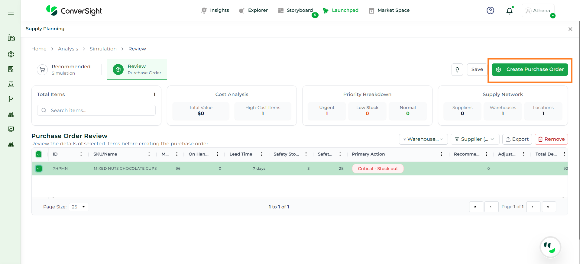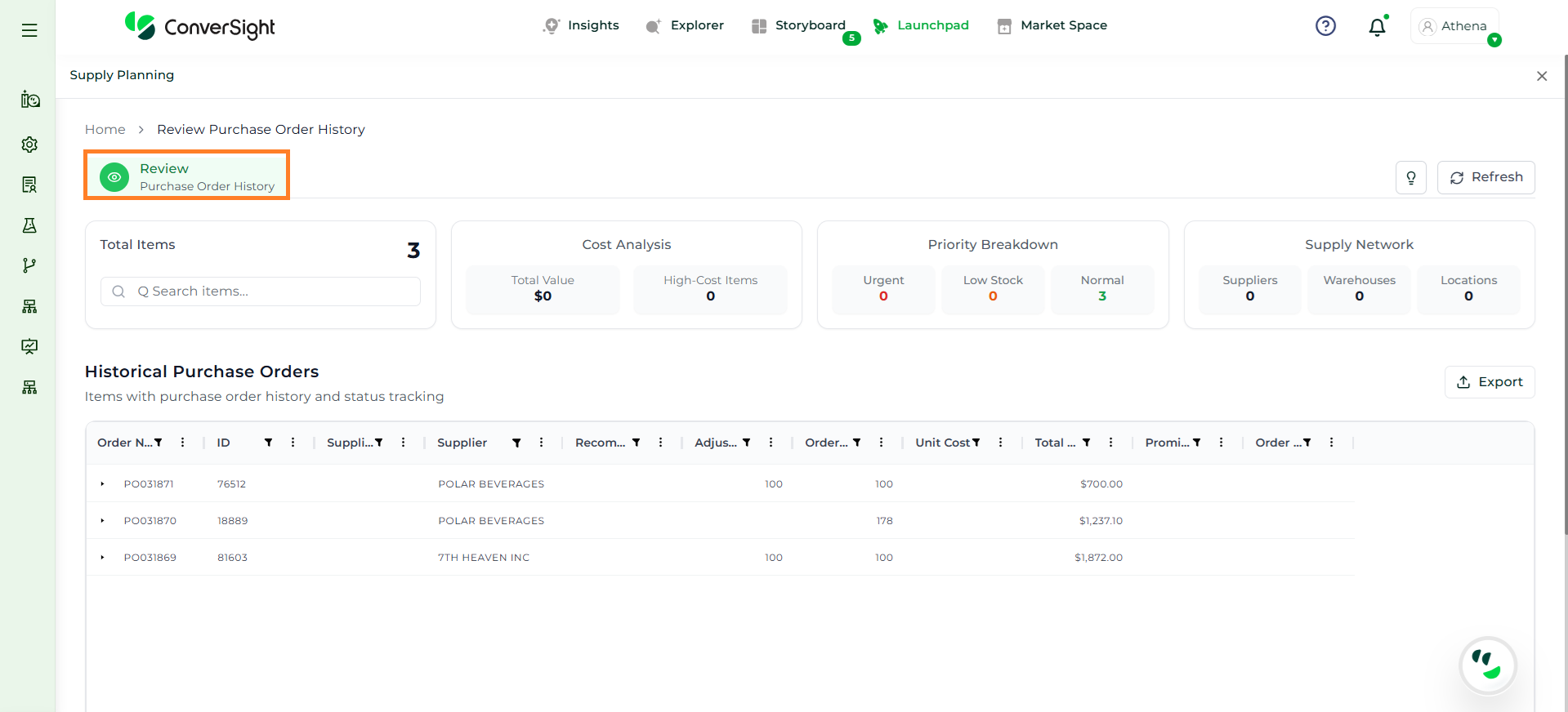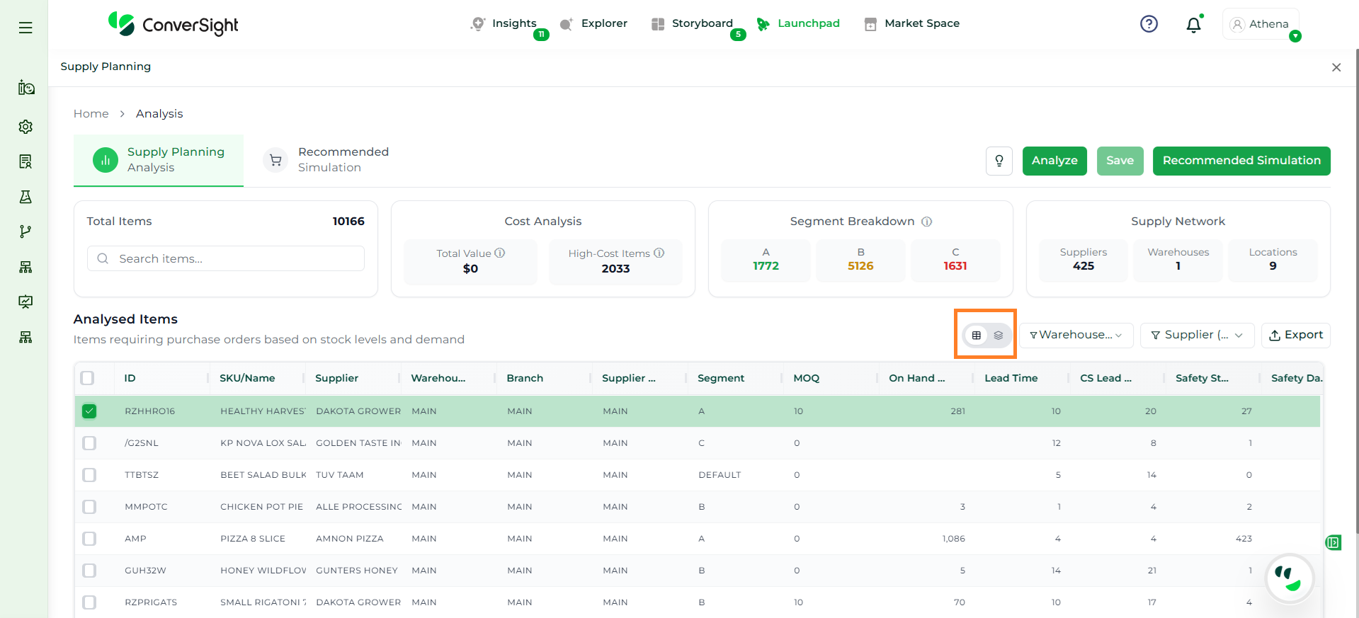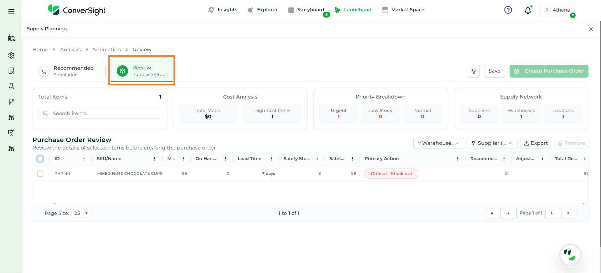 Athena highlights the underlying reasons behind each issue and suggests alternative configurations or parameter adjustments. These may include changes to MOQ, weeks of supply, review periods, or other planning constraints.