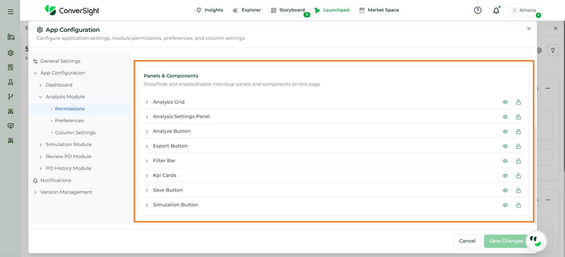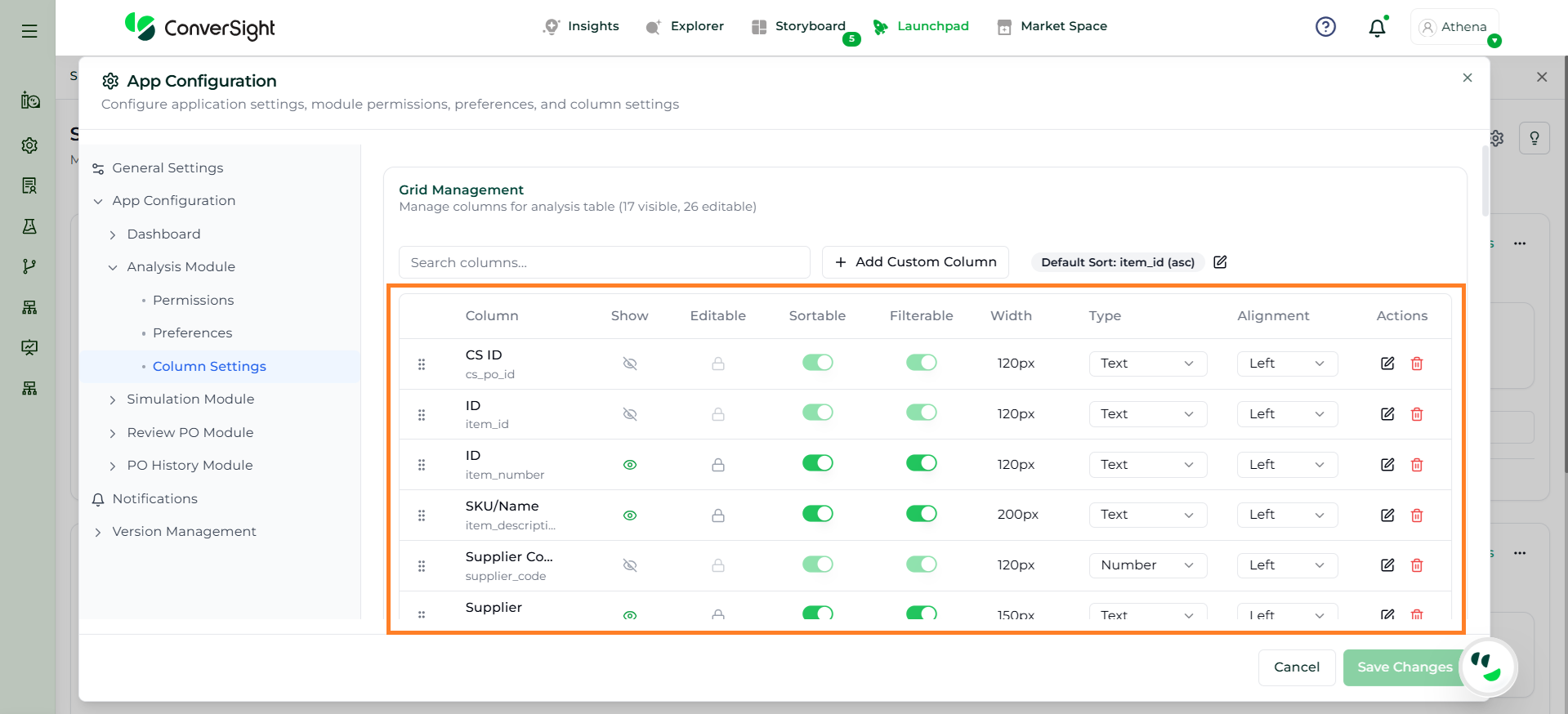 The Column Settings section allows administrators to control how columns are displayed and managed within the Analysis grid, ensuring a structured and user-friendly experience.