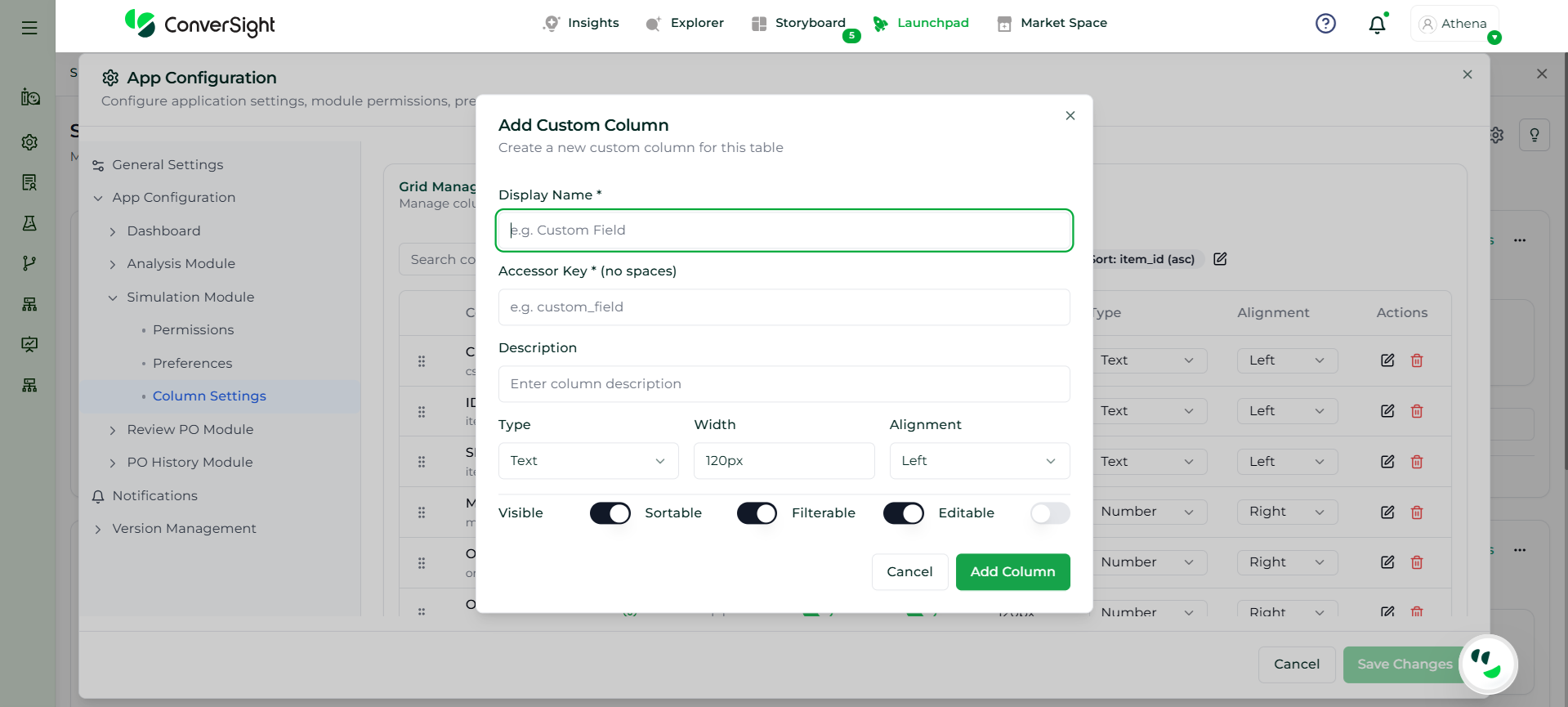 The Add Custom Column option enables users to create and configure additional fields within the simulation grid to capture business-specific data. Users must provide a Display Name, which defines how the column appears in the interface, along with an Accessor Key, which acts as a unique system identifier. An optional Description can be added for clarity.