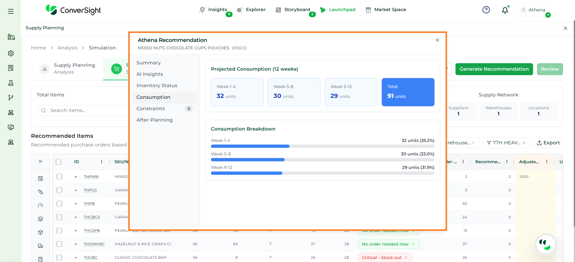Supply Planning in ConverSight helps businesses convert demand forecasts into actionable supply decisions, ensuring the right products are available at the right time. It provides a unified space to plan inventory, manage replenishment, and align supply with expected demand.It works by using forecasted demand along with factors like item priority and demand patterns to determine what to replenish, when, and in what quantity. Users can review system recommendations, apply adjustments such as safety stock, and refine plans based on business needs before finalizing them.