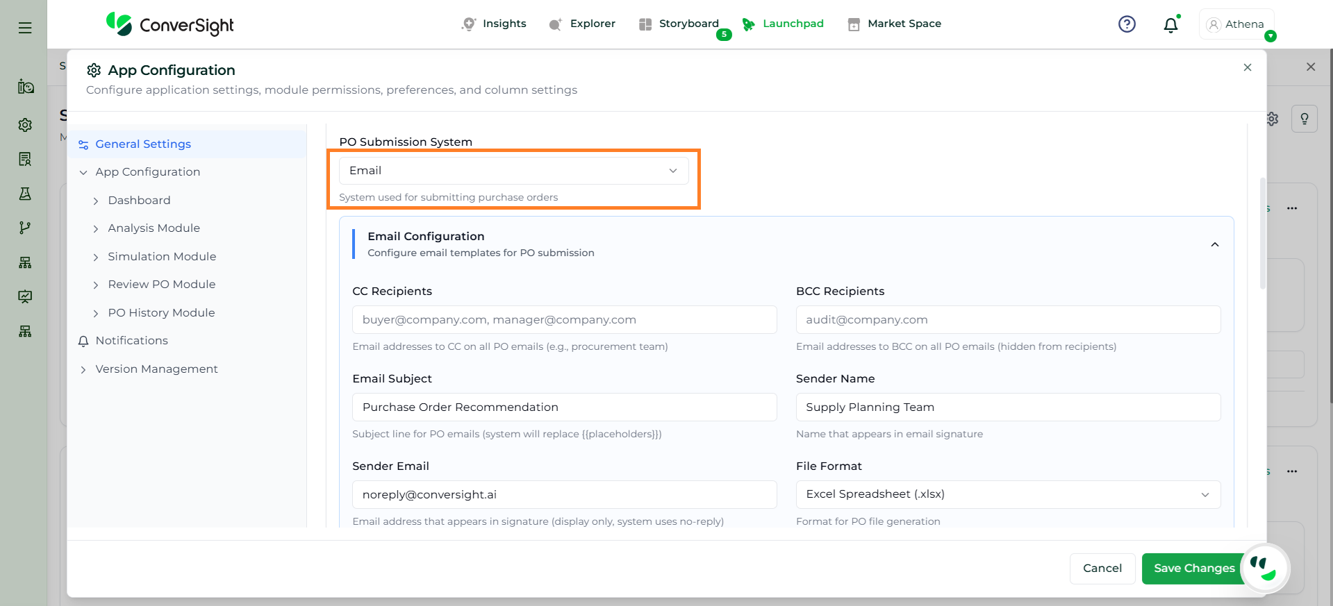 When Email is selected as the PO Submission System, the Email Configuration section is enabled, allowing users to fully define how purchase orders are communicated. This section provides complete control over recipients, email structure, attachment format, and delivery behavior.