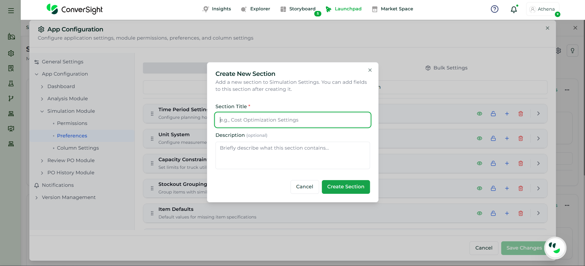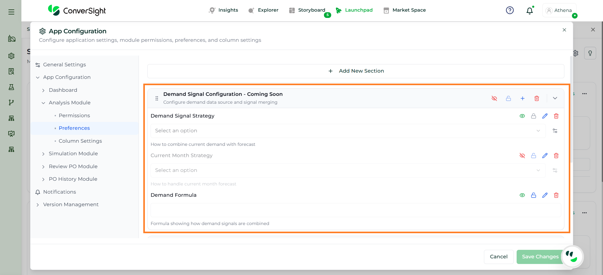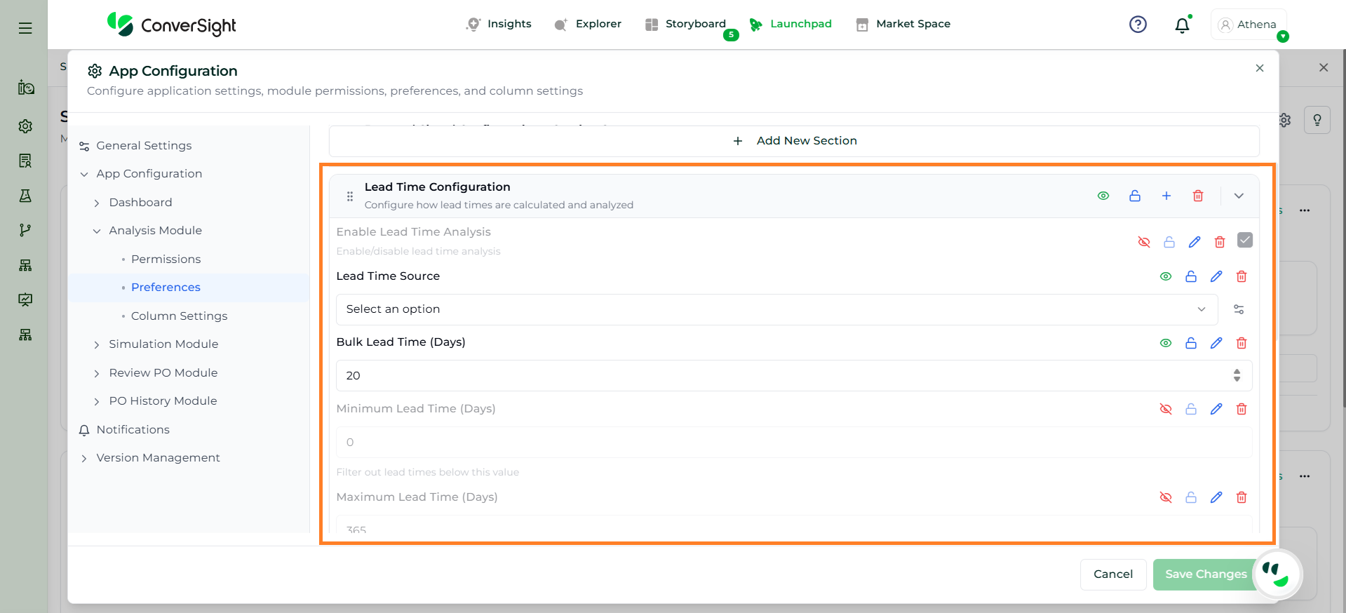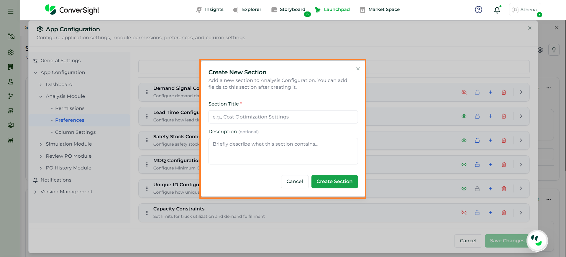 The Add New Section option allows users to create a custom configuration section within the Analysis Preferences. This helps organize additional planning parameters or group related settings based on business requirements.
