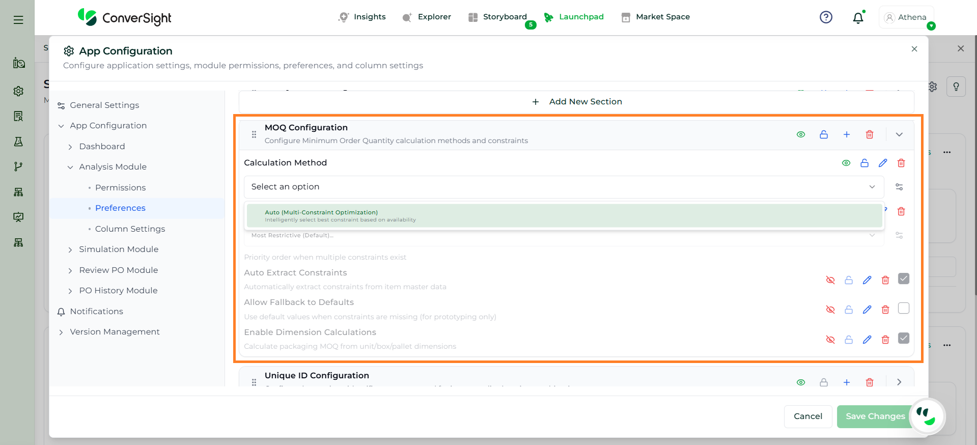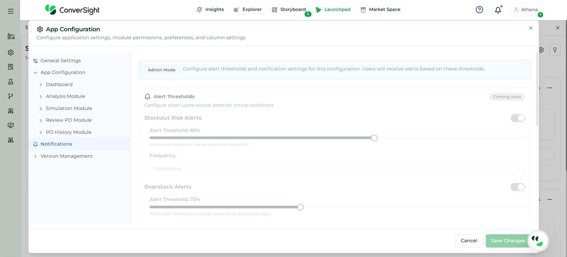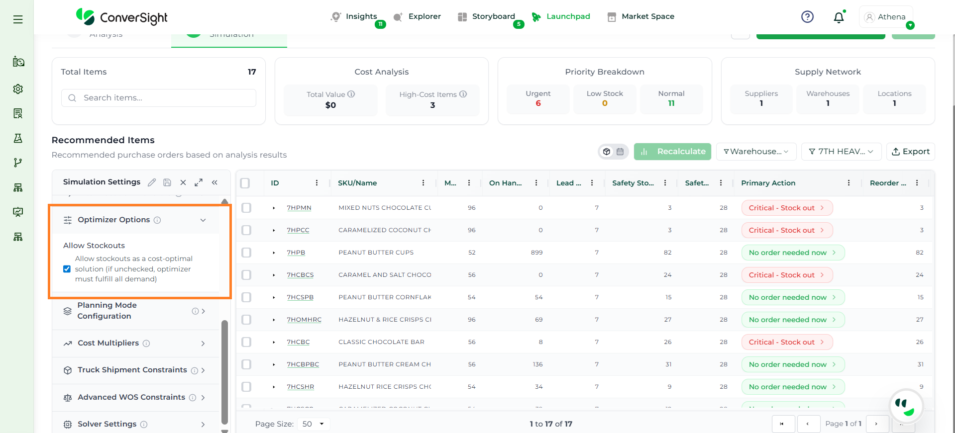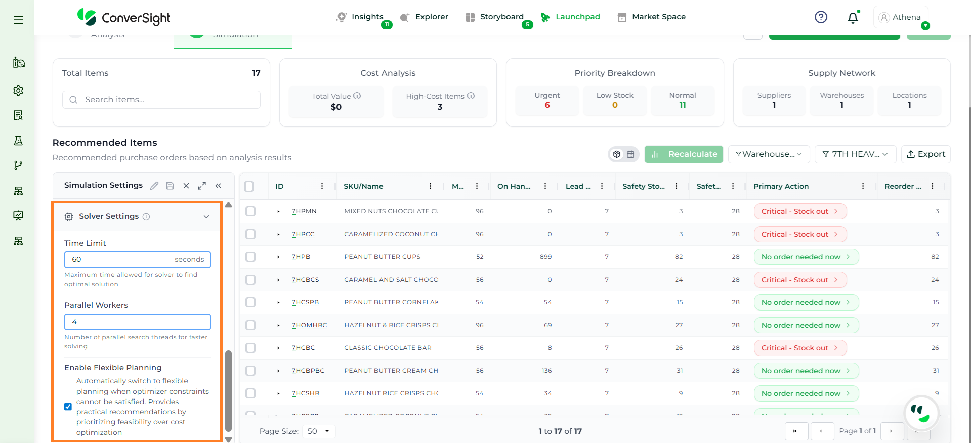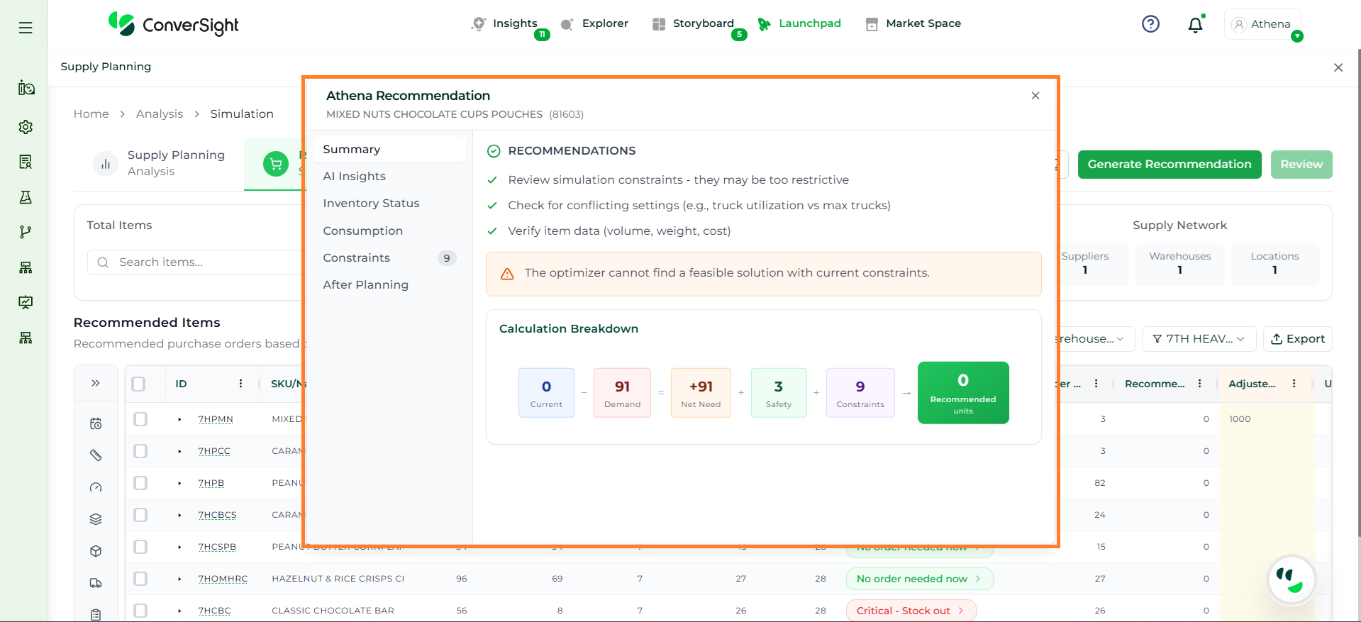 Athena evaluates key inputs such as inventory levels, demand over the planning horizon, lead time, and constraints to determine if a valid solution can be achieved. If conflicts exist, the system clearly explains the reasons, such as incompatible constraints or insufficient inventory.