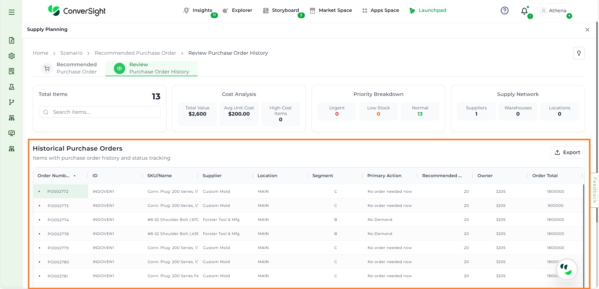 The Review Purchase Order History displays a list of purchase orders along with key details such as Order Number, Supplier Code, Supplier, Recommended Order, Owner, and Order Total, allowing users to easily track and review order information.