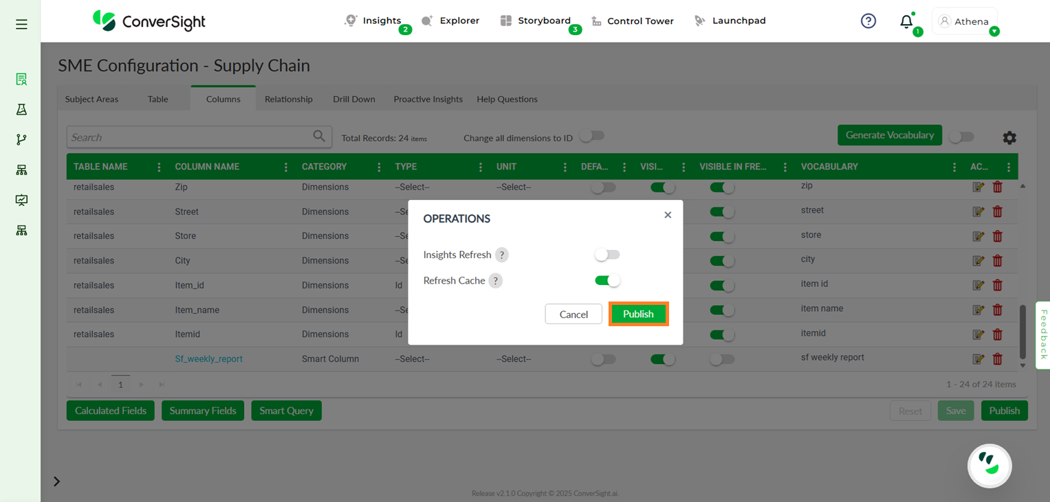Step 13: Once you click Publish, a popup appears asking whether you want to refresh insights or refresh the cache. Select the desired option and click Publish again. This will ensure that the created Summary Fields is applied to the dataset and any changes made to the dataset are reflected.