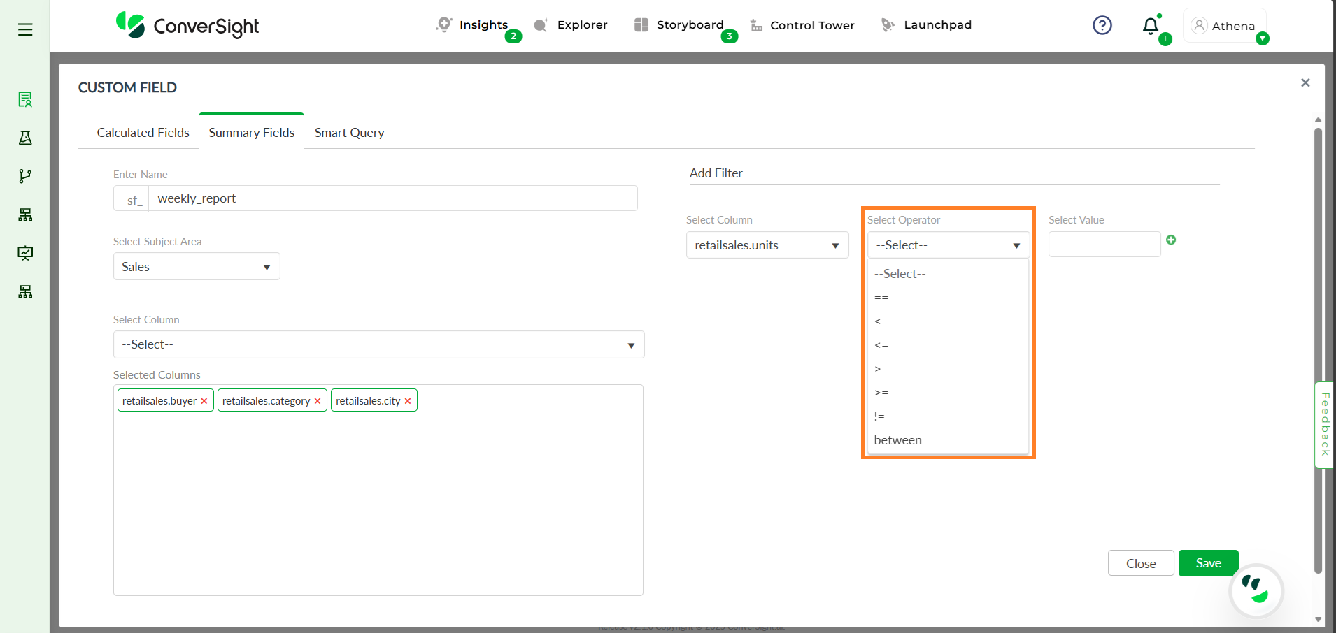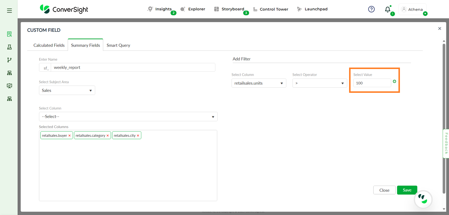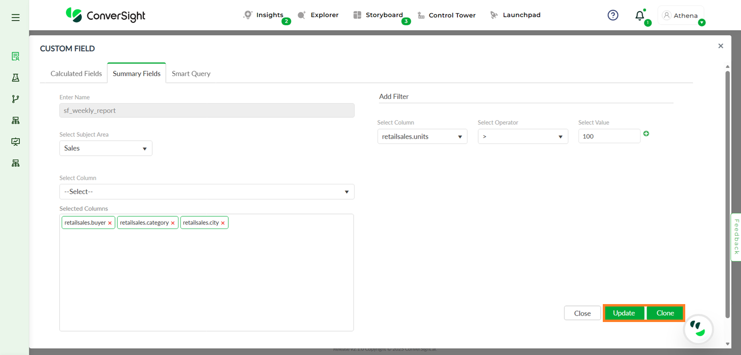 Summary Fields are used to create Smart Columns that serve as a crucial feature for users requiring report generation or validation of inputs across multiple columns in a dataset. However, with the utilization of Smart Columns, users can conveniently consolidate necessary columns, name the query and save it for future use. This functionality streamlines the retrieval of grouped columns in Athena, significantly saving time and effort. The created Smart Column will exclusively exist within the platform and won’t be replicated in the actual database.